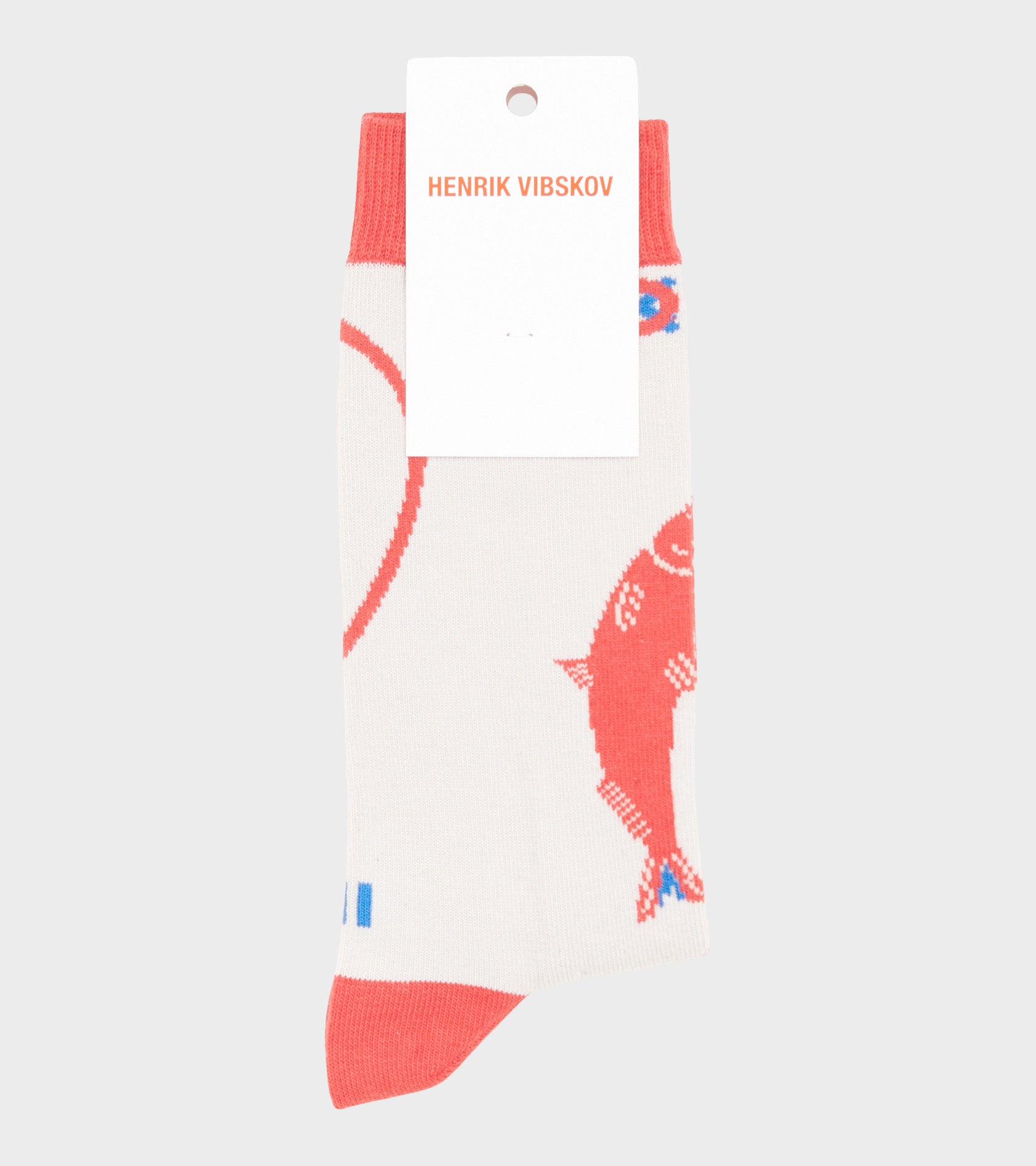 Grå og røde strømper med fisk på fra Henrik Vibskov.