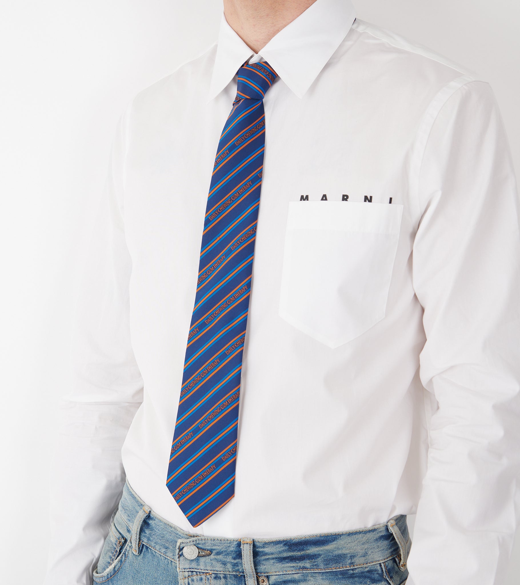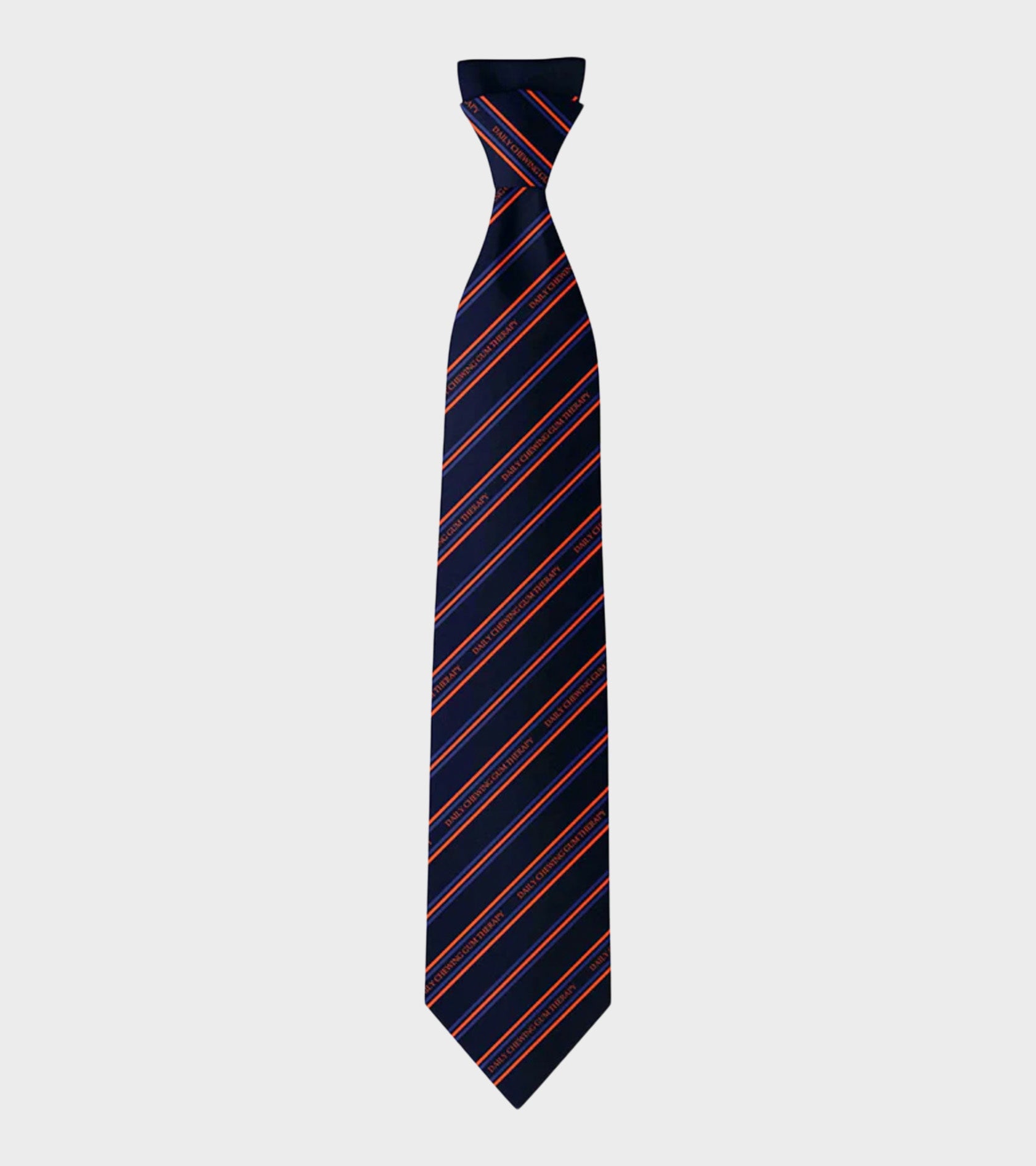 Stribet slips fra Henrik Vibskov. Dette slips har navy, blå og orange striber. Mellem striberne er 'Daily Chewing Gum Therapy' broderet - hvilket er navnet på kollektionen.