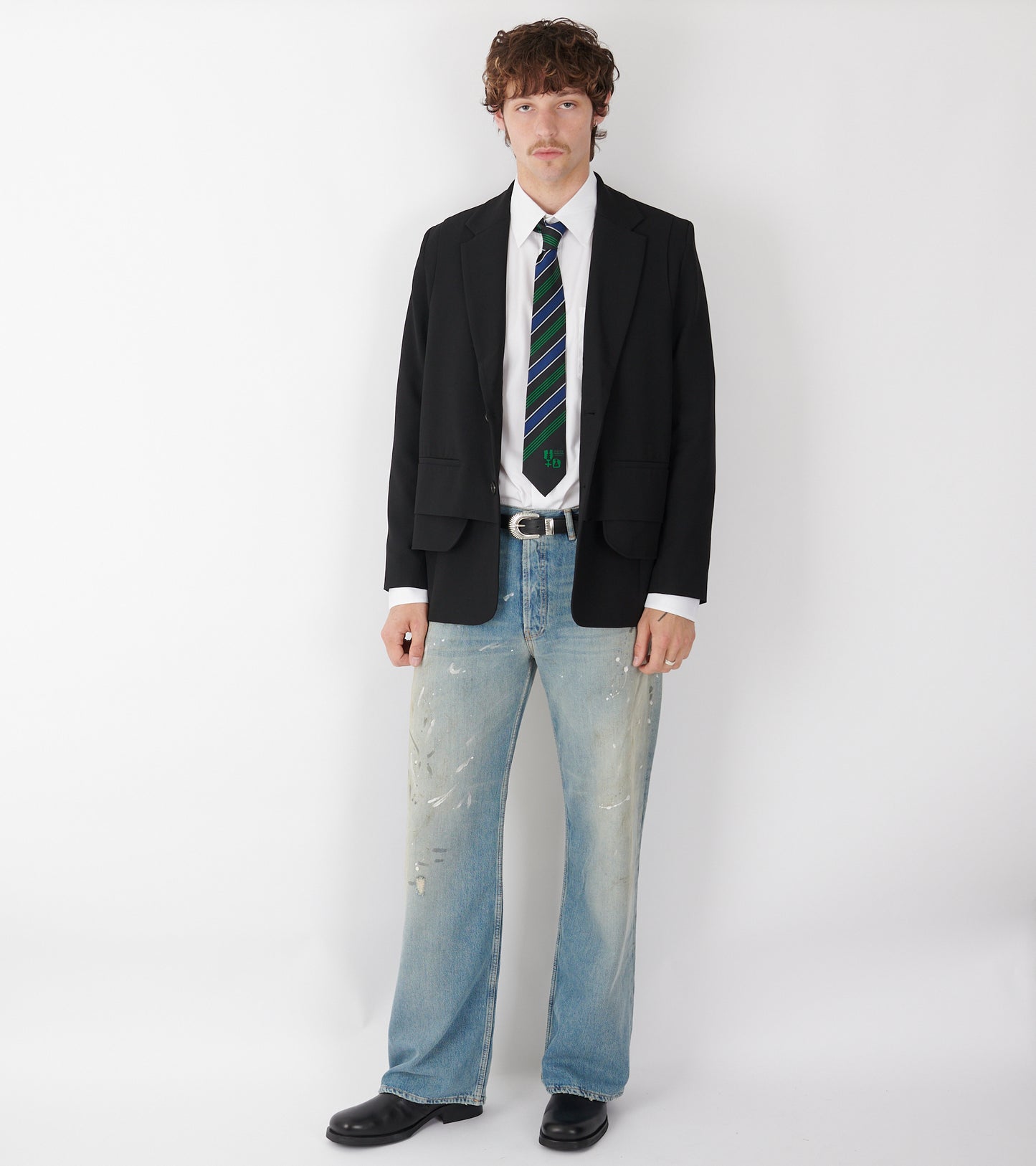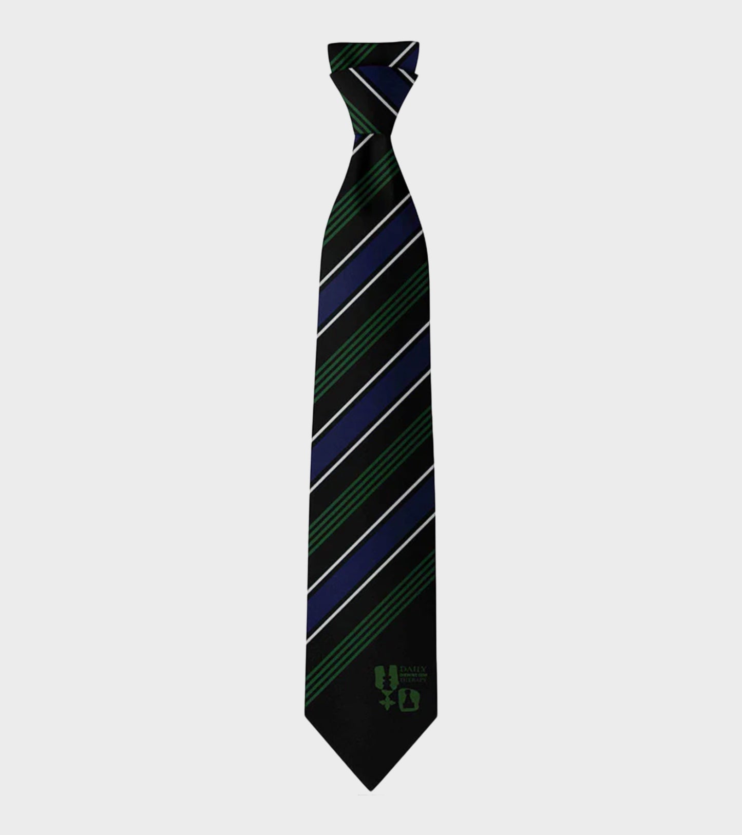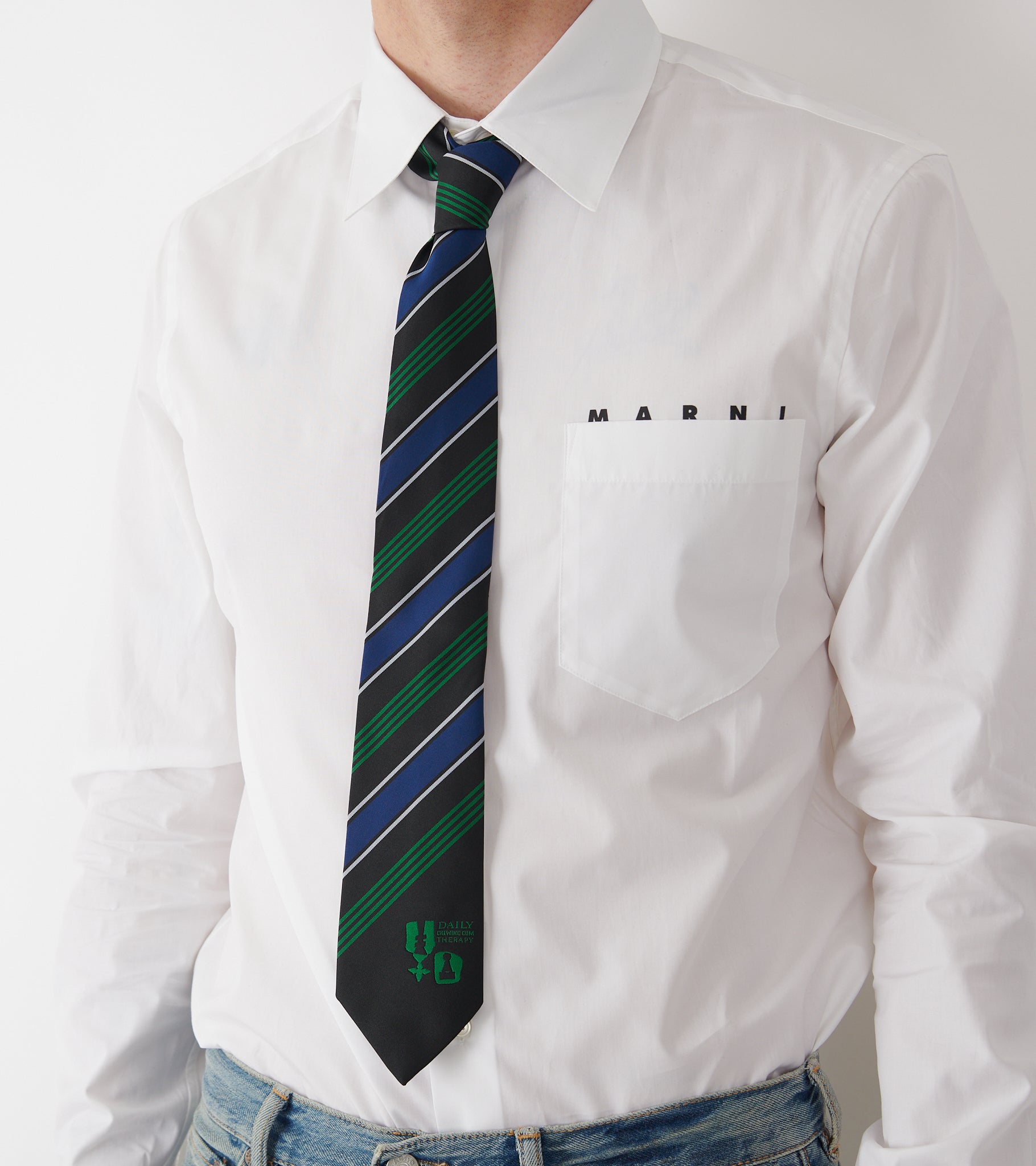 Stribet slips fra Henrik Vibskov. Dette slips har sorte, navy, grønne og hvide striber. Nederst er 'Daily Chewing Gum Therapy' broderet - hvilket er navnet på kollektionen.