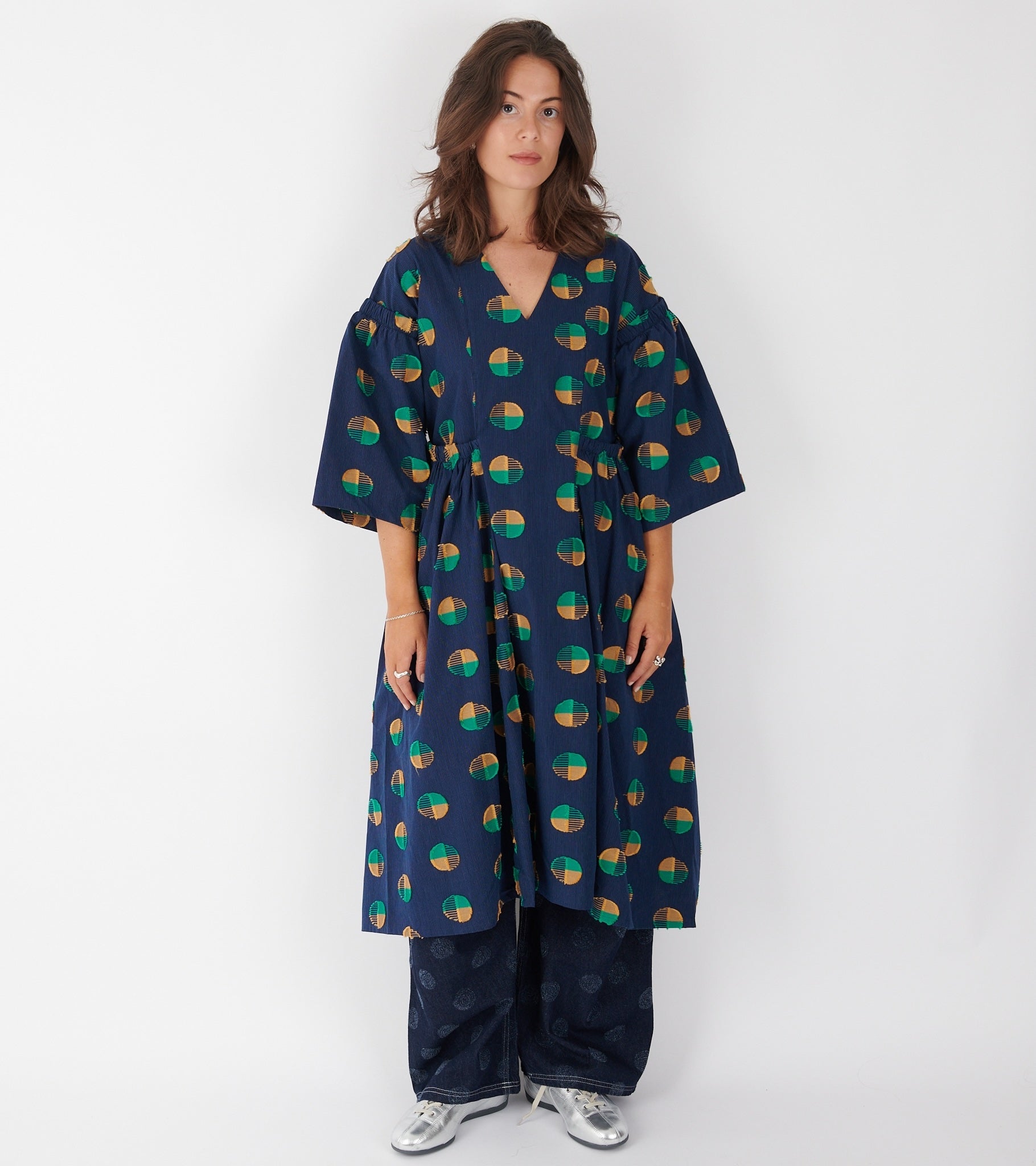 Mørkeblå kjole med tynde striber og et vævet orange/grønt mønster fra Henrik Vibskov. Kjolen har en v-udskæring på både front og ryg, en lomme i hver side, brede cropped ærmer samt flæsedetaljer ved skuldrene.