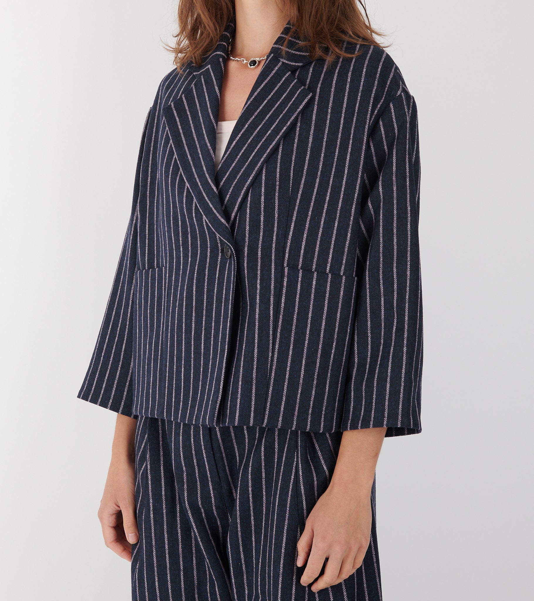 Mørkeblå blazer i uld med rosa striber fra Henrik Vibskov.