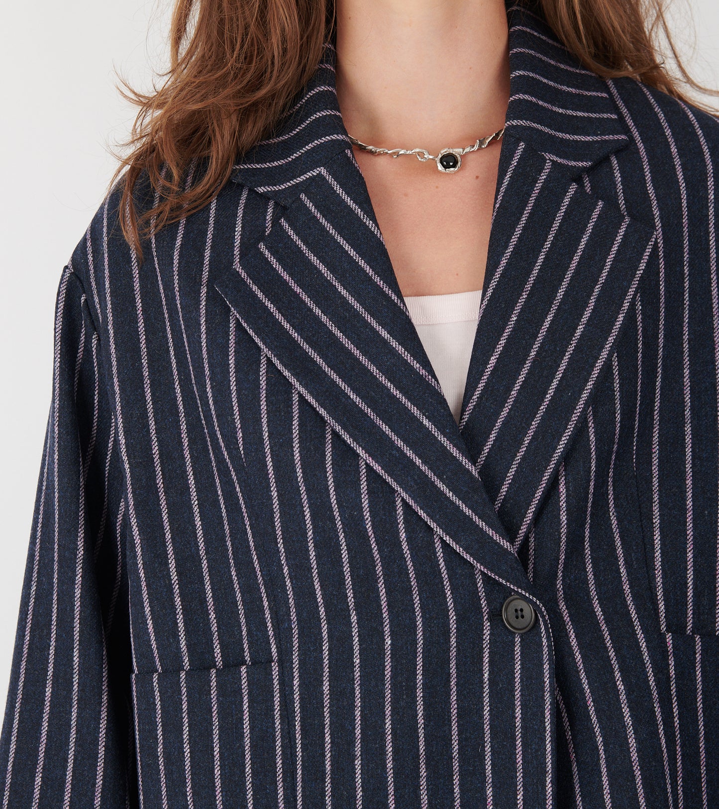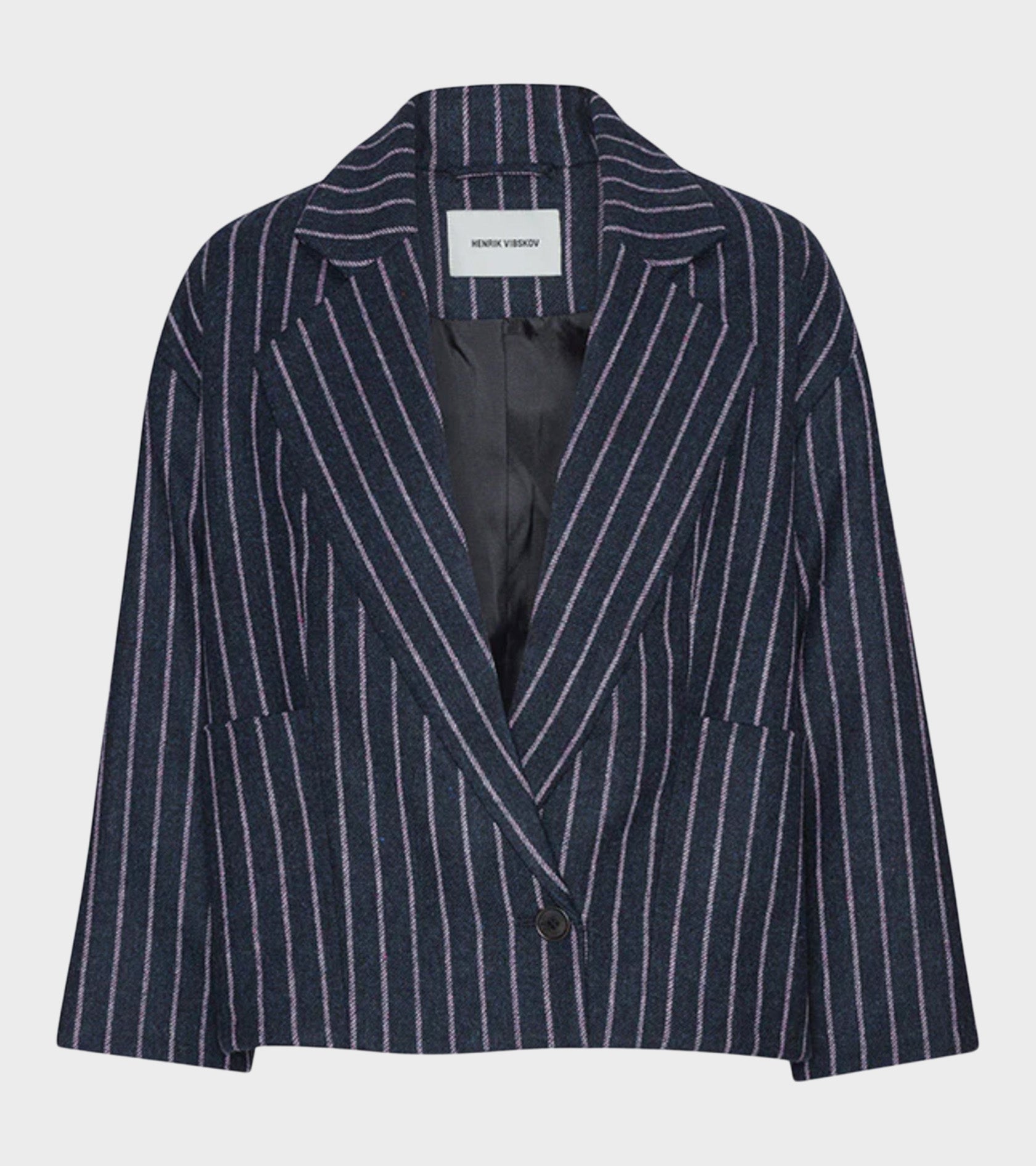 Mørkeblå blazer i uld med rosa striber fra Henrik Vibskov. Blazeren har en klassisk revers-krave, en knaplukning med én enkelt knap samt to lommer på fronten.