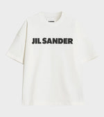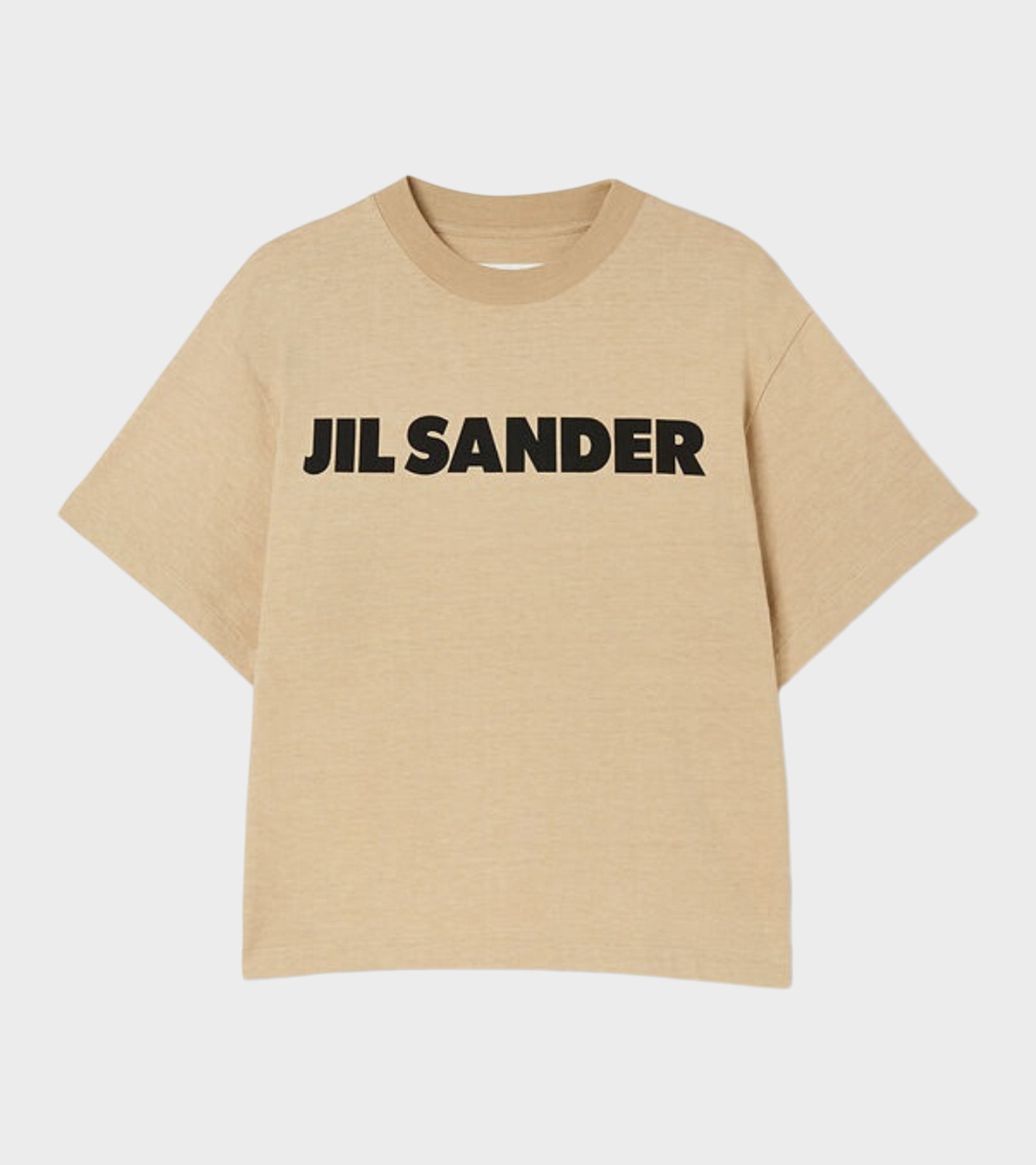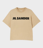 Beige t-shirt i en let stiv bomuldskvalitet fra Jil Sander. T-shirten har en rund hals og et printet sort logo på fronten.