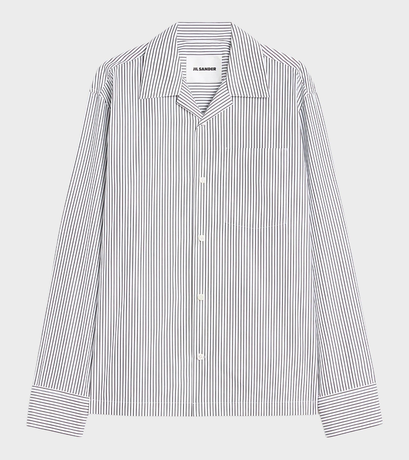 Hvid skjorte med sorte striber fra Jil Sander. Skjorten har en åben krave, en knaplukning og en brystlomme på fronten.
