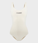 Badedragt i en knækket hvid nuance fra Jil Sander. Denne badedragt har et logo printet på fronten og en dyb rund udskæring bagpå ryggen.