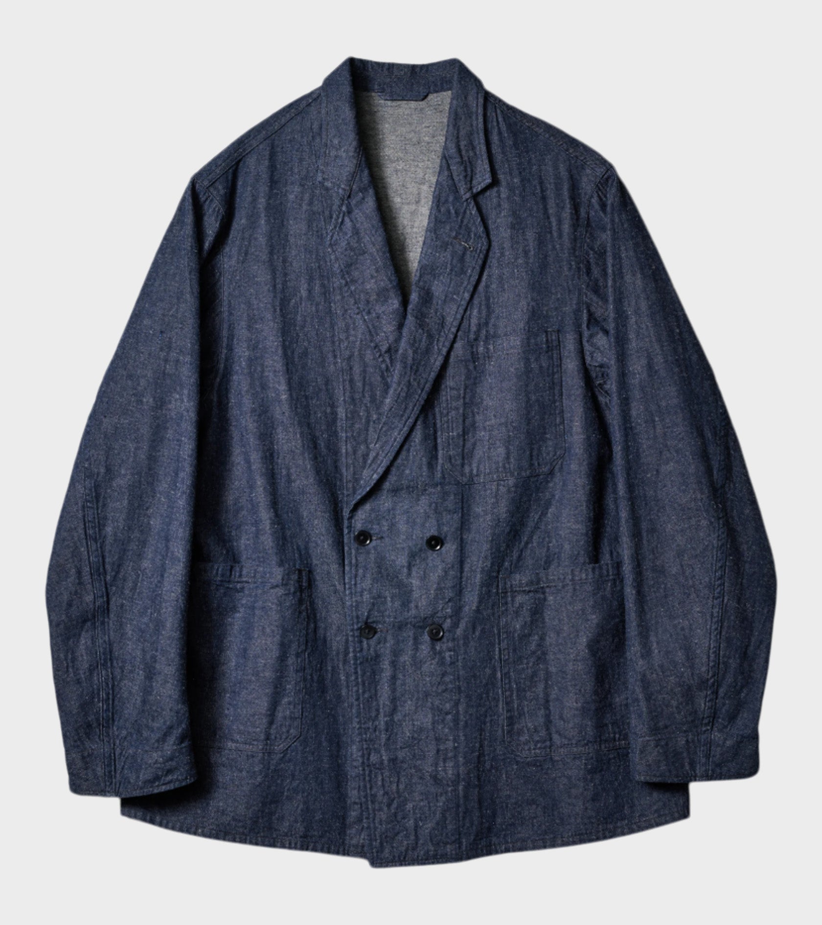 Blazer i bomuldsdenim fra Kaptain Sunshine. Blazeren har en klassisk reverskrave, tre lommer på fronten samt en dobbelt knaplukning.