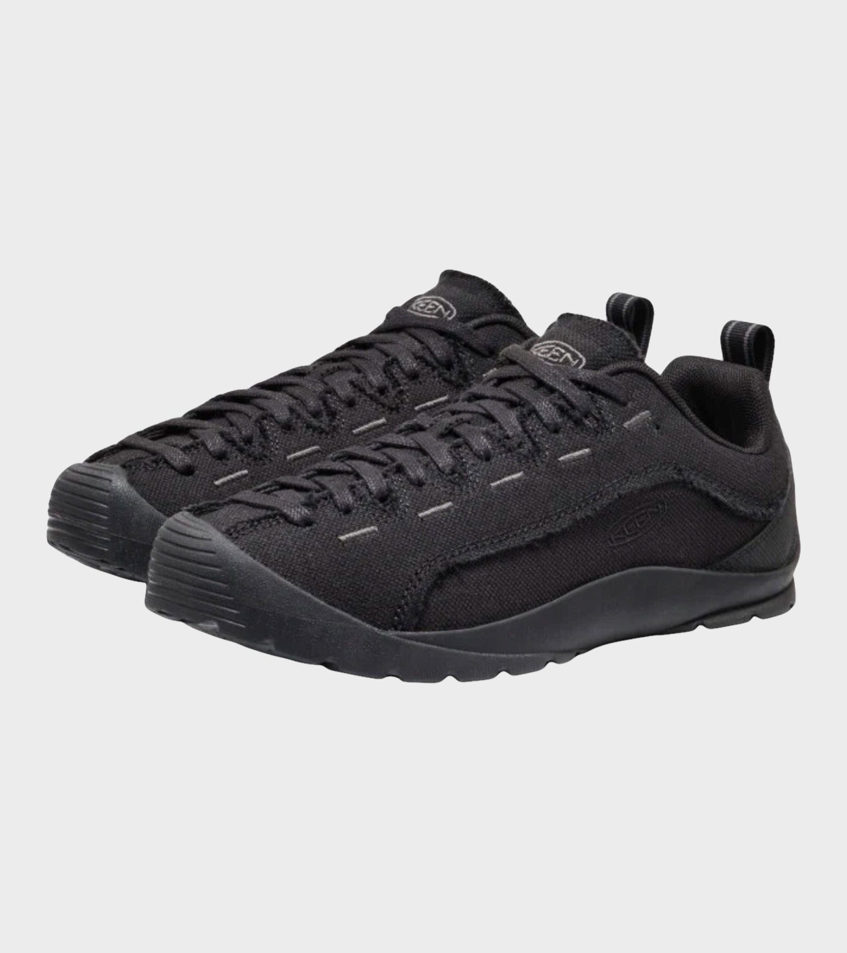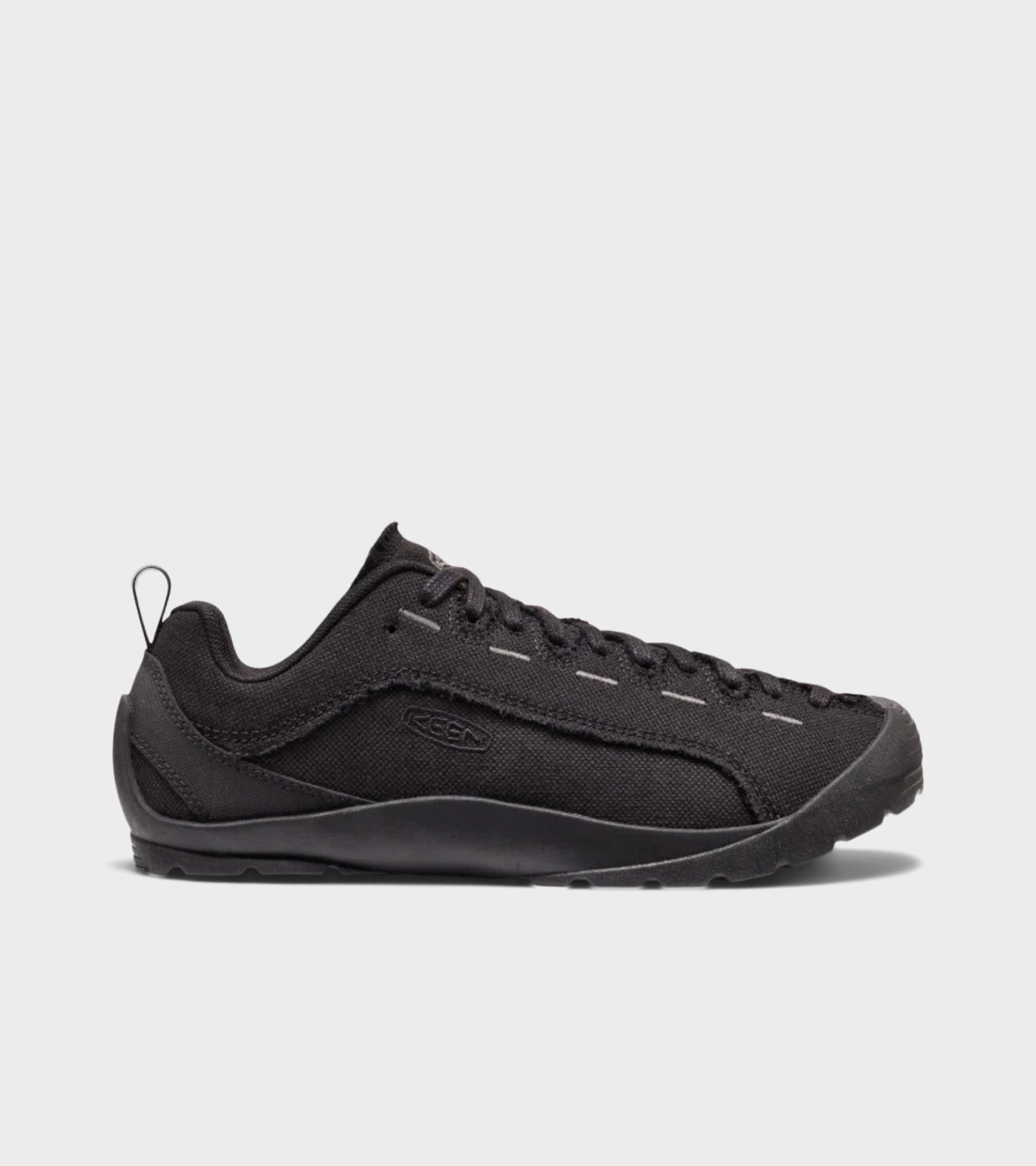 Klatre-inspirerede sneakers i sort kanvas fra Keen. Jasper har en fodseng i kork og latex, som former sig efter foden. Den har snørebånd som går helt ud til tåen og en ydresål i sort gummi. På siden samt tungen er et diskret broderet logo.