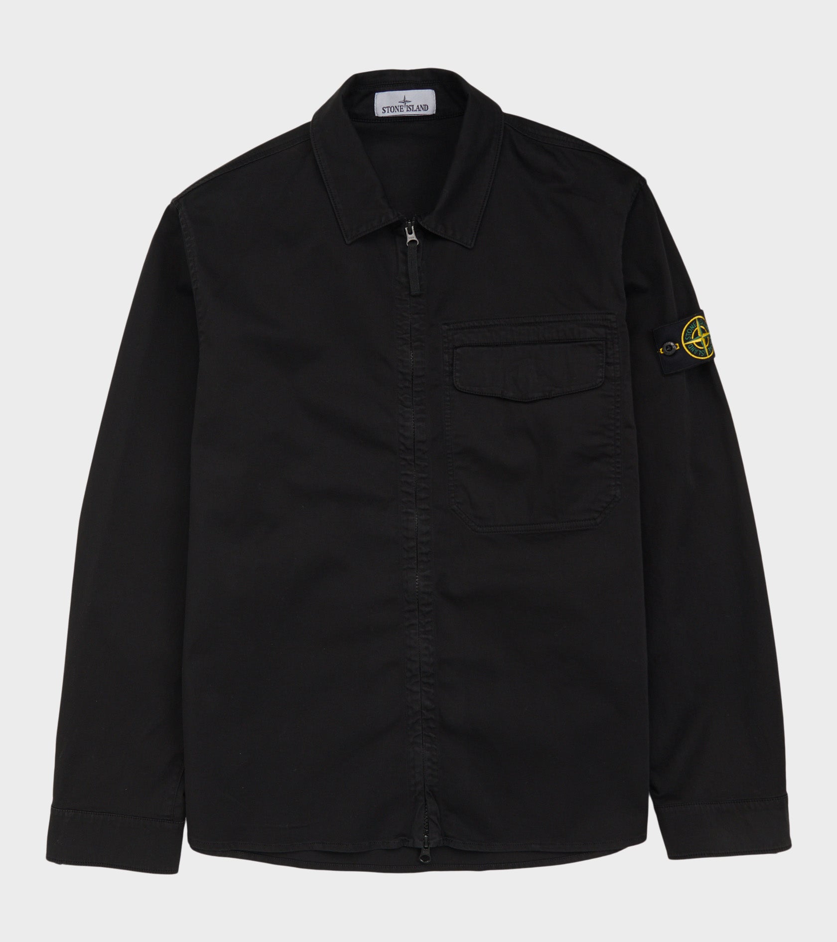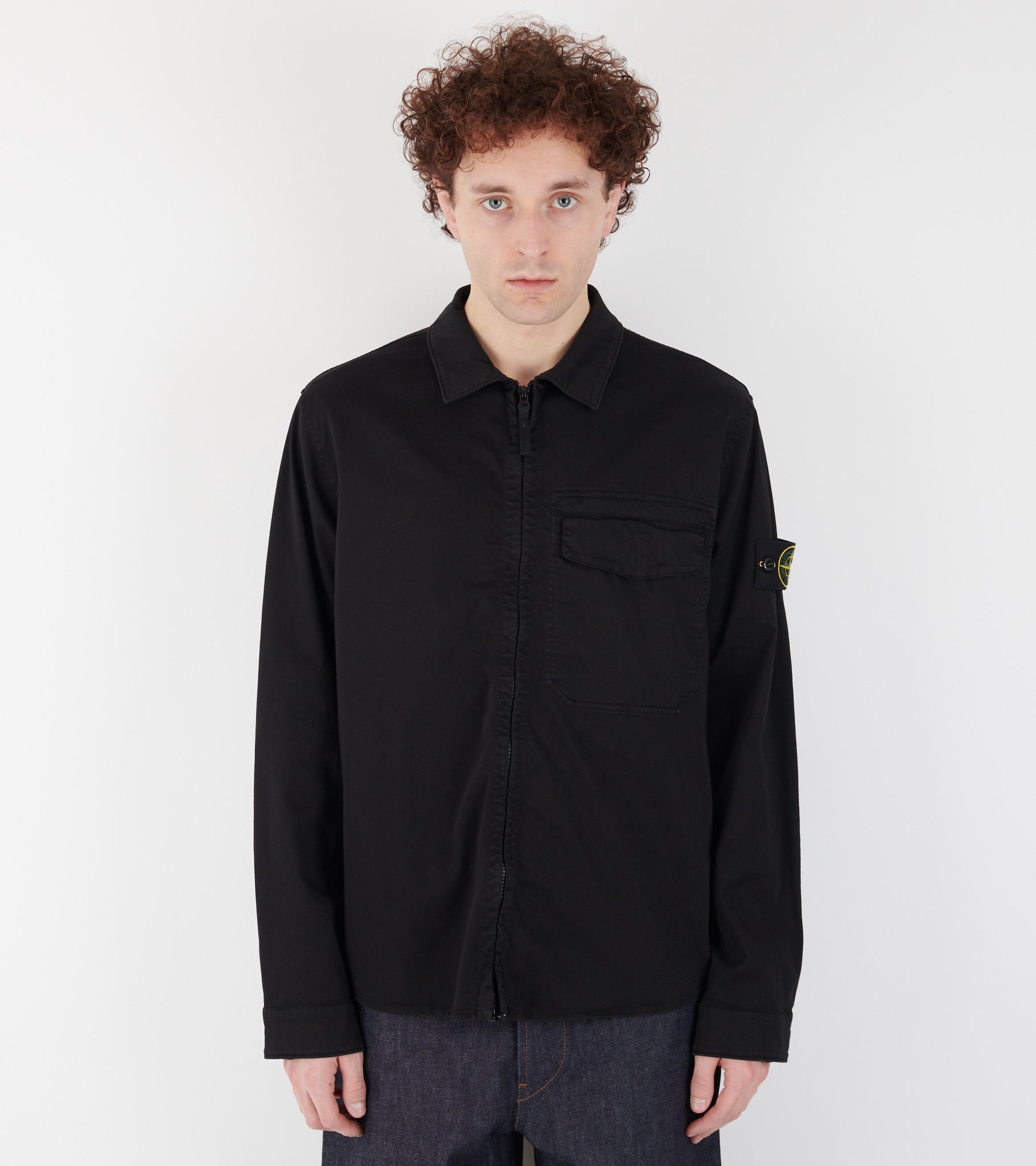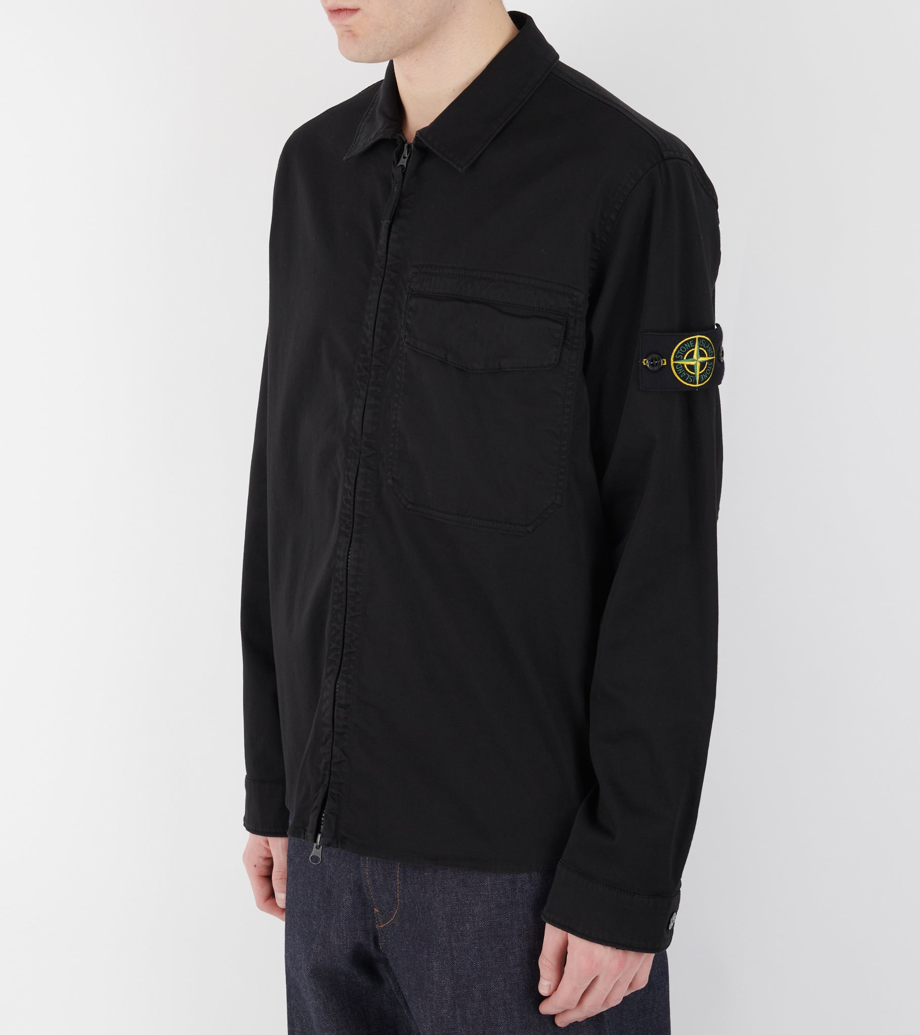 Sort overshirt i økologisk bomuld fra Stone Island. Denne overshirt har en klassisk krave, en dobbeltgående lynlåslukning samt en brystlomme. På venstre ærme er det ikoniske Stone Patch.