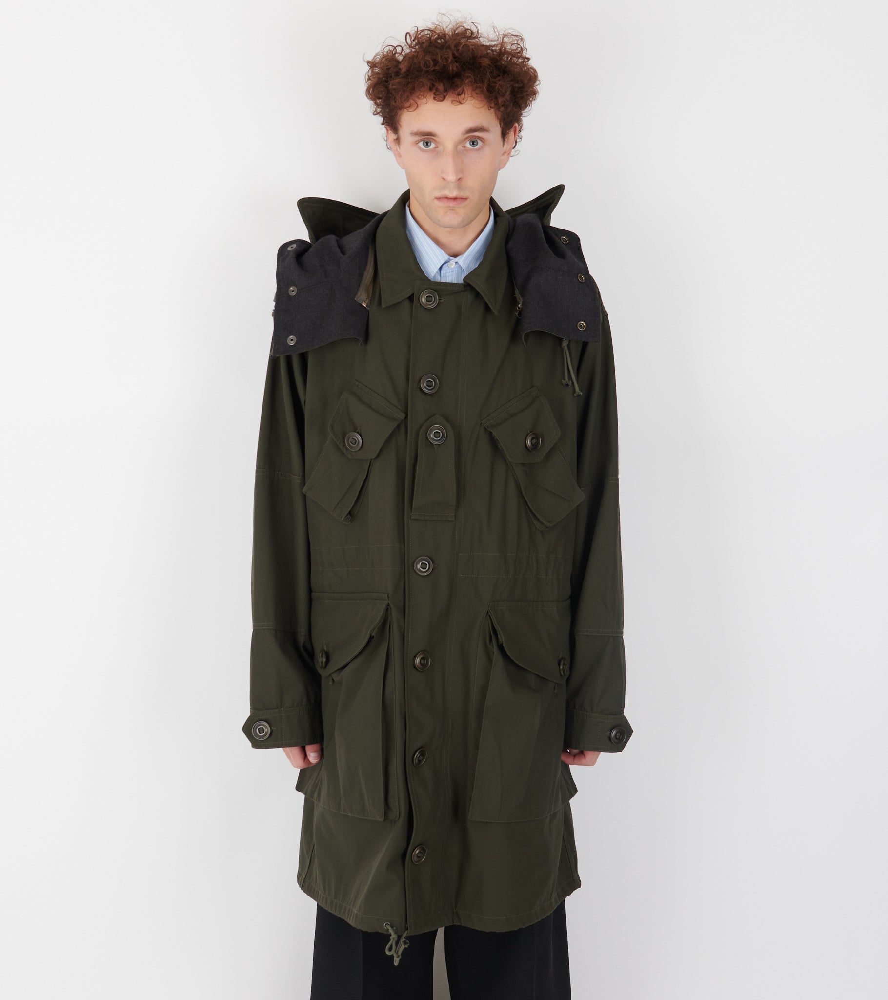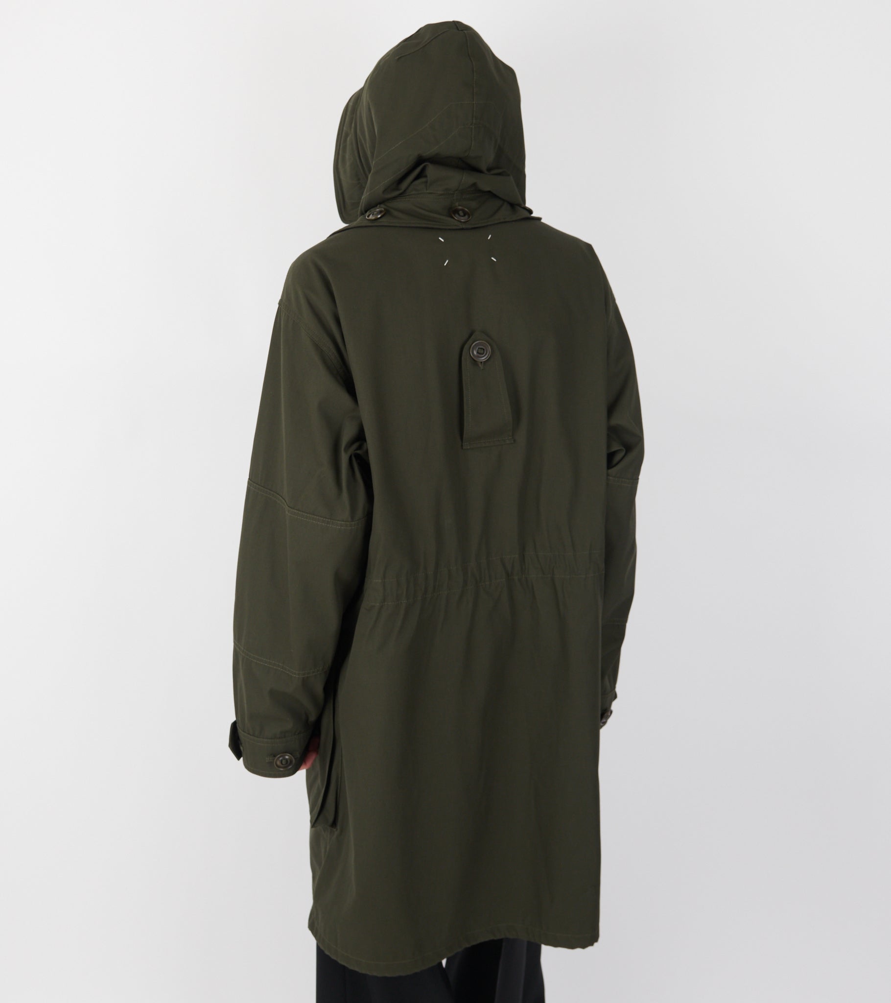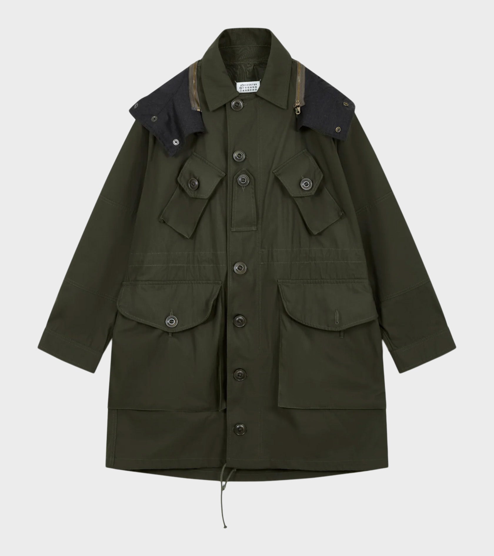 Olivengrøn frakke fra Maison Margiela. Frakken har en aftagelig hætte, en skjult lynlåslukning, en knaplukning og fire lommer på fronten. I bunden er justerbar snore. Øverst bagpå er de ikoniske 'Four Stitchings'.