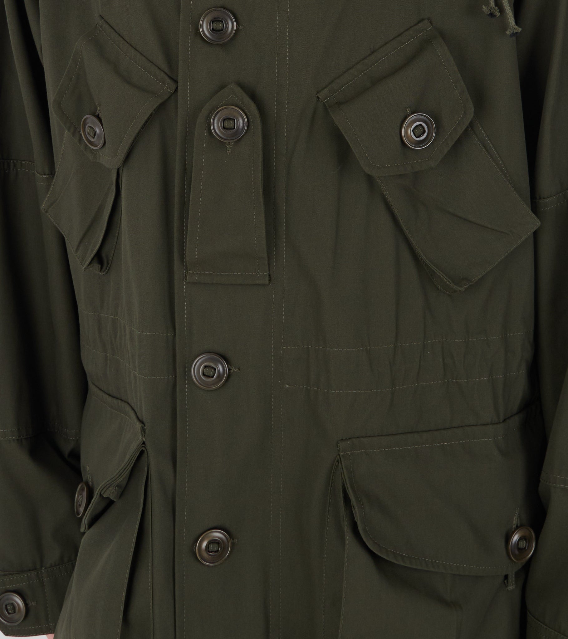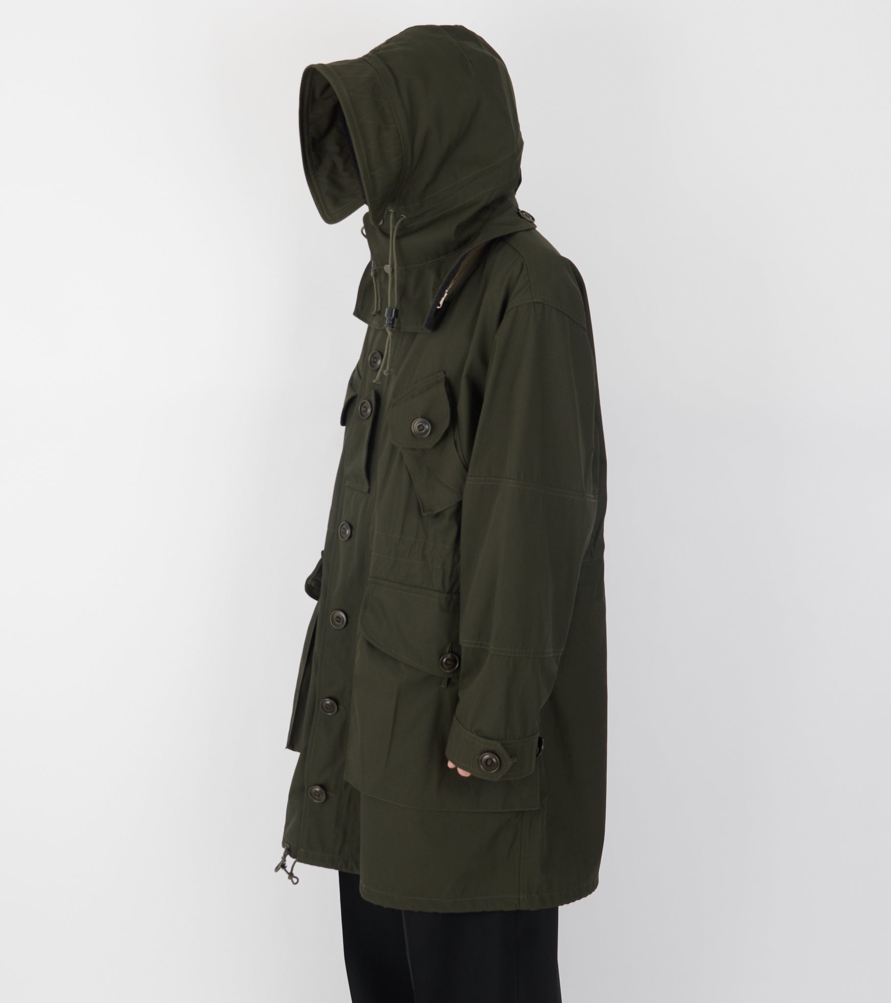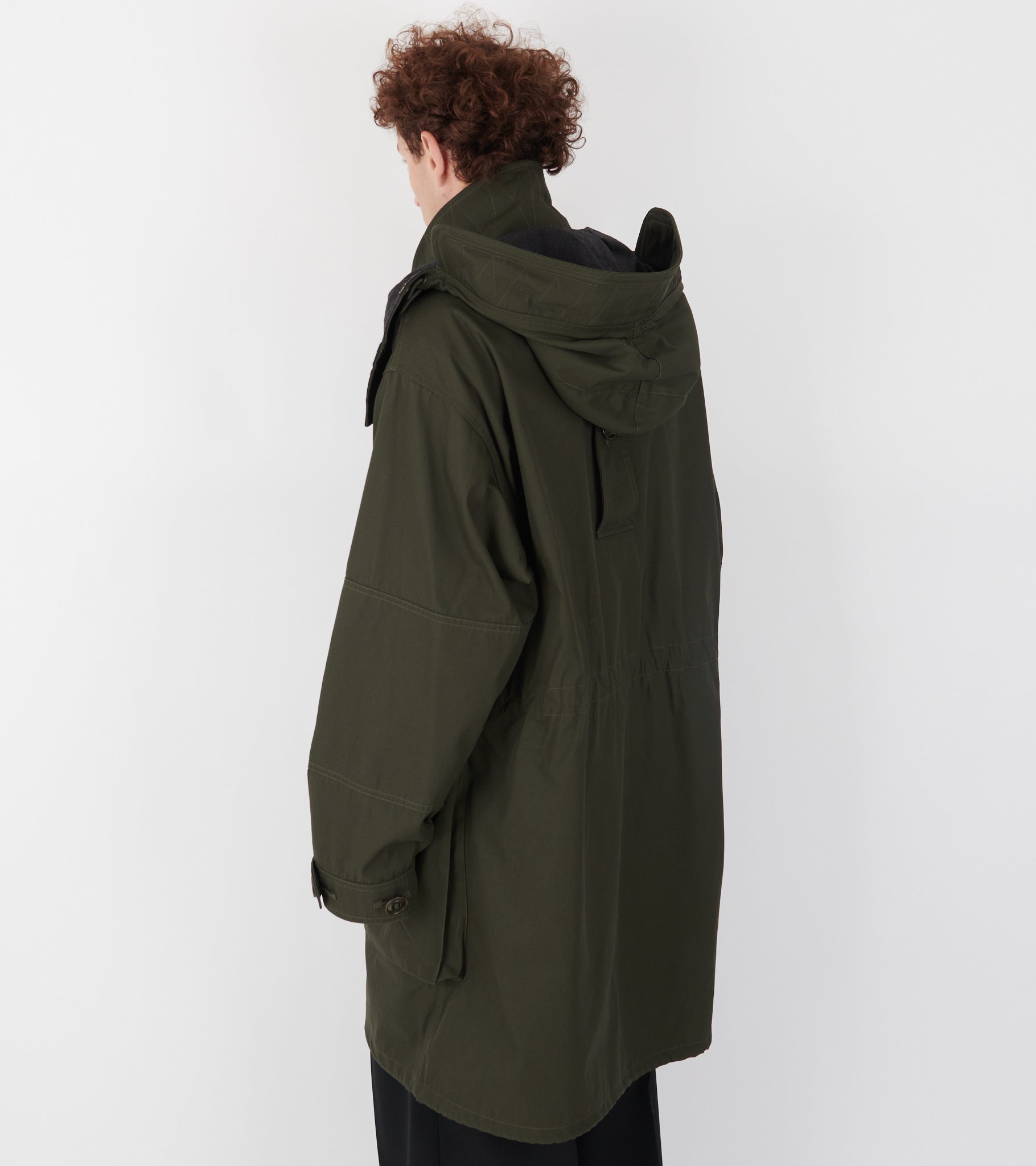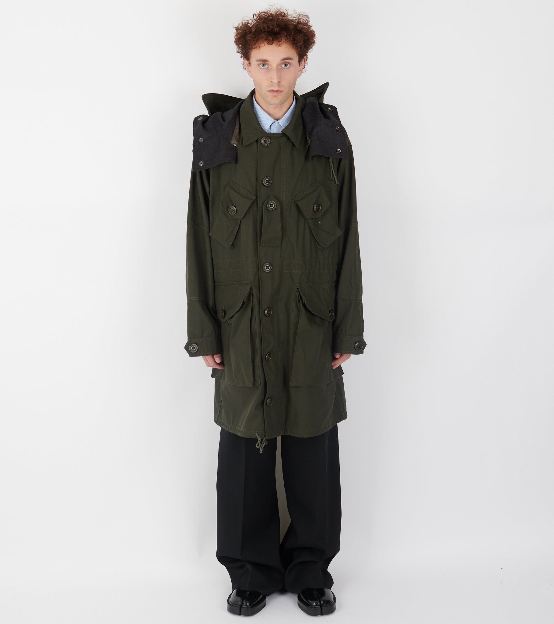 Olivengrøn frakke fra Maison Margiela. Frakken har en aftagelig hætte, en skjult lynlåslukning, en knaplukning og fire lommer på fronten. I bunden er justerbar snore. Øverst bagpå er de ikoniske 'Four Stitchings'.