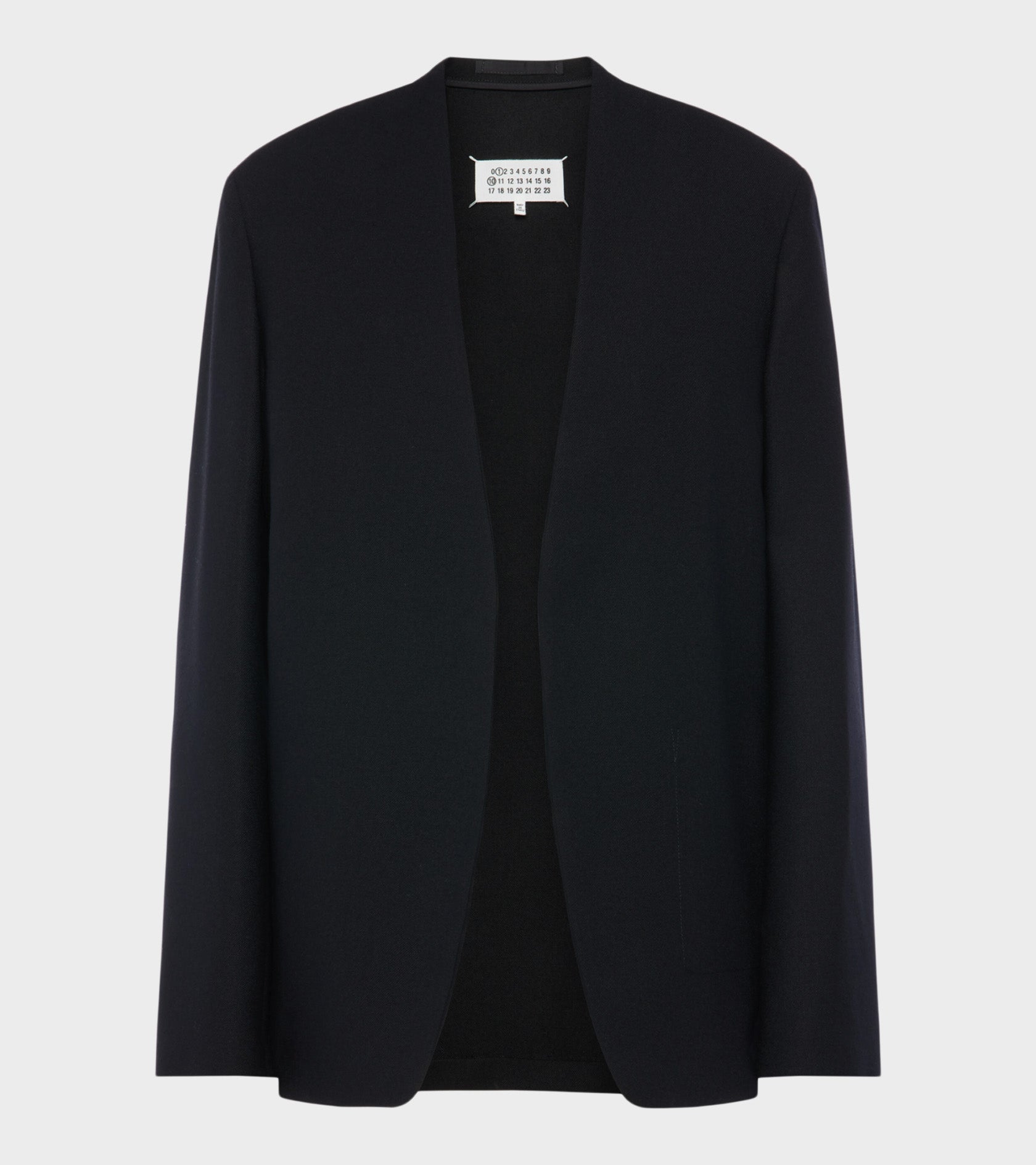 Sort blazer i jomfru uld fra Maison Margiela. Blazeren er fremstillet i en uld-flannel kvalitet og er uden krave og knapper. Blazeren har to indvendige lommer. Øverst bagpå er de ikoniske 'Four Stitchings'.