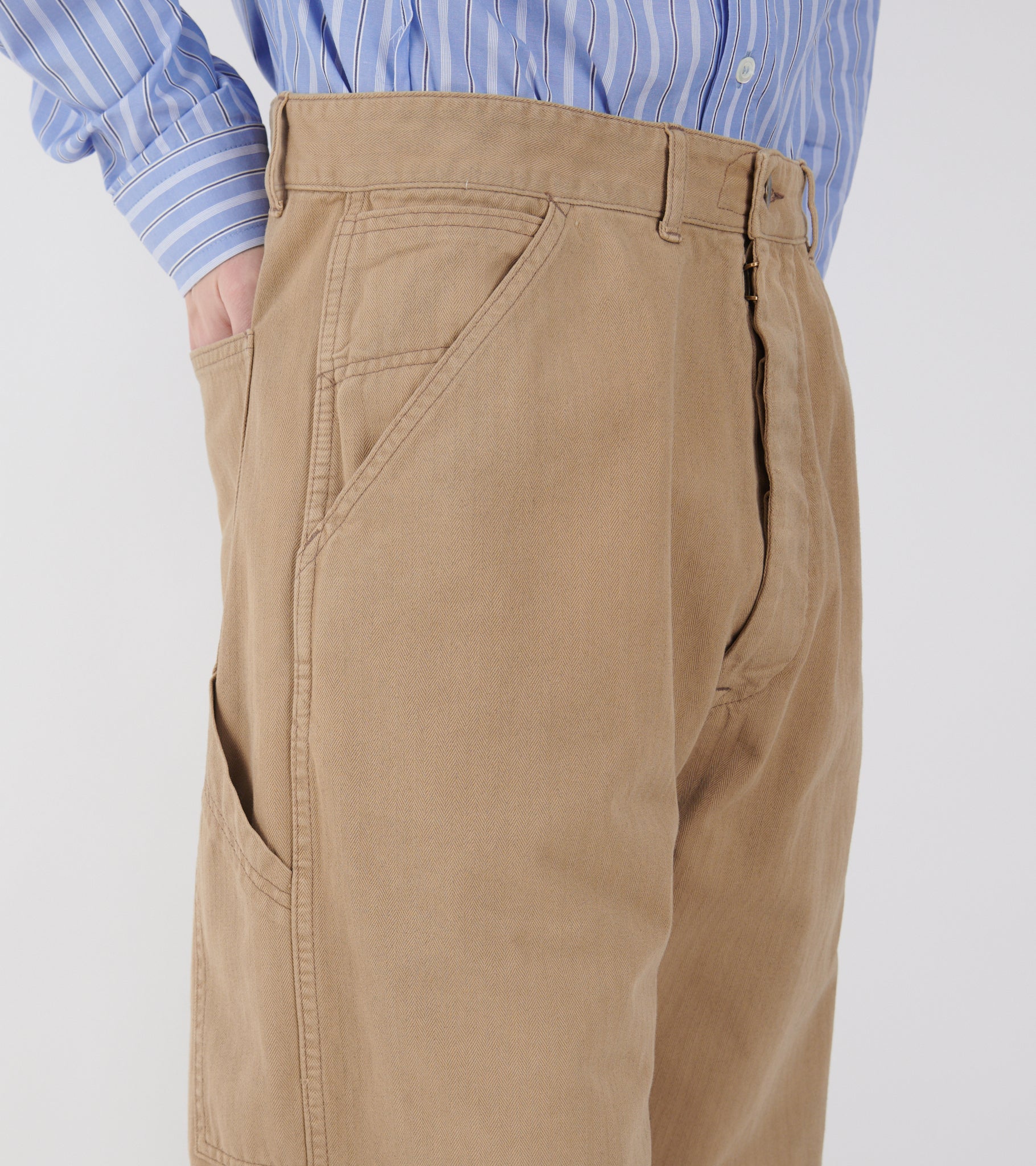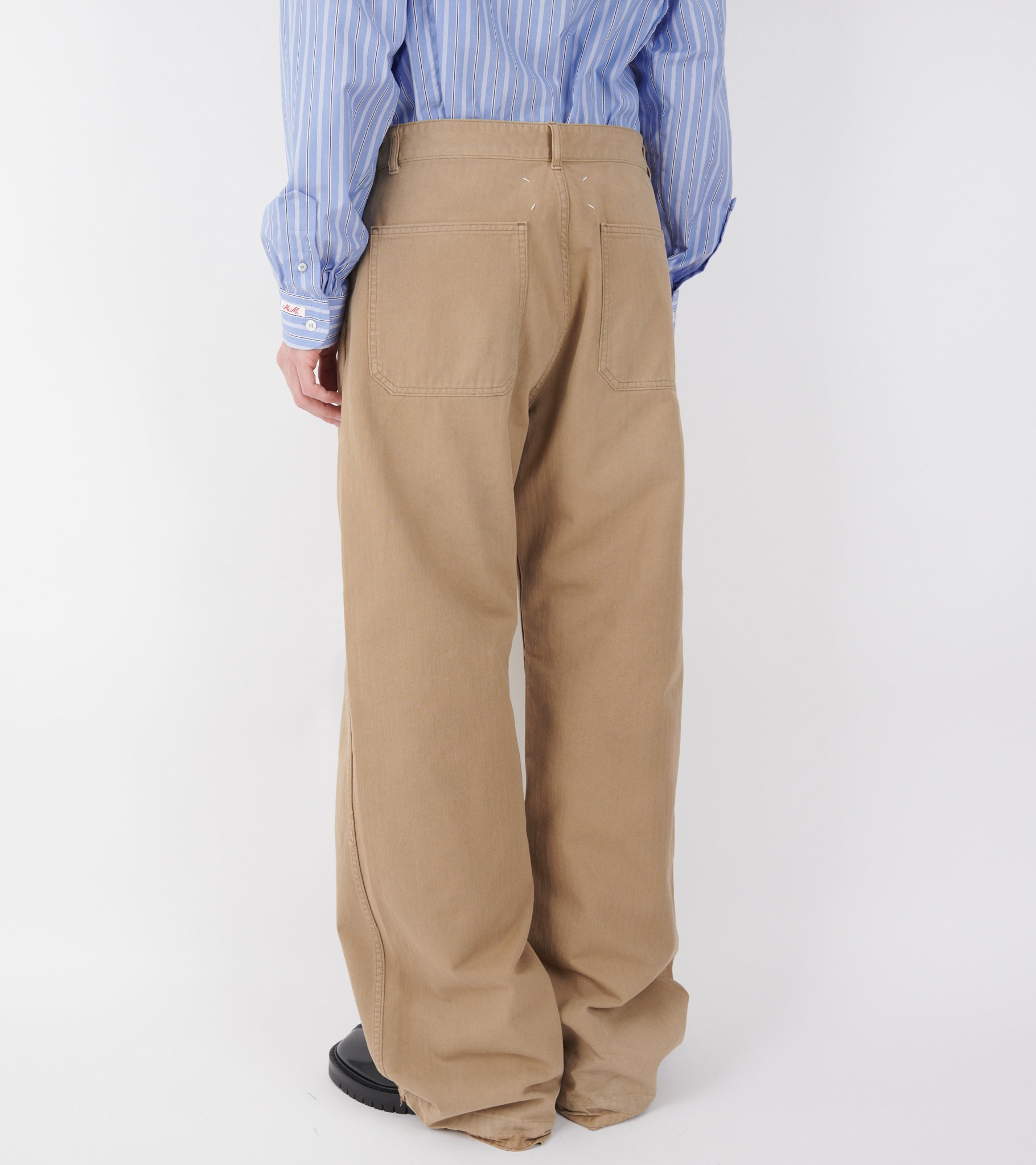 Beige bukser i stribet bomuldskanvas fra Maison Margiela. Bukserne har et klassisk '5 Pocket' design, bæltestropper samt brede lige ben. I bunden er en 'optrævlet opsmøg effekt'. Øverst bagpå er det ikoniske 'Four Stitchings'.