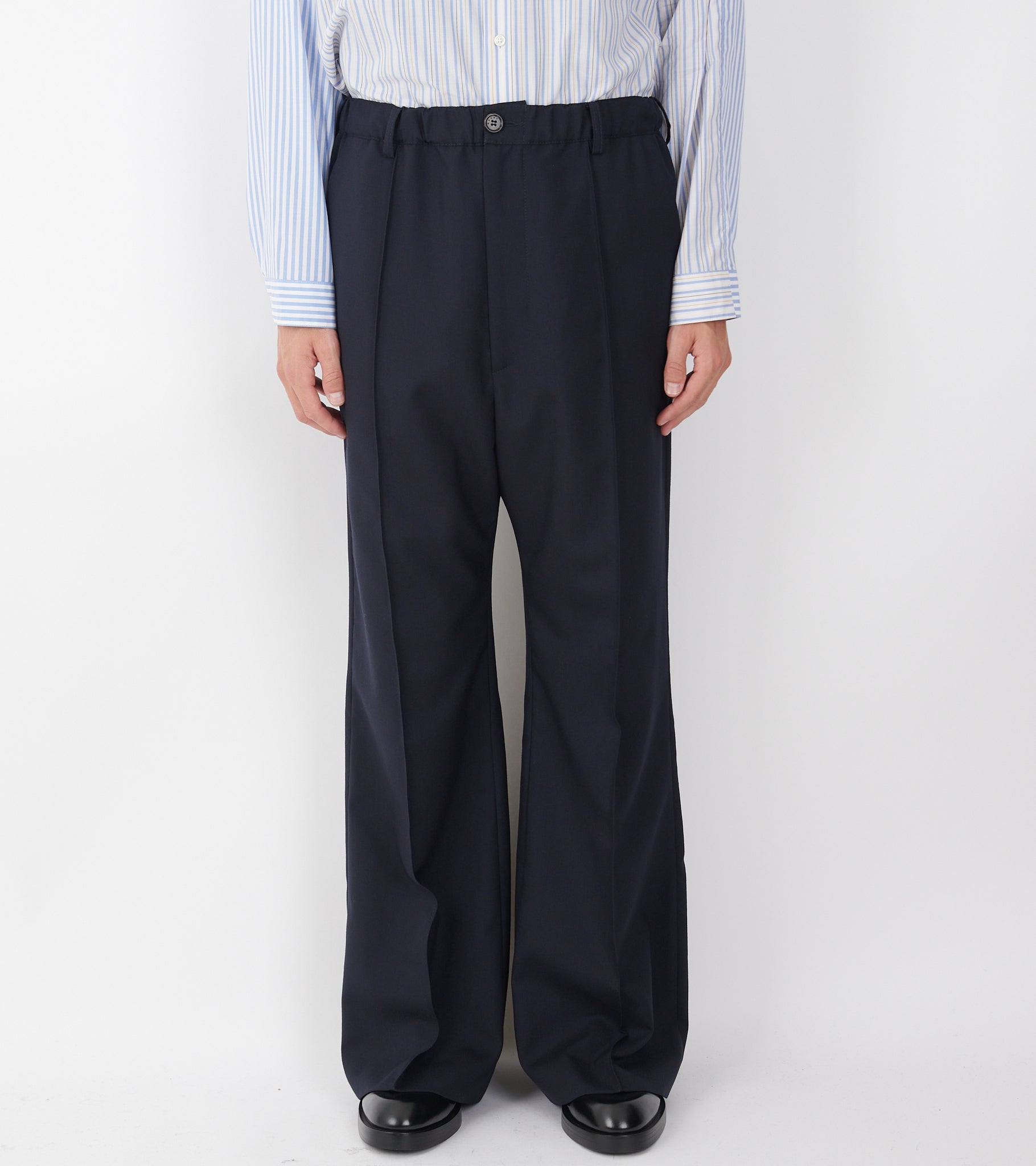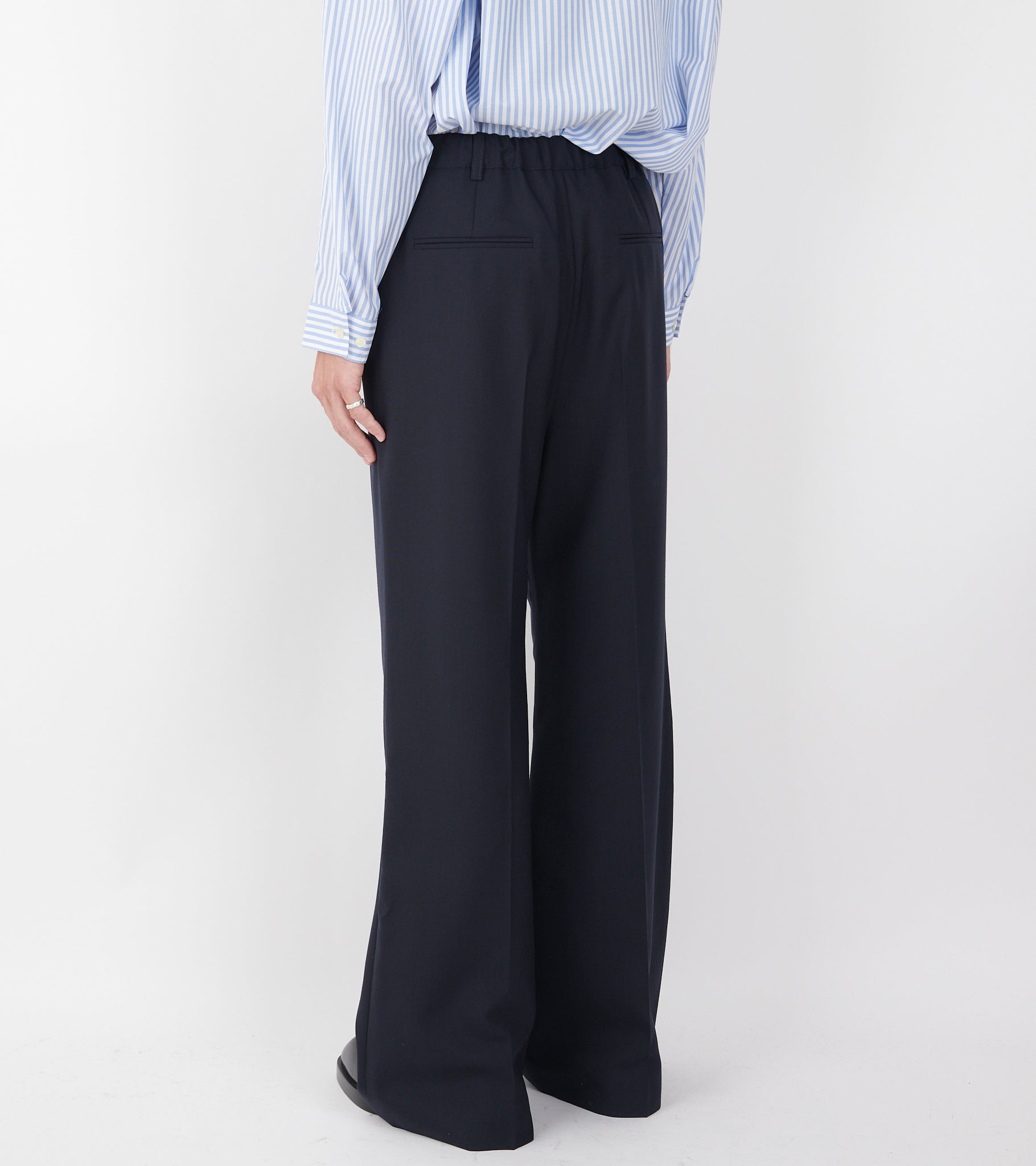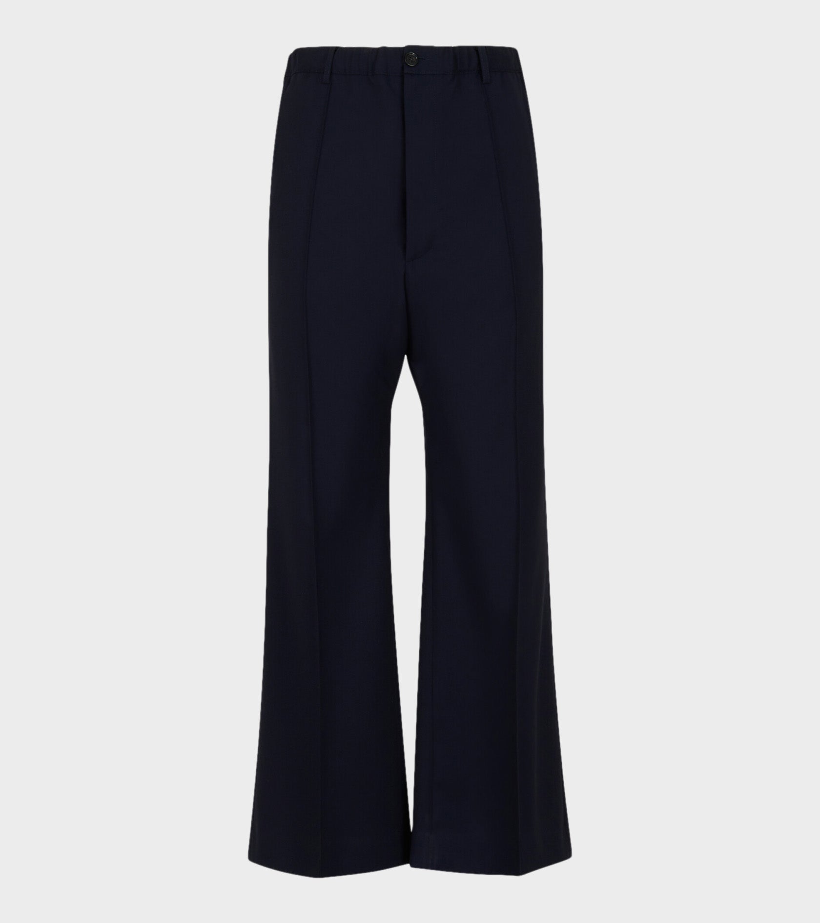 Mørke navy flared bukser i en tropisk jomfru-uldkvalitet fra Marni. Bukserne har elastik, et indvendigt bindebånd og bæltestropper i livet. Øverst er en knaplukning med en hornknap. Bukserne har en skrålomme i hver side samt to stiklommer bagpå.