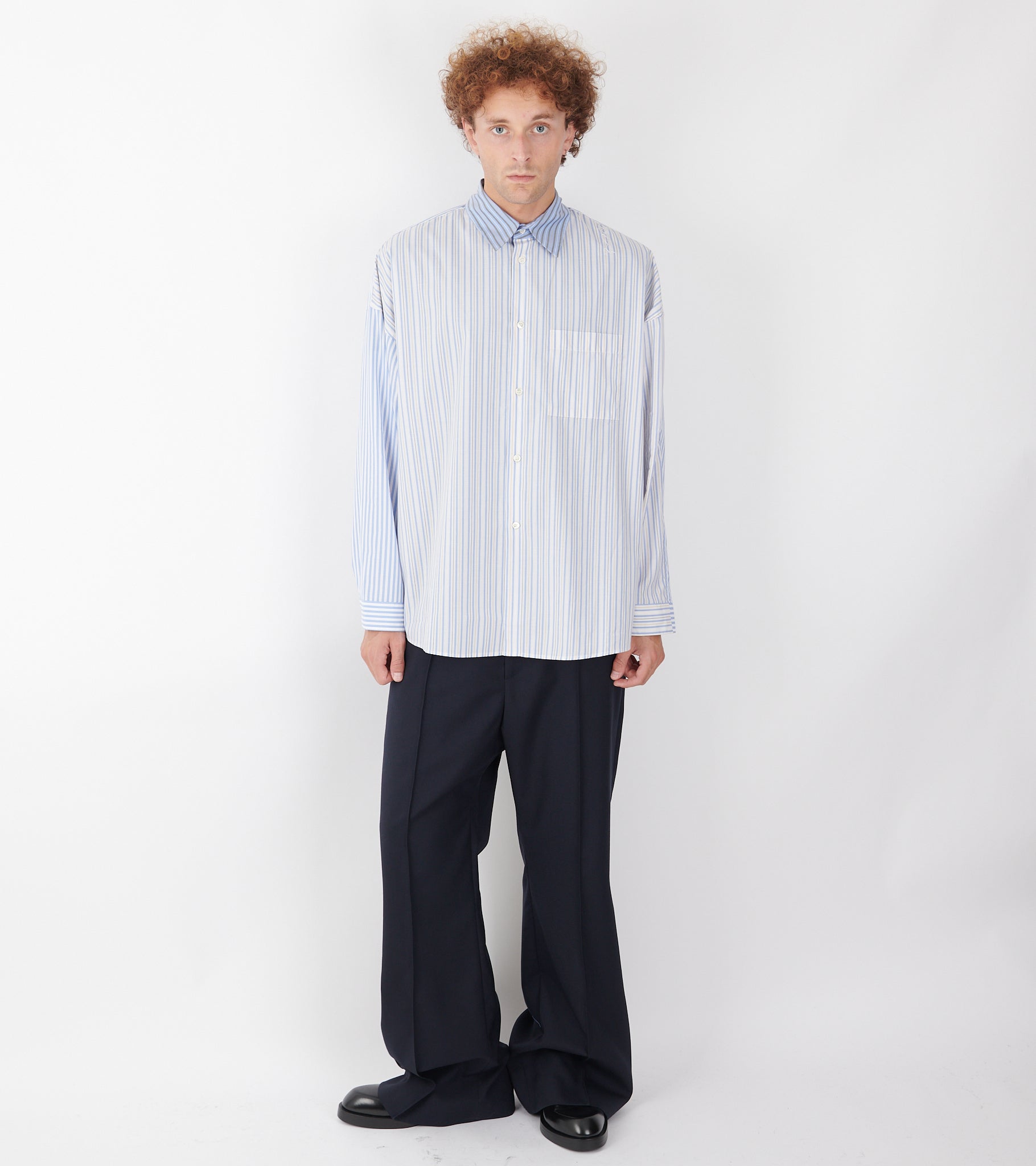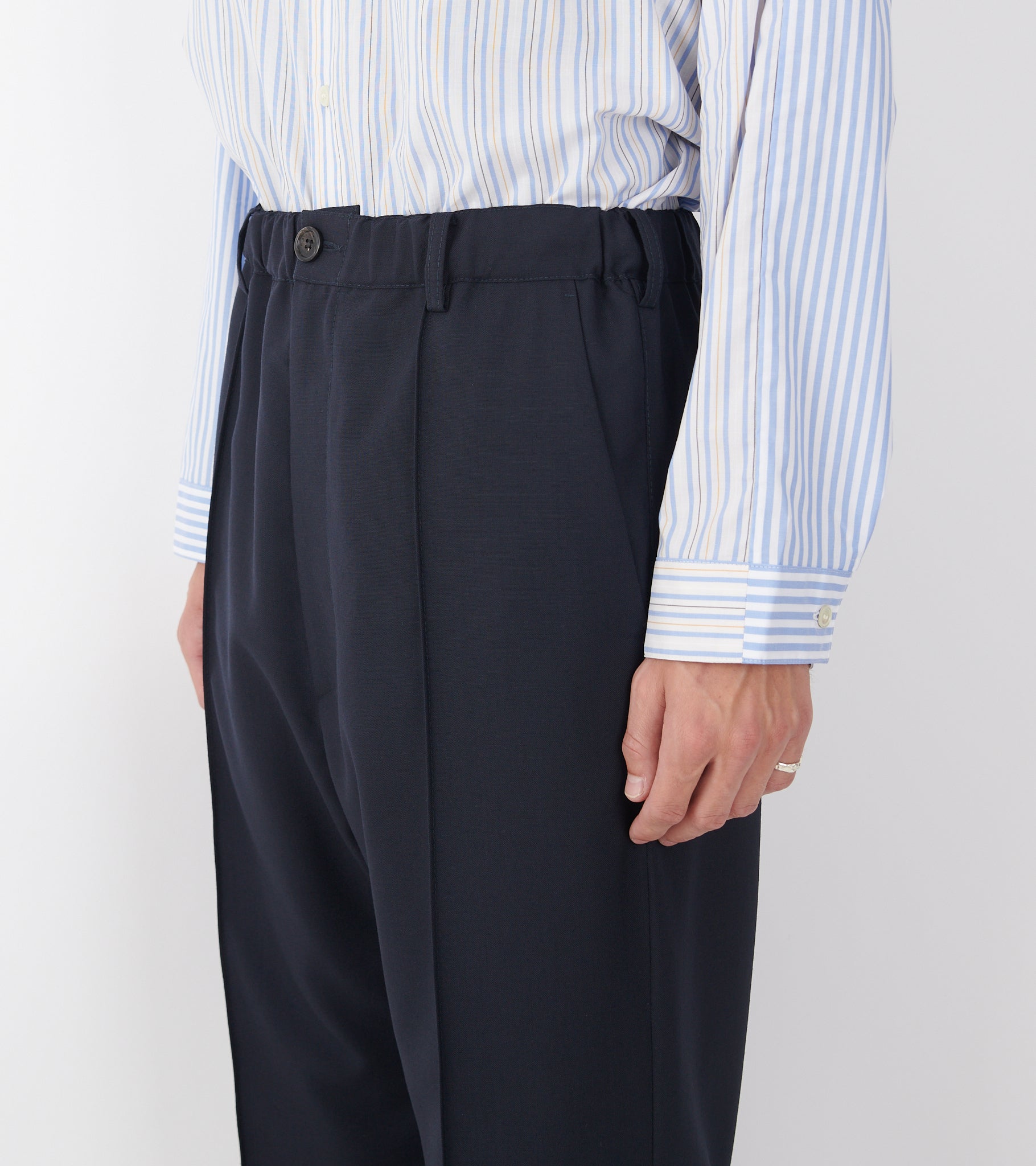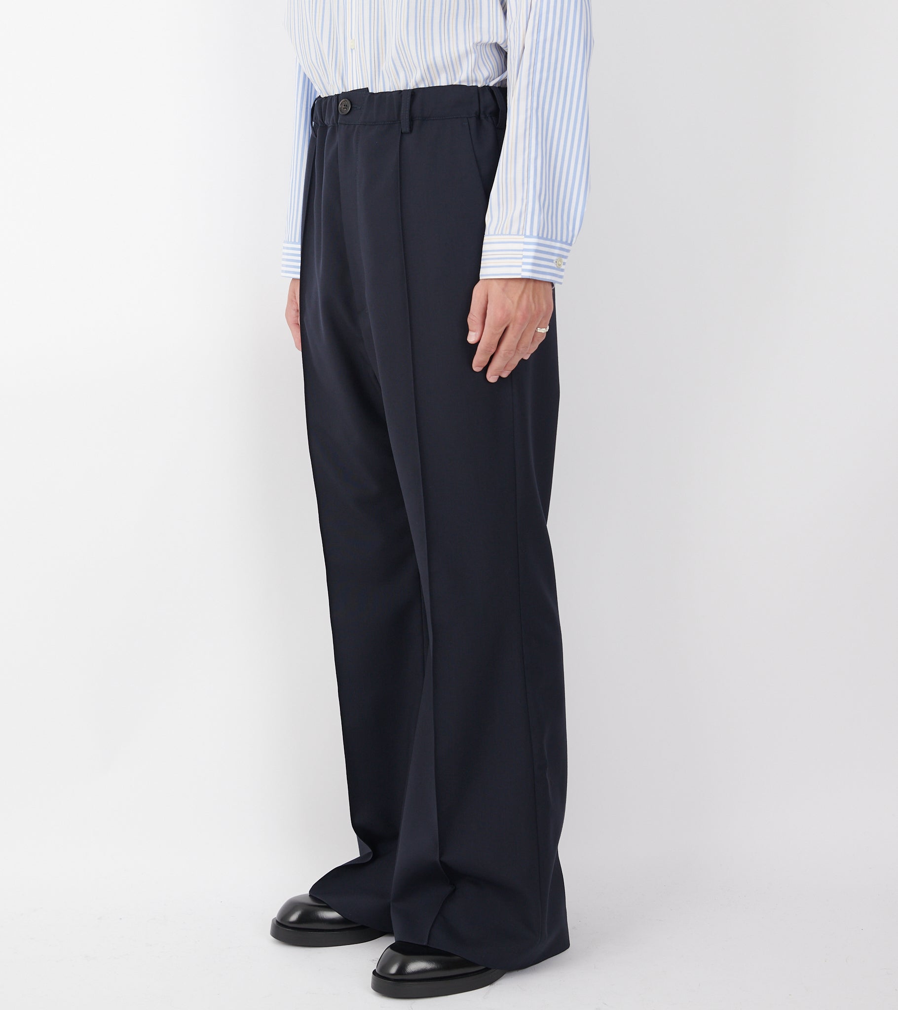 Mørke navy flared bukser i en tropisk jomfru-uldkvalitet fra Marni. Bukserne har elastik, et indvendigt bindebånd og bæltestropper i livet. Øverst er en knaplukning med en hornknap. Bukserne har en skrålomme i hver side samt to stiklommer bagpå.
