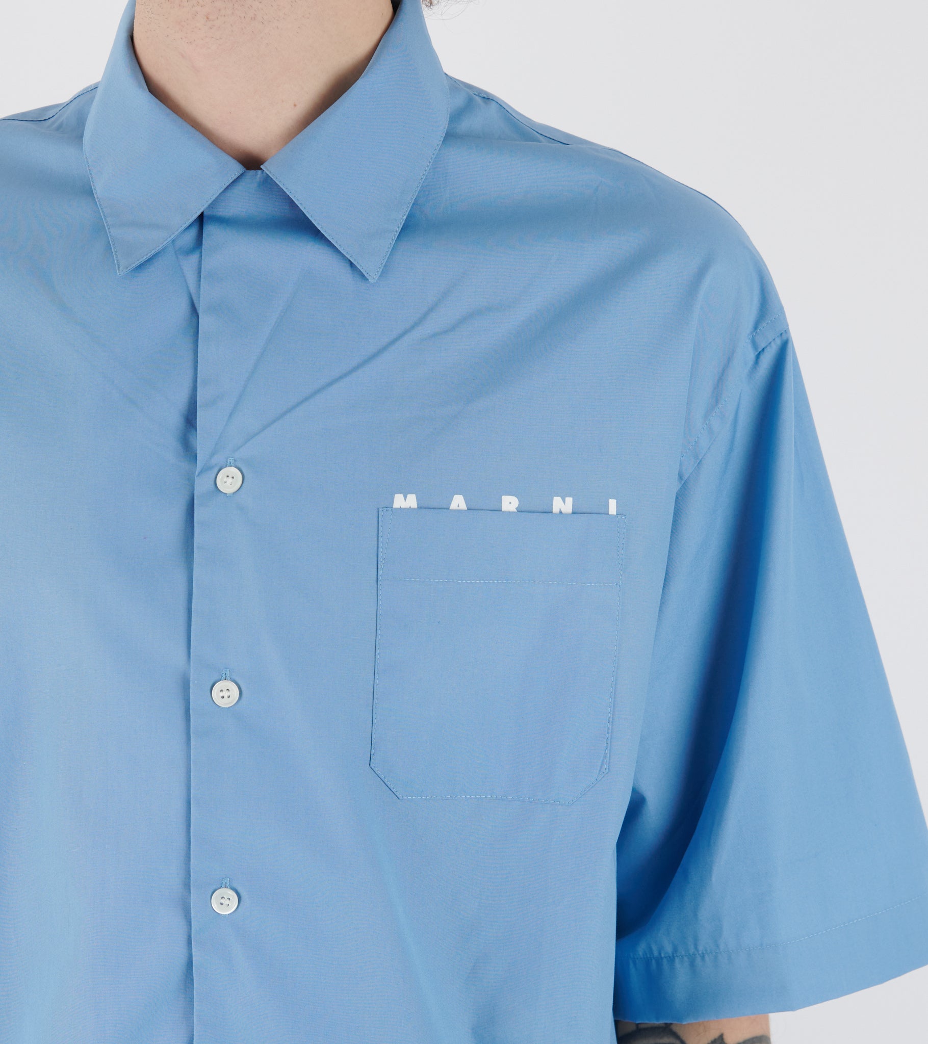 Kortærmet skjorte i økologisk bomuldspoplin fra Marni. Skjorten har en knaplukning, en brystlomme og en åben krave, som også kan knappes helt op til en klassisk krave. over brystlommen er et printet hvidt logo.