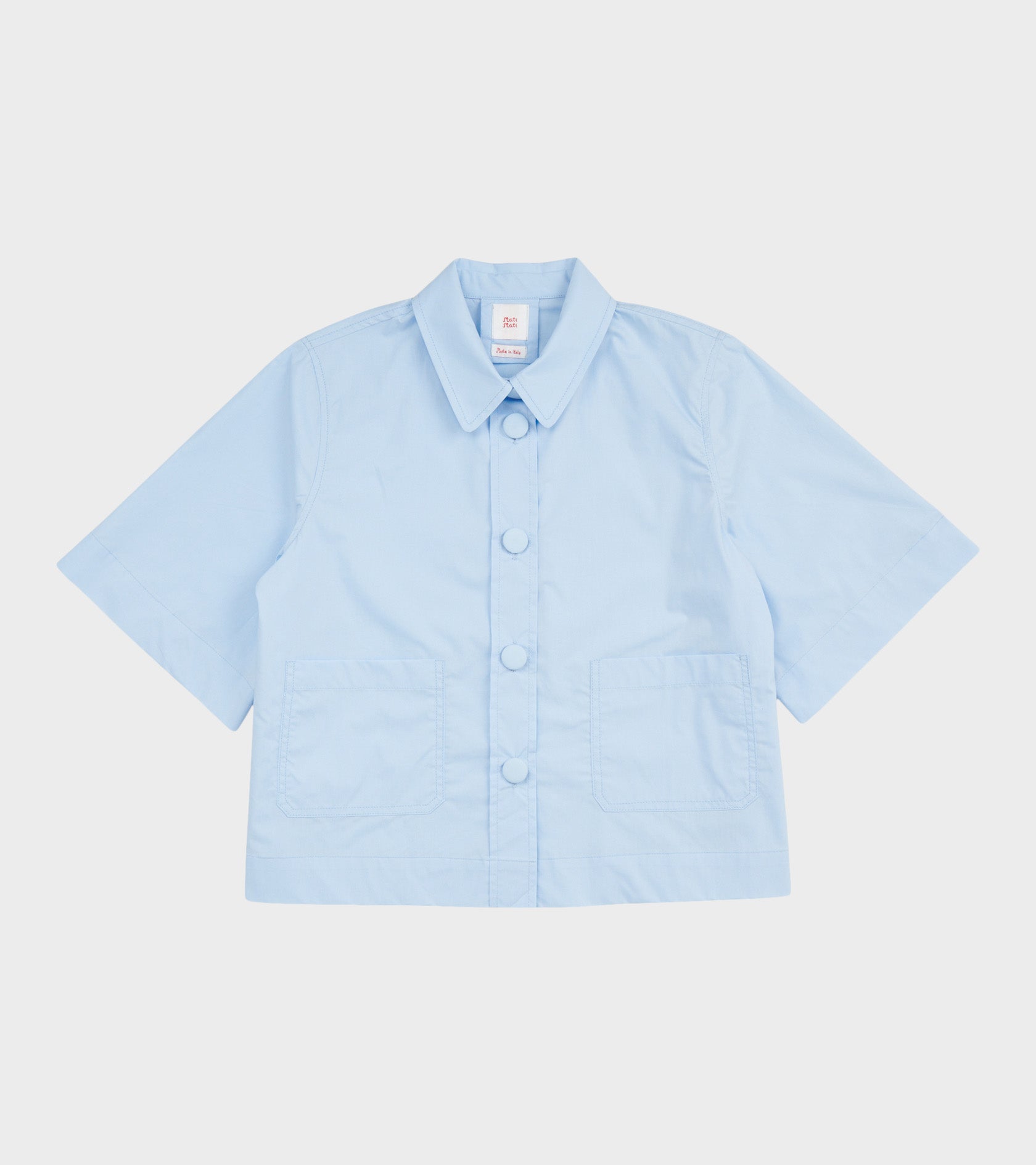 Amanda S/S Shirt i lyseblå fra Mati Mati. Skjorten har brede ærmer, en klassisk krave, to lommer på fronten samt en knaplukning med stofbetrukne knapper.