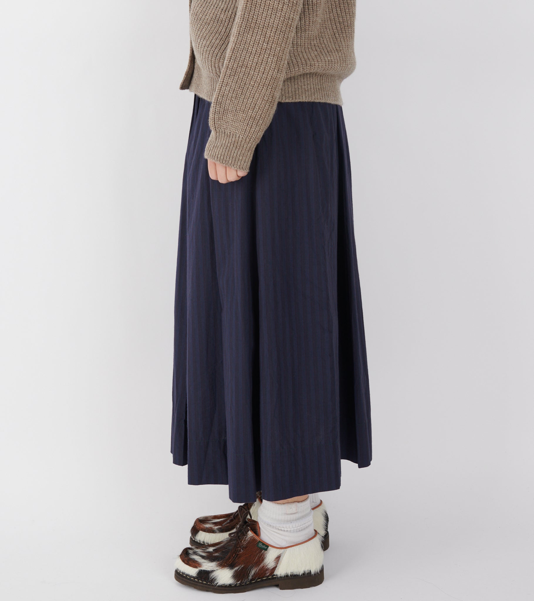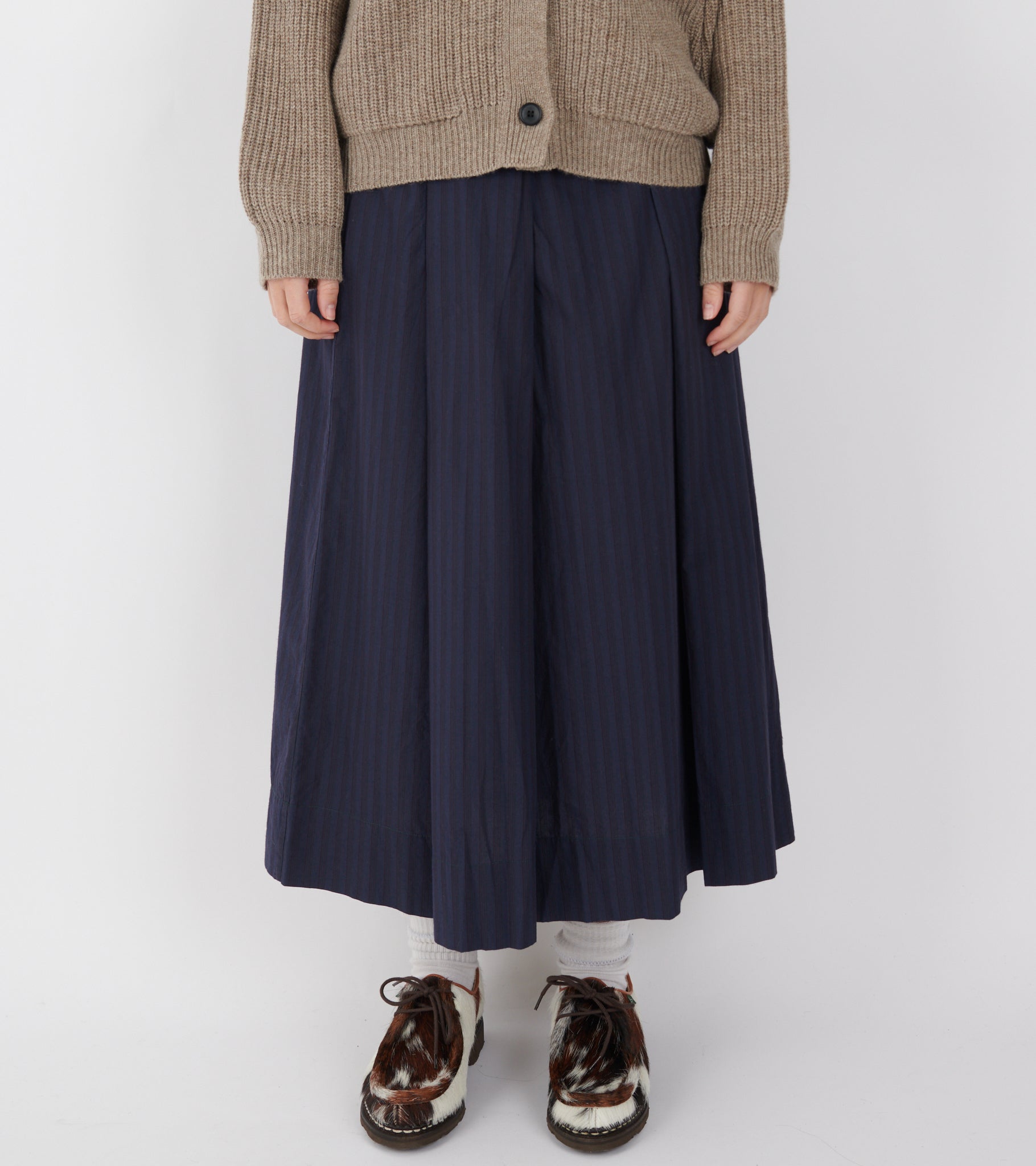 Stribet navy nederdel fra Moismont. Nederdelen har læg samt en diskret lynlås- og knaplukning øverst i venstre side. Øverst på fronten er et lille broderet logo i rød.