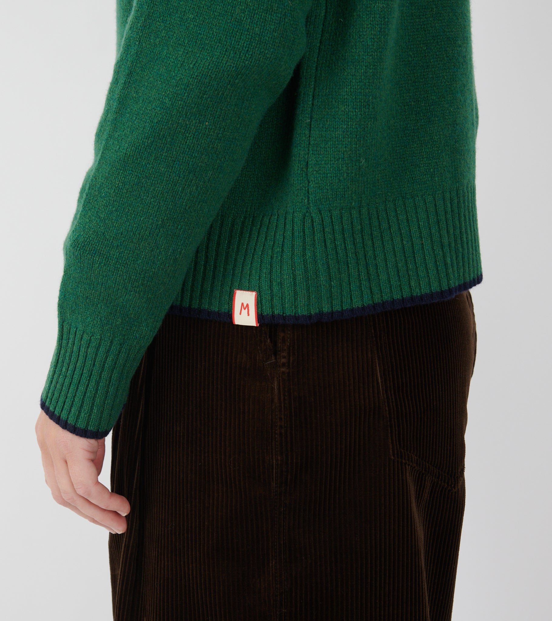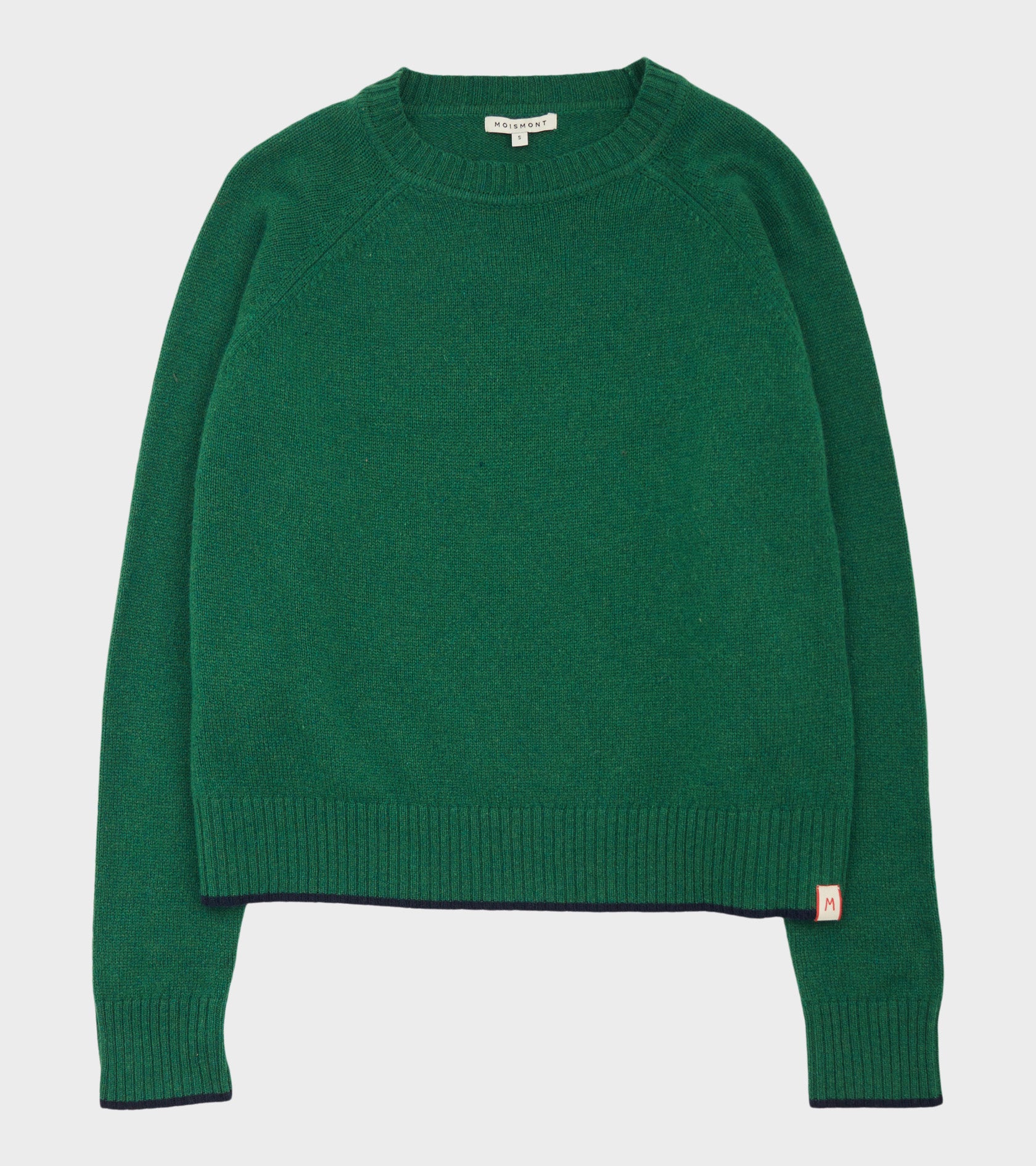 Grøn strik i merino uld fra Moismont. Denne strik har en rund hals, ribstrikkede kanter samt navy kontrastkanter. Nederst på fronten er et lille logotag.