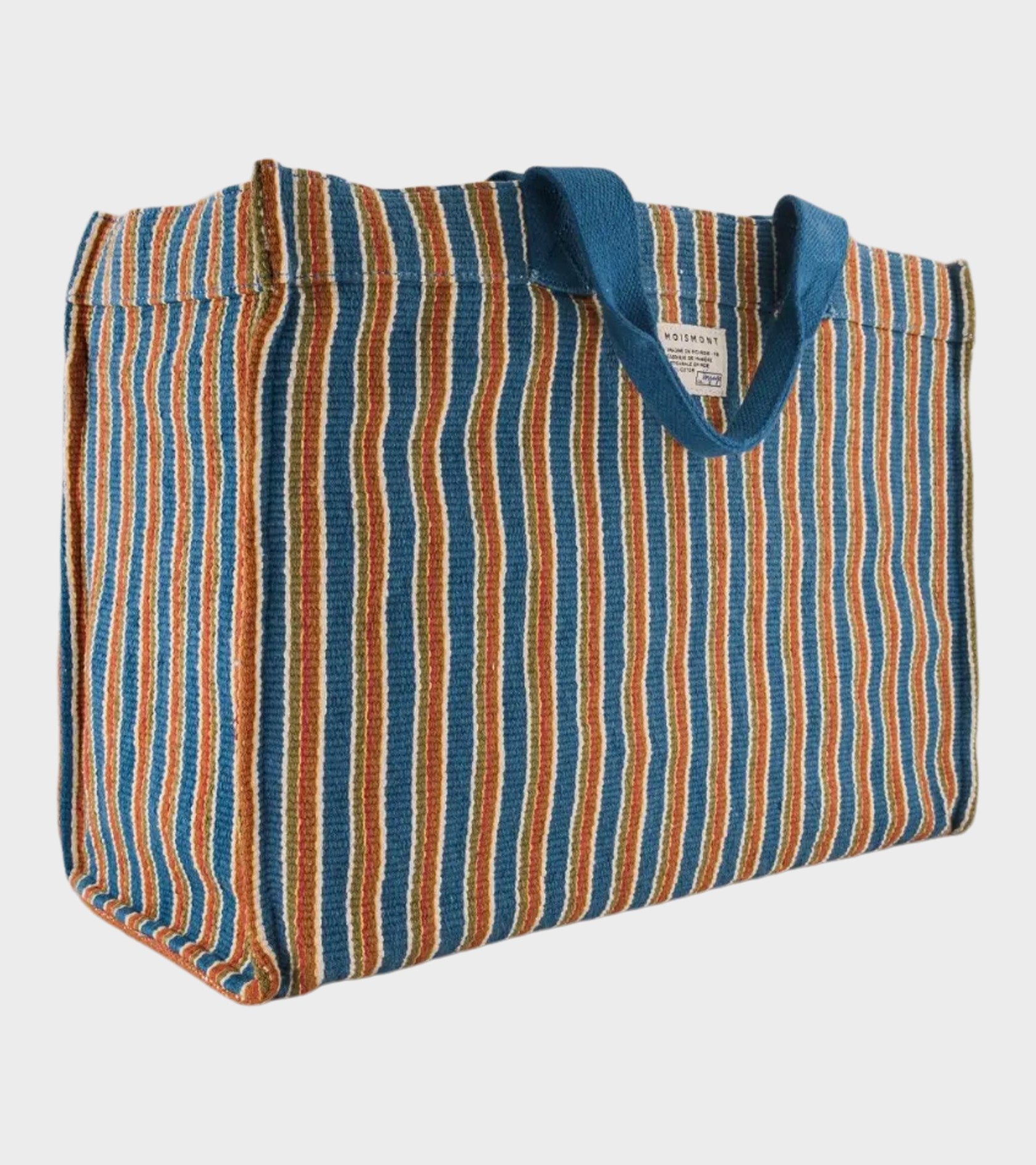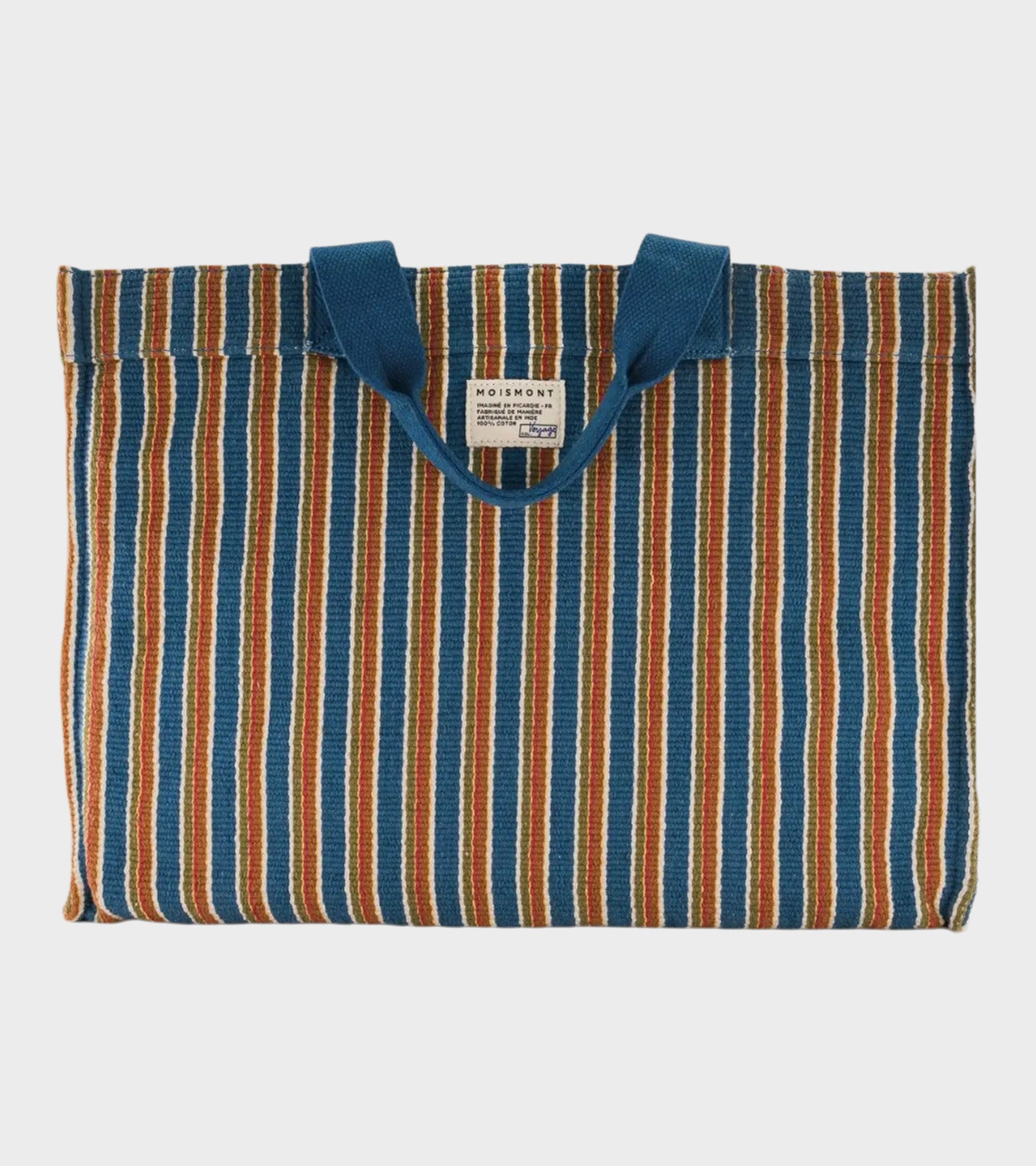 Stribet håndvævet shopping bag fra Moismont. Tasken har en justerbar skulderstrop i samme farve som de to hanke og et påsyet logo på forsiden.
