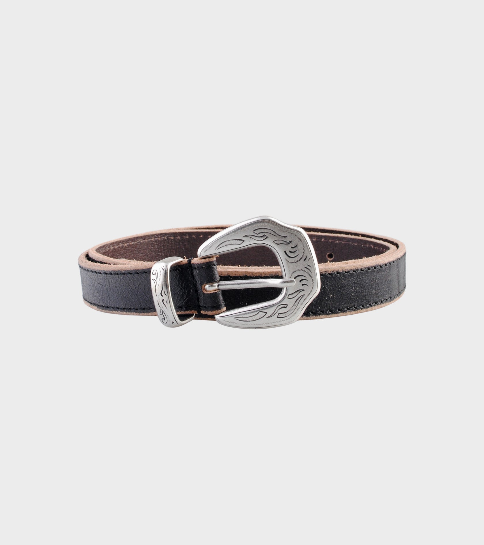 Sort krakeleret bælte med sølv hardware fra Molebo. Bæltet er fremstillet på Fyn af passionerede bæltemagere. Molebo bruger kun luksusråvarer fra de fineste italienske hardwareleverandører og alt læder er guld-og sølv certificeret af Leather Working Group.