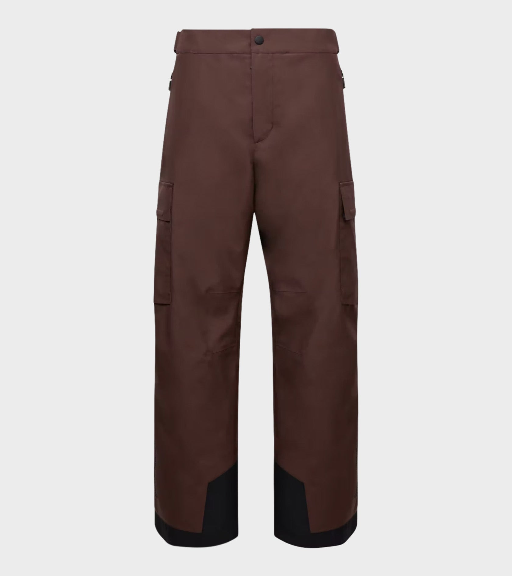 Brune skibukser fra Moncler Grenoble. Bukserne er foret med PrimaLoft® og er fremstillet i en vandtæt Gore-tex polyesterkvalitet. Bukserne har en knaplukning i livet, en lynlåslomme i hver side, to cargolommer samt to baglommer. På det ene ben er et logo i sort silikone. Bukserne er beregnet til både ski og snowboard.