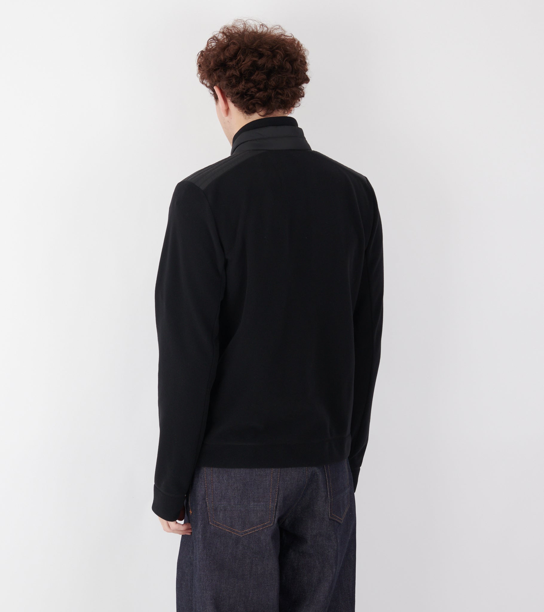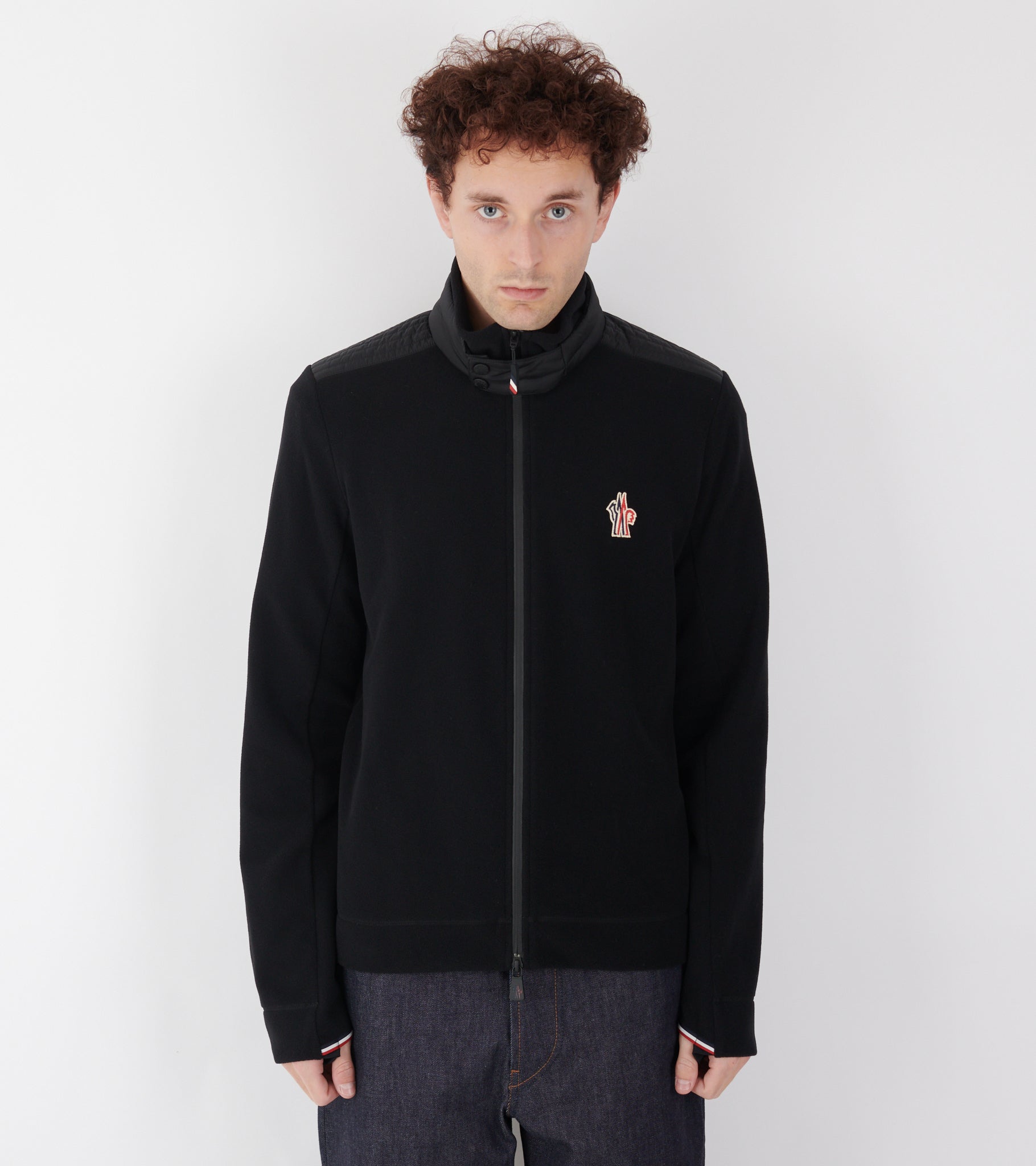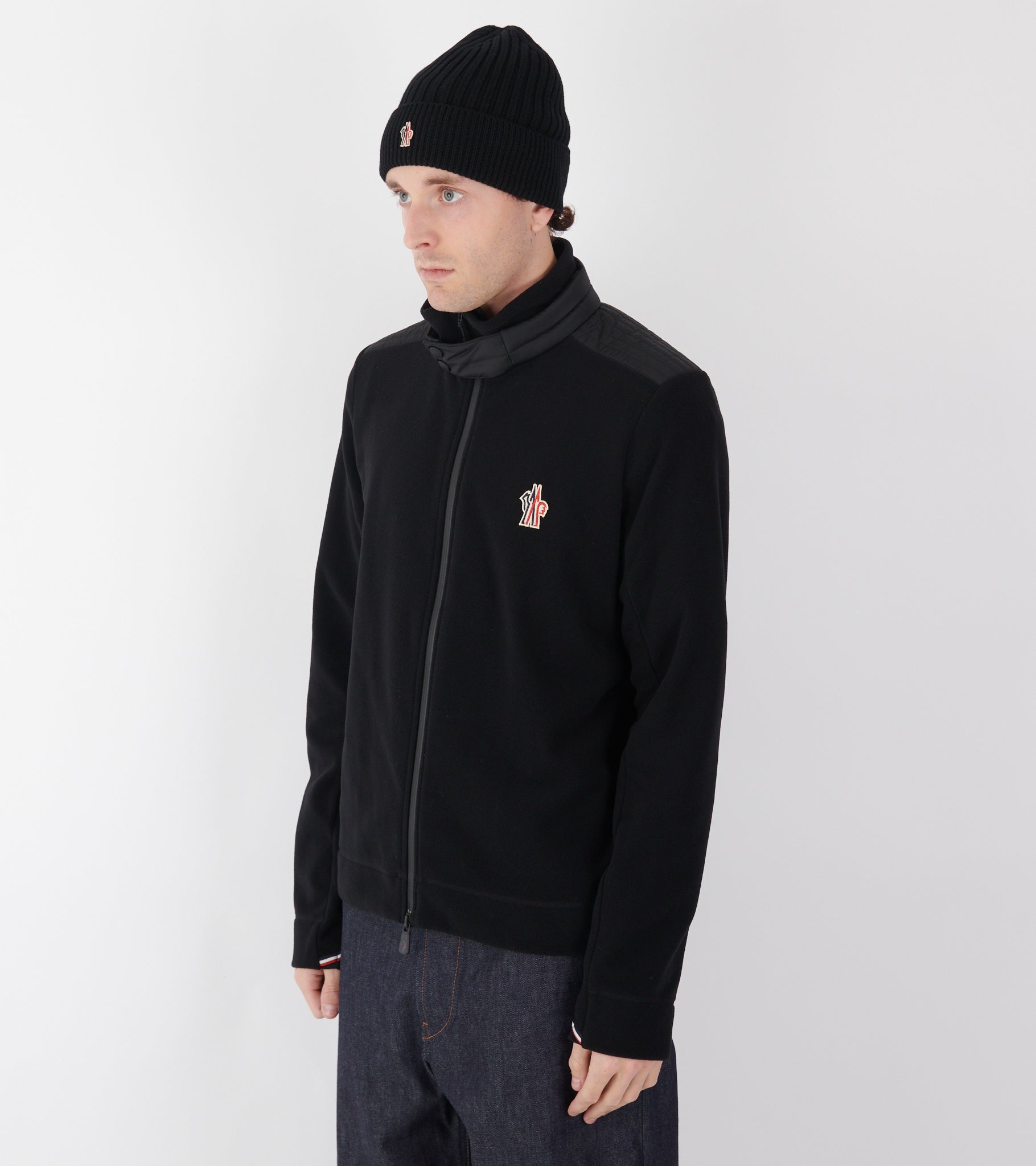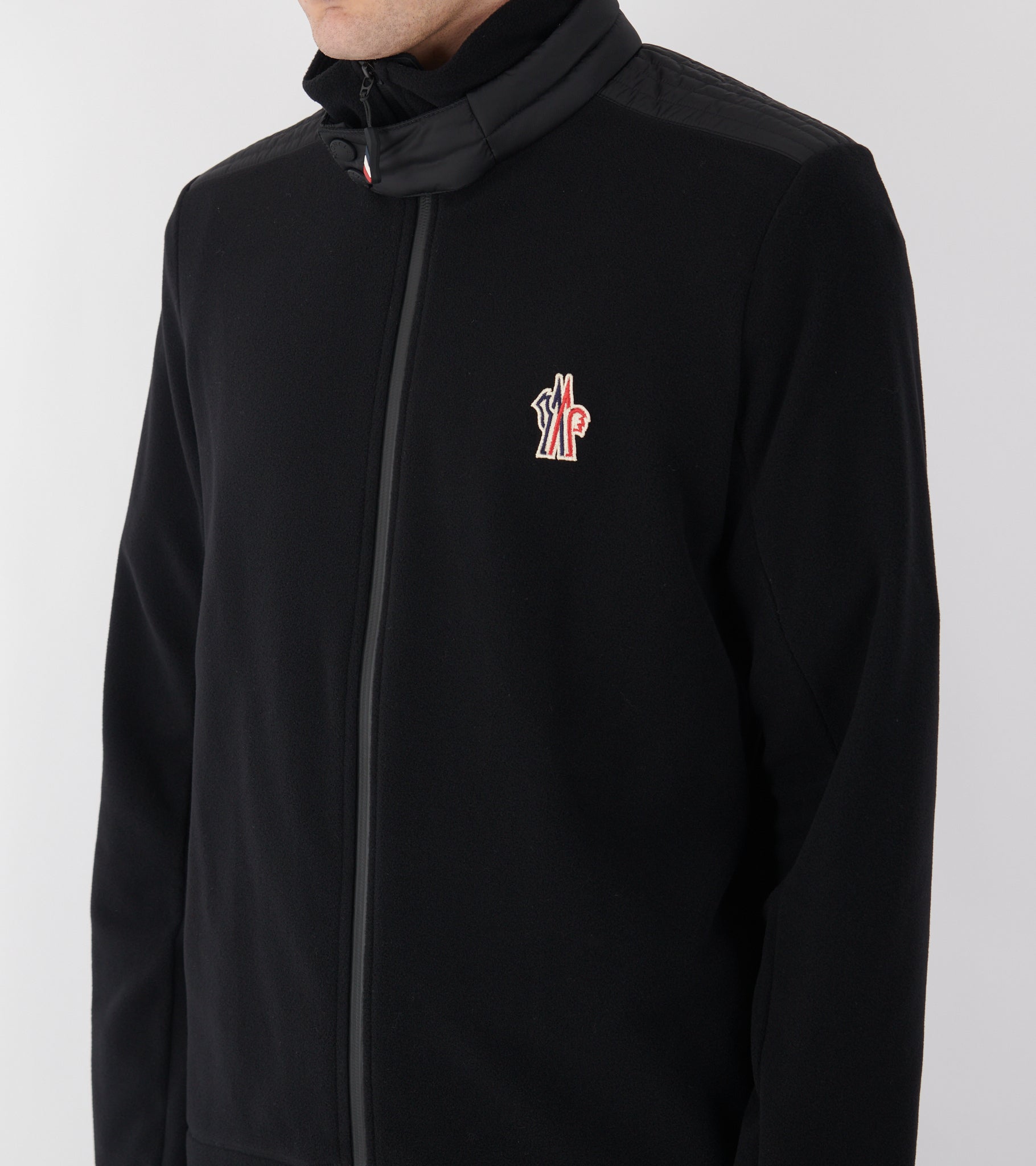 Sort fleecejakke fra Moncler. Denne fleece har detaljer i foret nylon, en mellemhøj hals med en dobbelt krave samt en dobbeltgående lynlåslukning på fronten. Ved venstre bryst er et broderet logo. Ved ærmernes ender er de ikoniske 'Tricolor Stripes' samt et hul til tommelfingeren. Denne fleece er beregnet til både ski, snowboard, trekking og hiking.