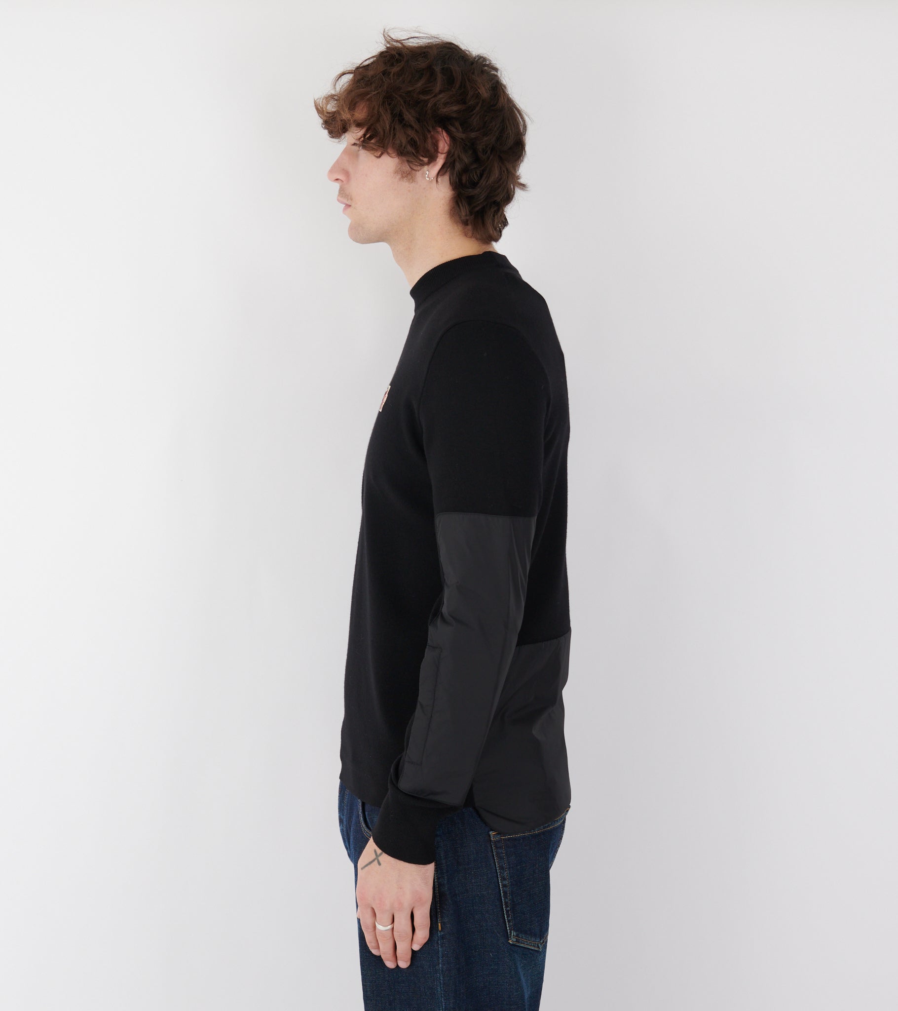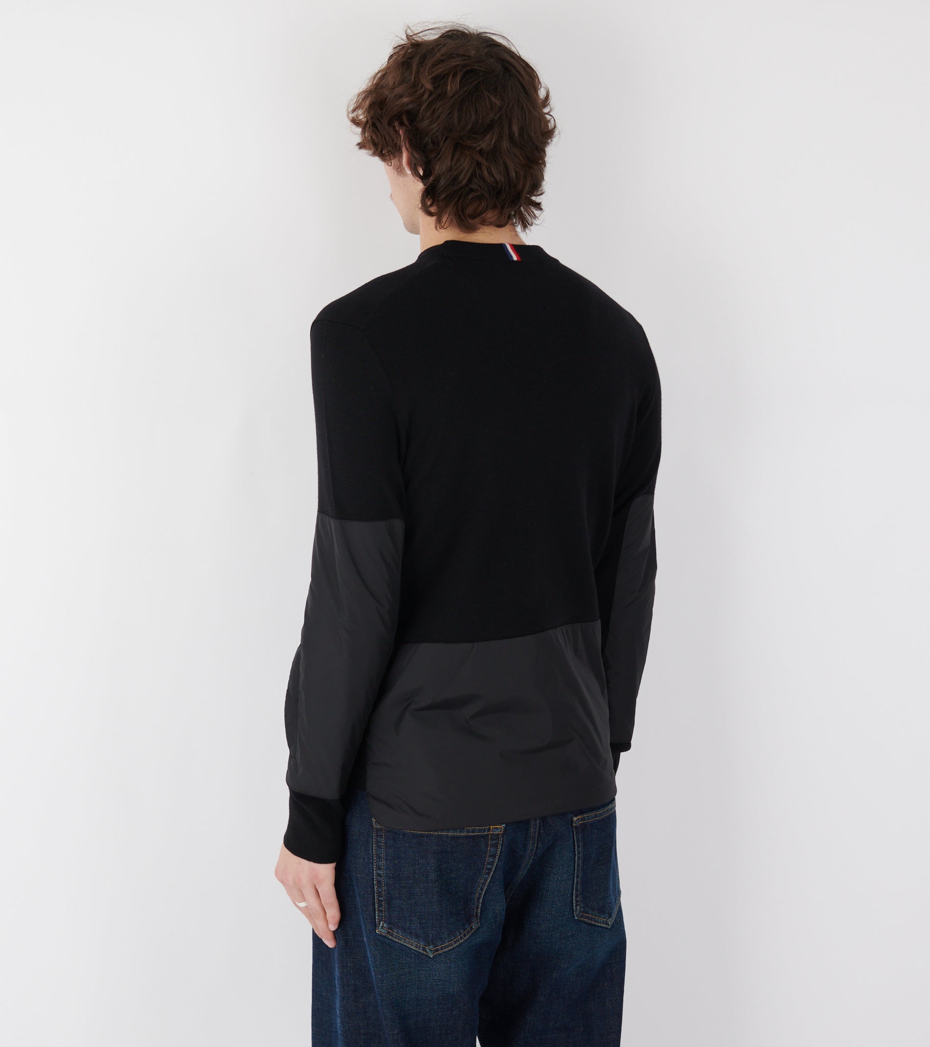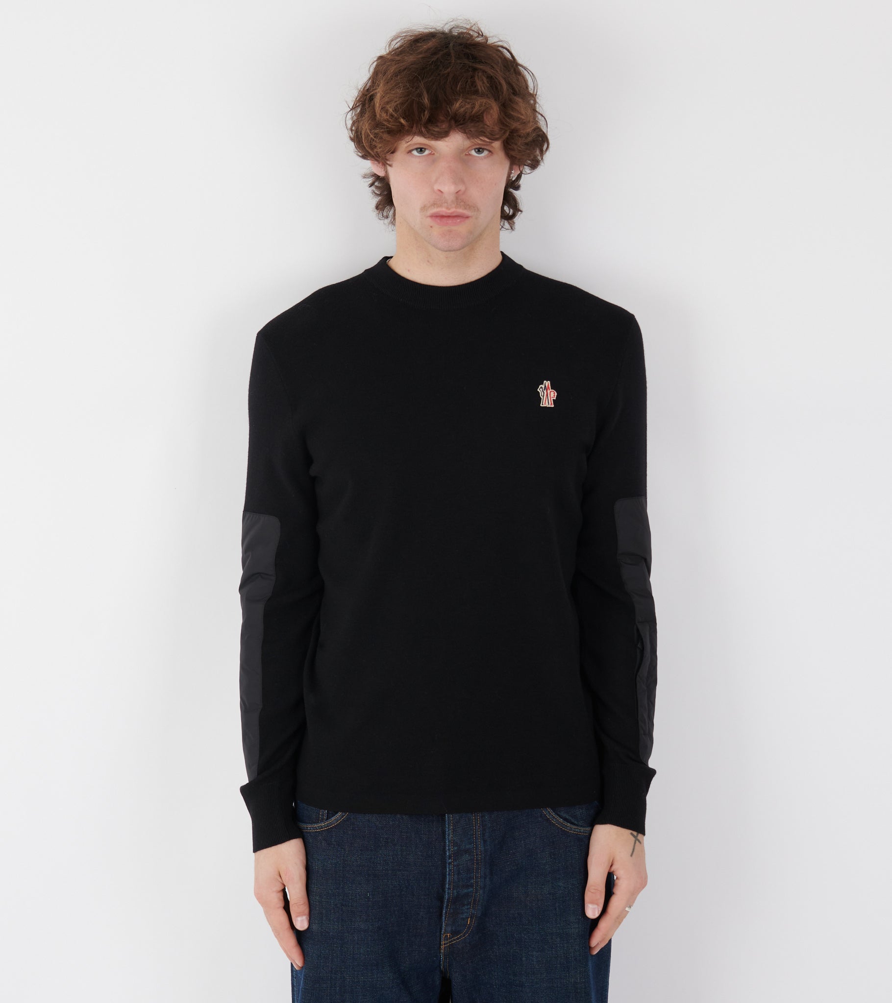 Sort strik i uld fra Moncler Grenoble. Strikken har en rund hals og detaljer i nylon. På venstre ærme er en lynlåslomme. Øverst bagpå er de ikoniske 'Tricolor Stripes'. Ved venstre bryst er et broderet logo.