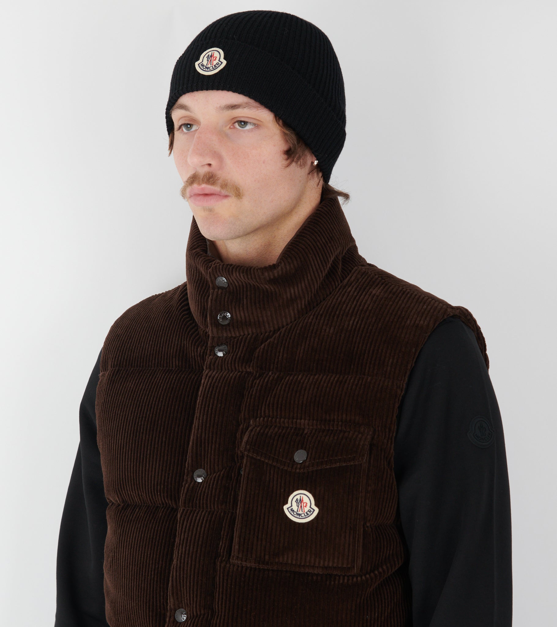 Sort ribstrikket hue i jomfru uld fra Moncler.