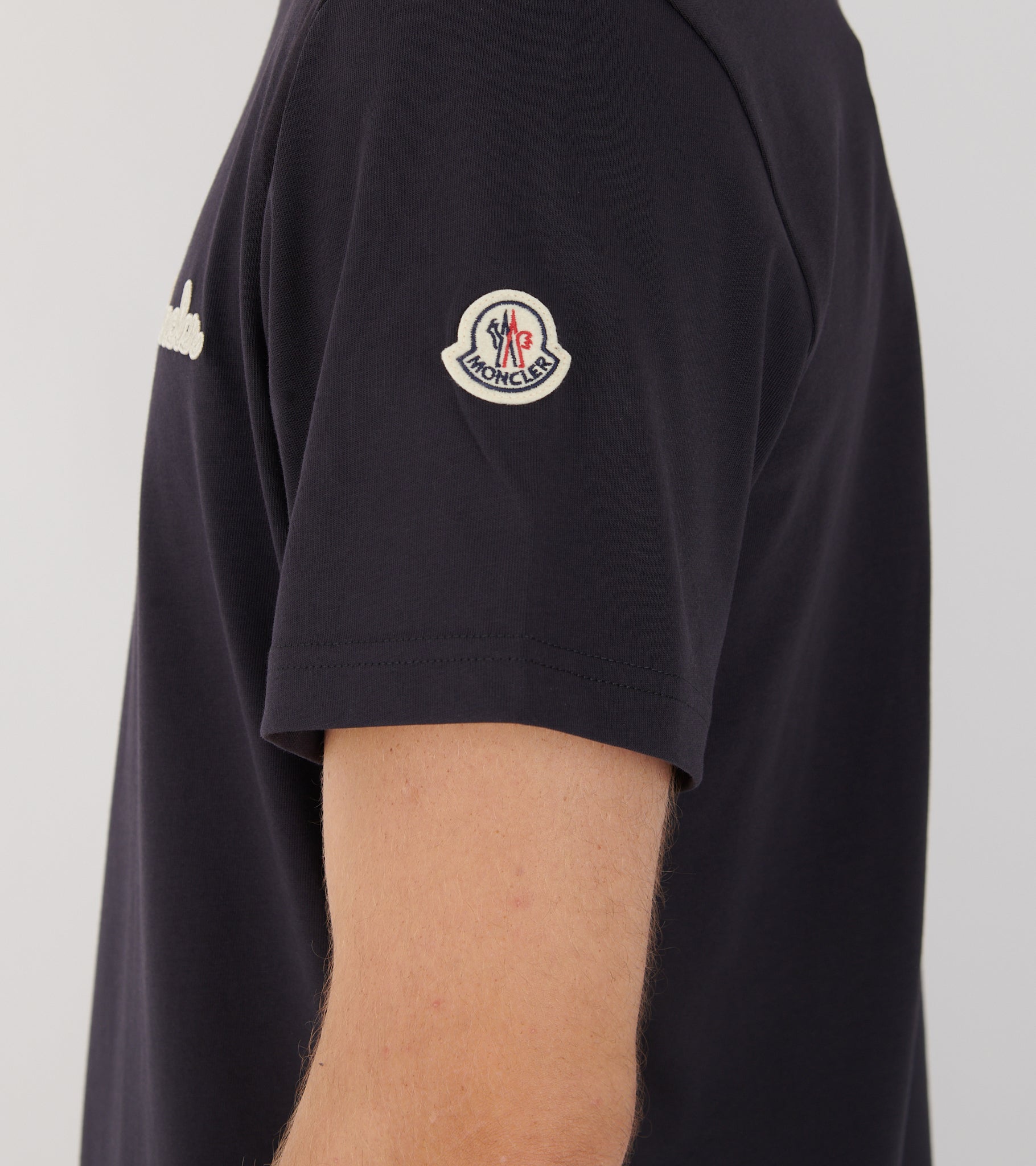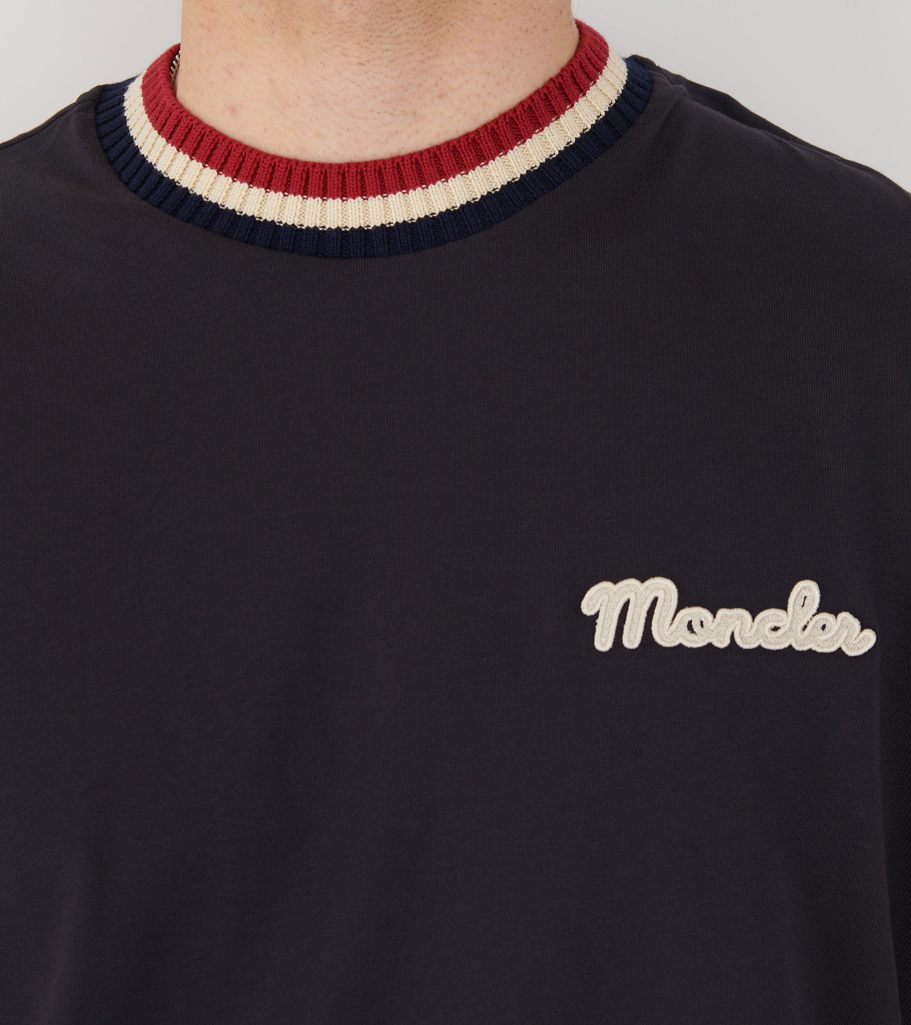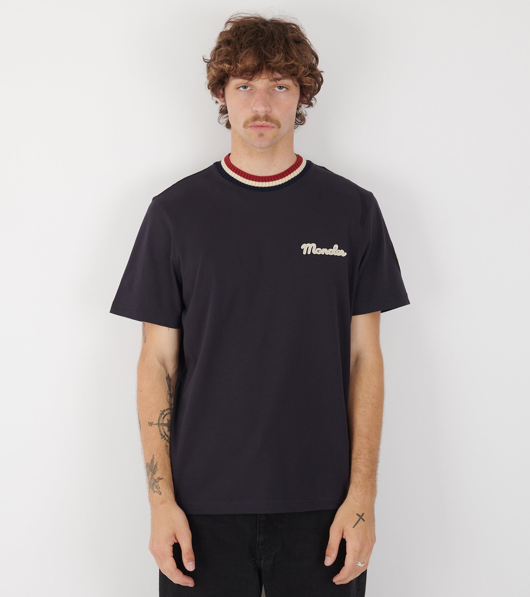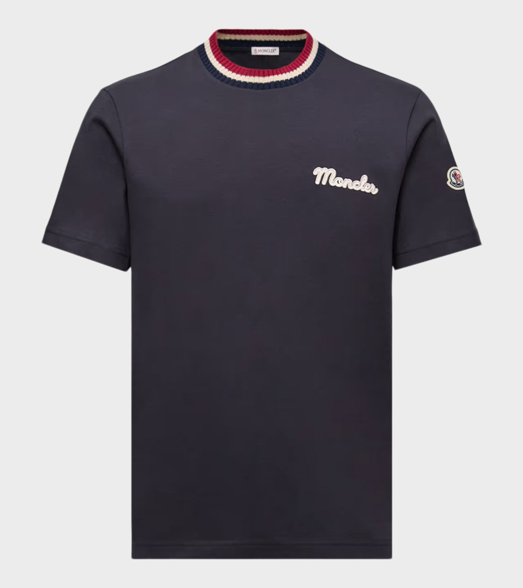 Navy t-shirt i bomuld fra Moncler. T-shirten har en ribstrikket rund hals i de ikoniske 'Tricolor stripes'. Ved venstre bryst er et broderet logo og på venstre ærme er det ikoniske logo i filt.