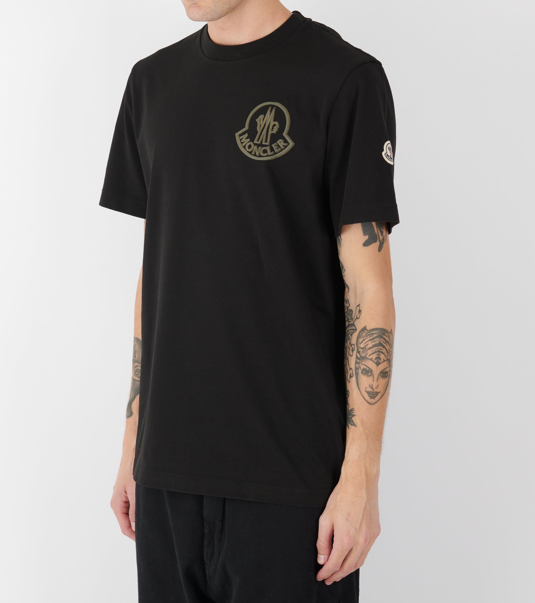Sort t-shirt med et logo ved venstre bryst fra Moncler. Logoet er olivengrønt og er både printet samt i en tekstur velour-kvalitet. På venstre ærme er det ikoniske logo i filt.