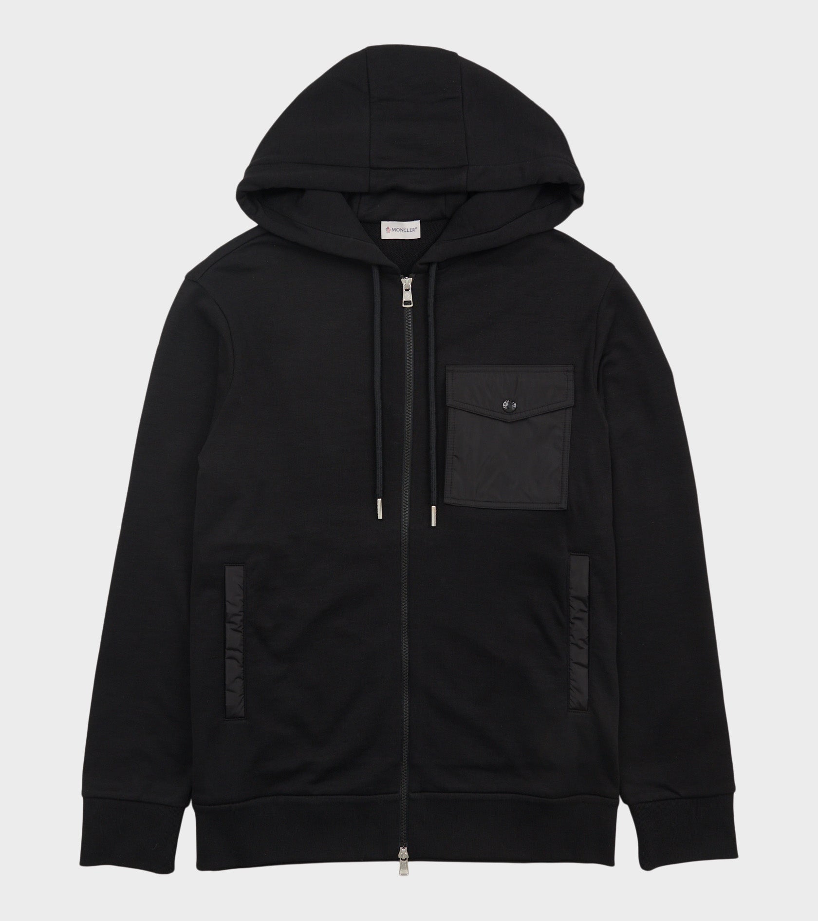 Sort hættetrøje med detaljer i nylon fra Moncler. Hættetrøjen har en klassisk hætte med snore, en dobbeltgående lynlåslukning, en skrålomme i hver side samt en brystlomme med en logo-trykknap. På venstre ærme er det ikoniske logo i filt.