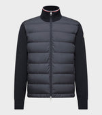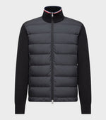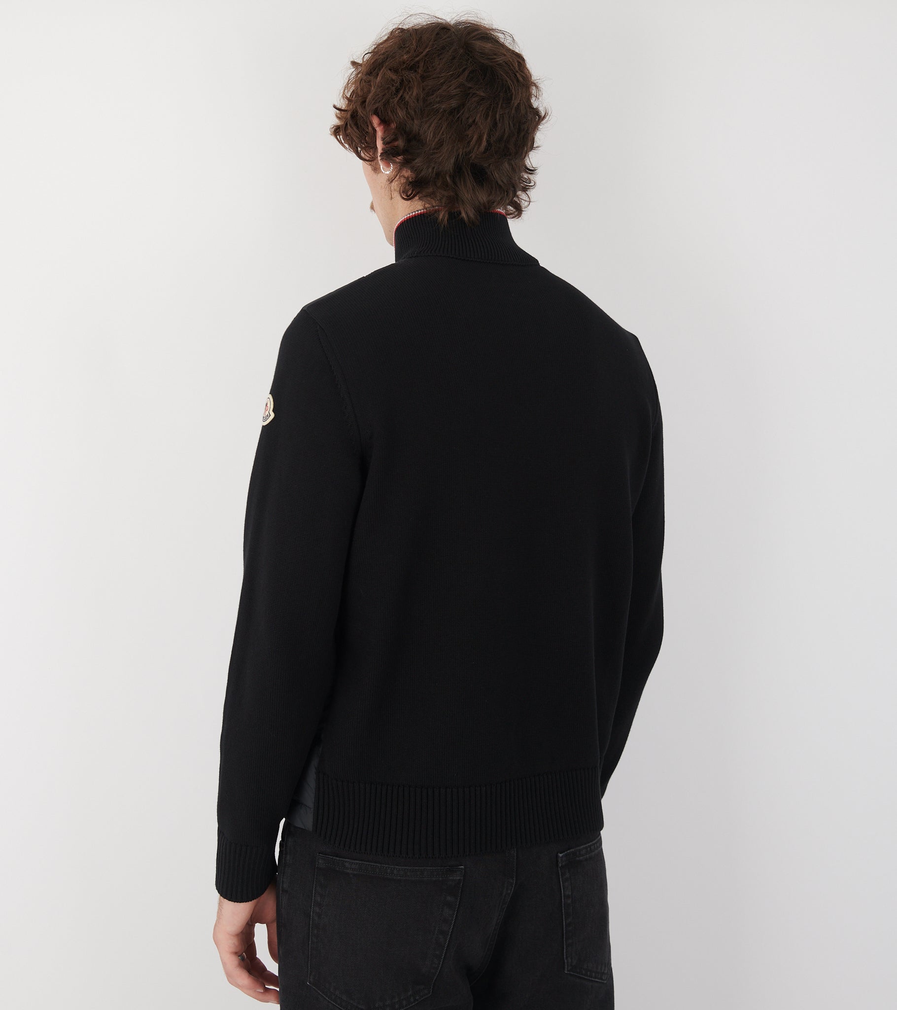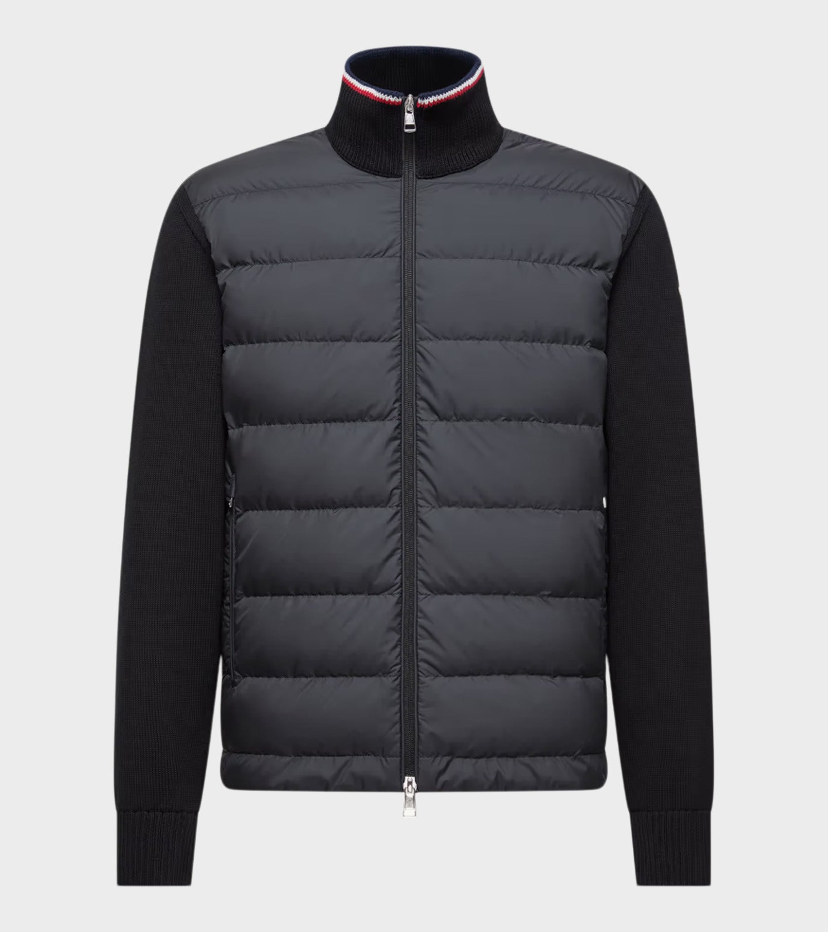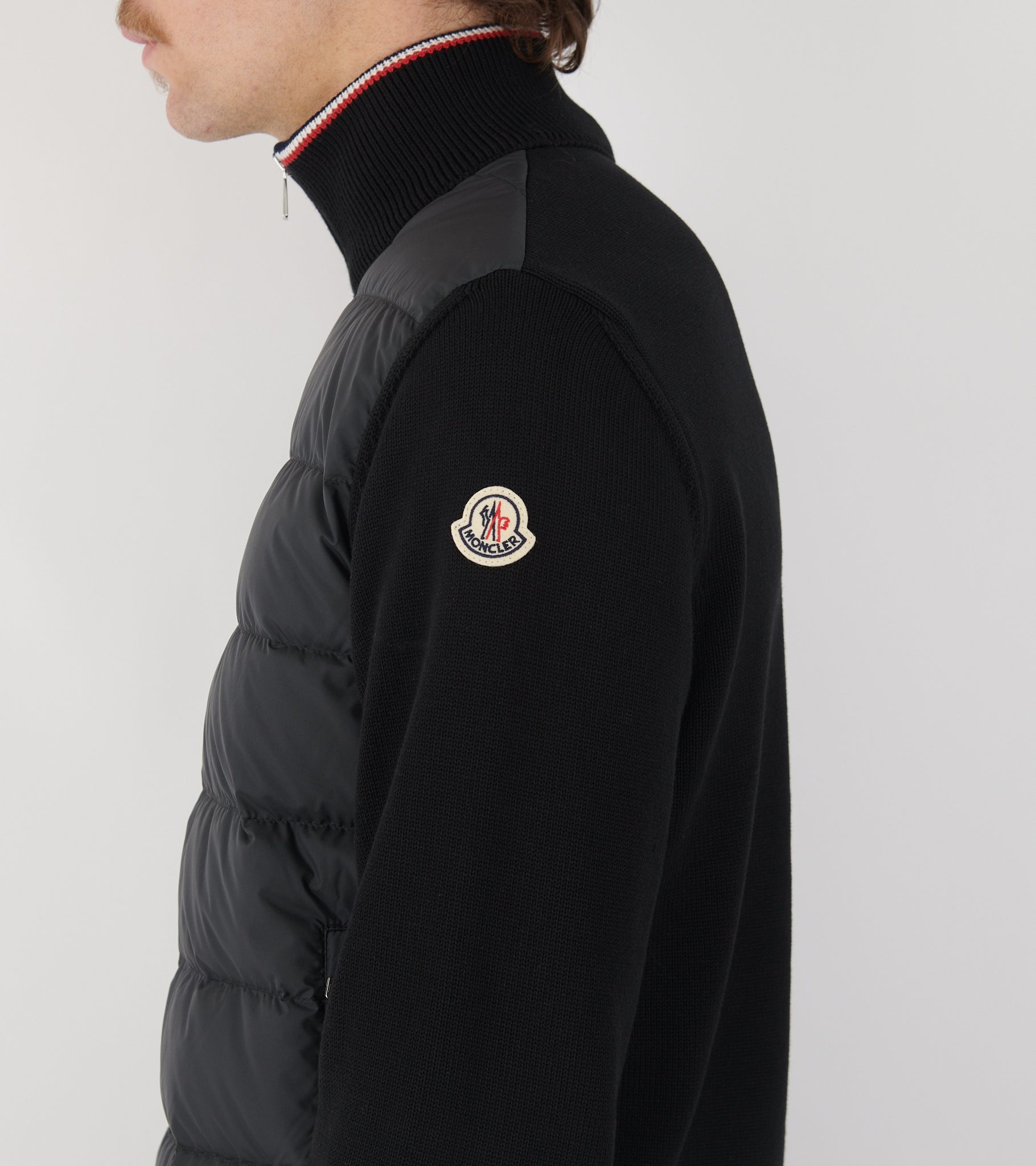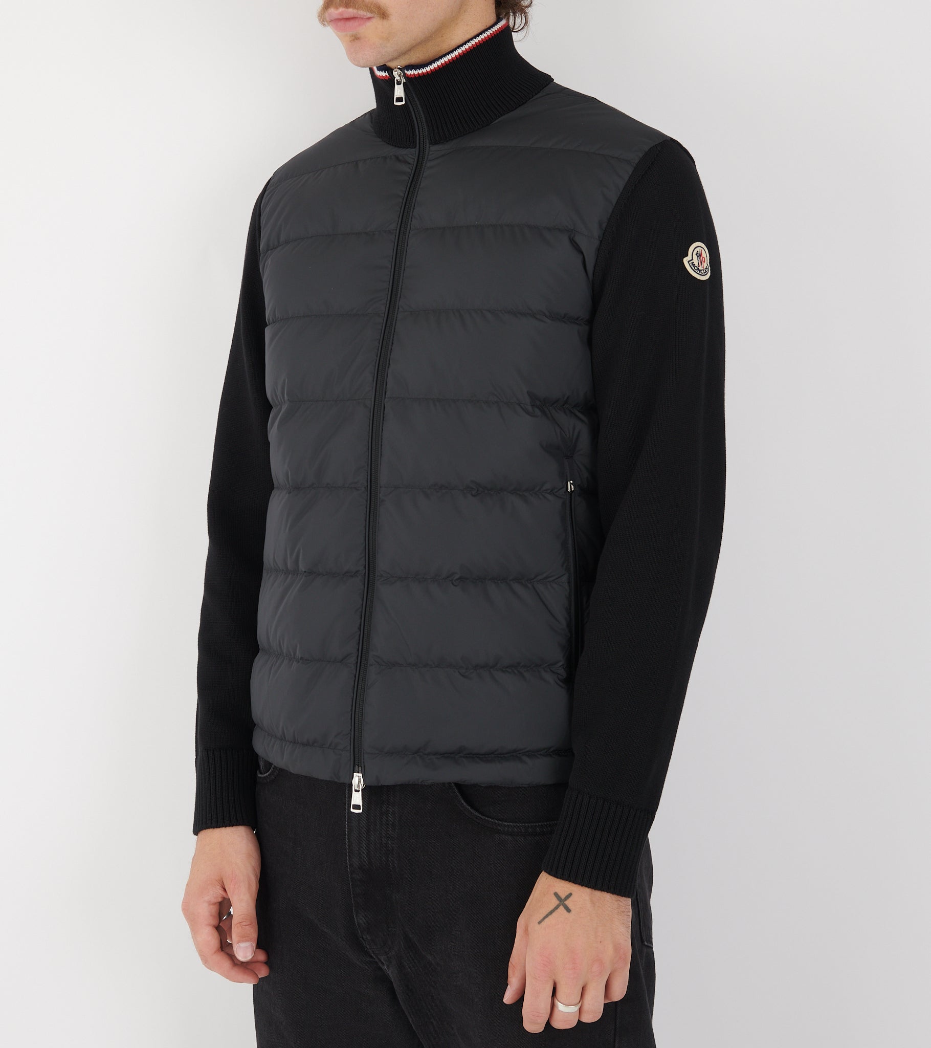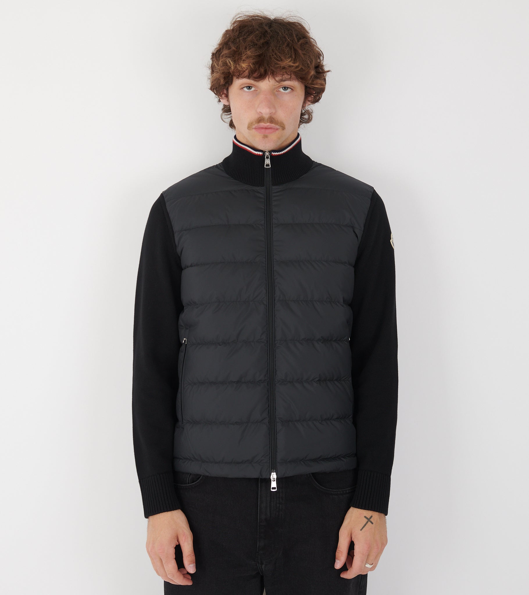 Cardigan Tricot i sort fra Moncler. Denne jakke er fremstillet i bomuldsgarn og har en front i polyester - fronten er foret med bløde dun og fjer. Jakken har en dobbeltgående lynlåslukning samt Tricolor Stripes øverst ved kraven. På venstre ærme er det ikoniske logo i filt.