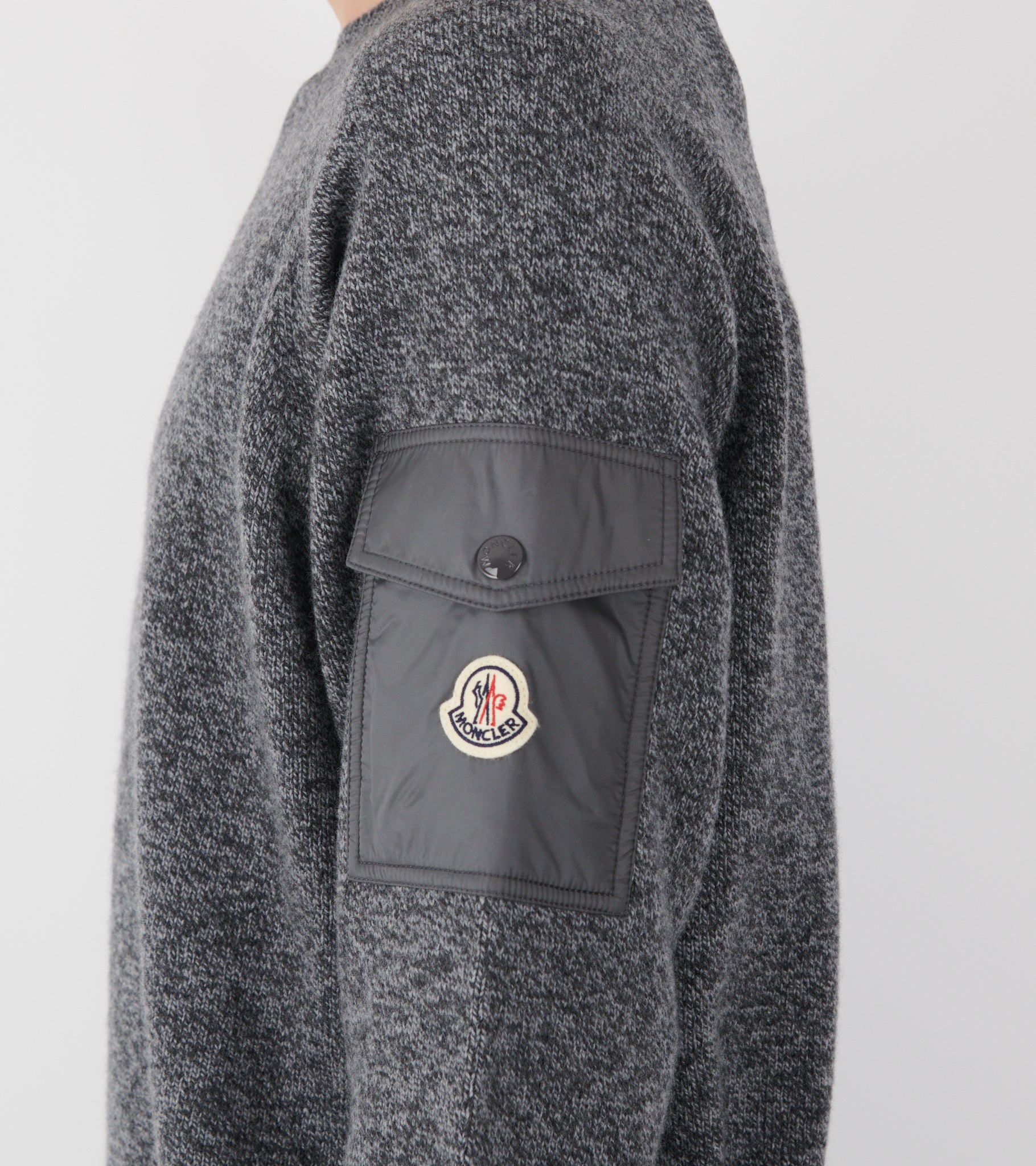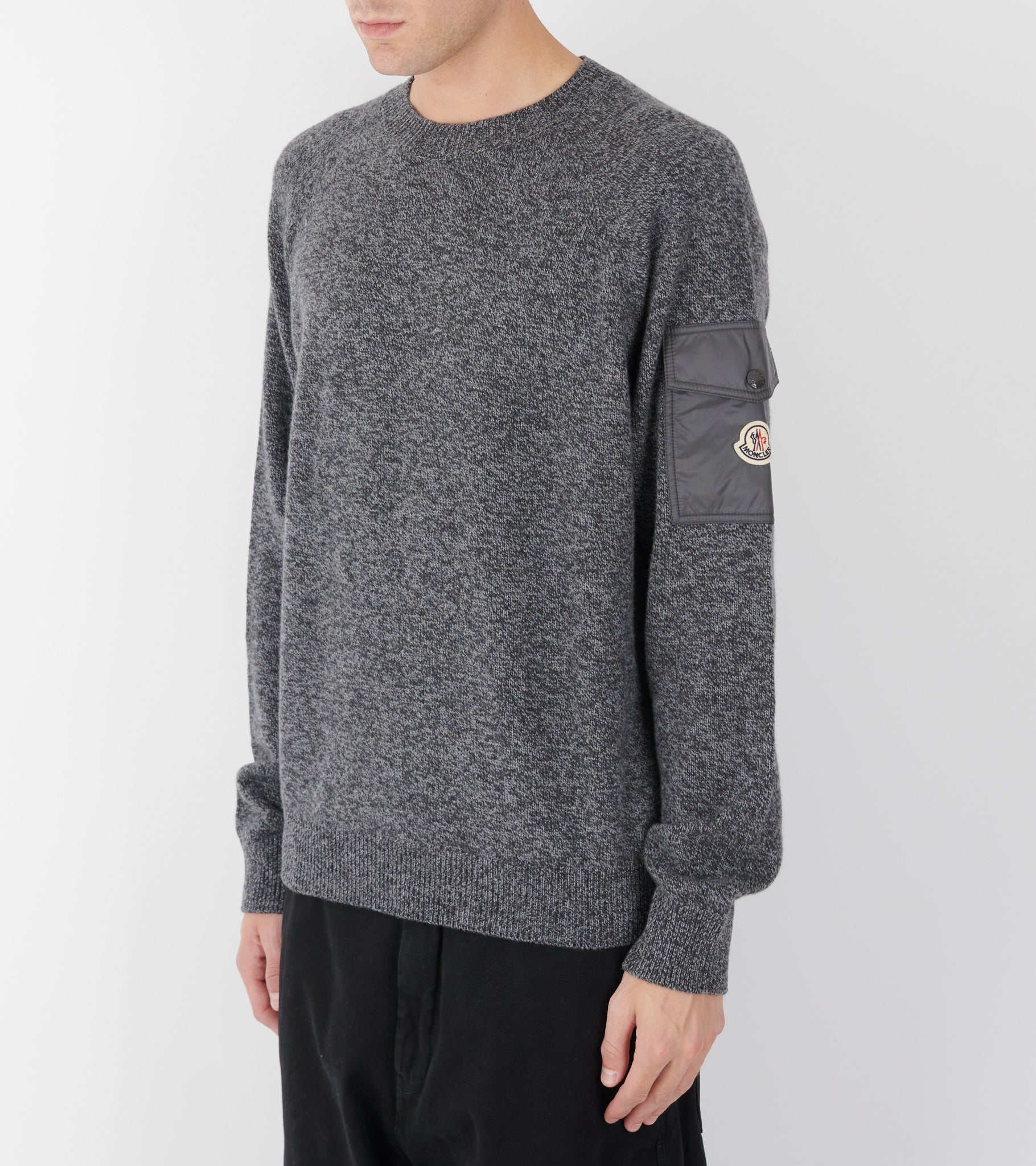 Mørkegrå meleret strik fra Moncler. Denne strik er fremstillet i en blanding af jomfru uld og kashmir. På venstre ærme er en lomme i nylon med en logo-trykknap - på lommen er det ikoniske logo i filt.