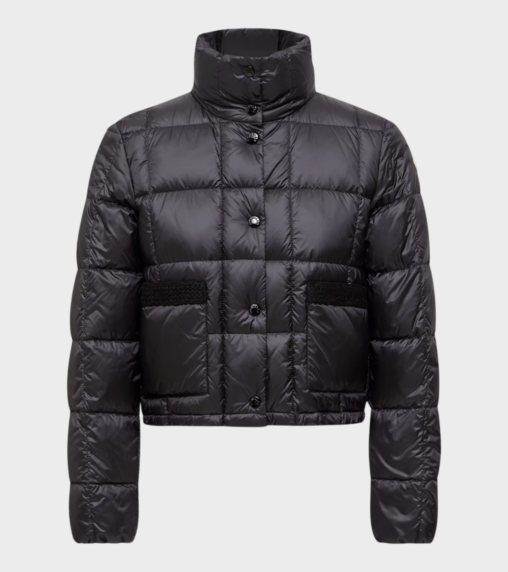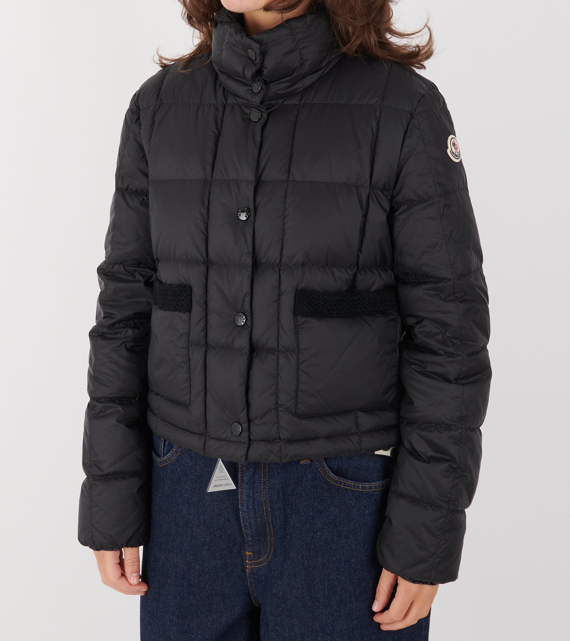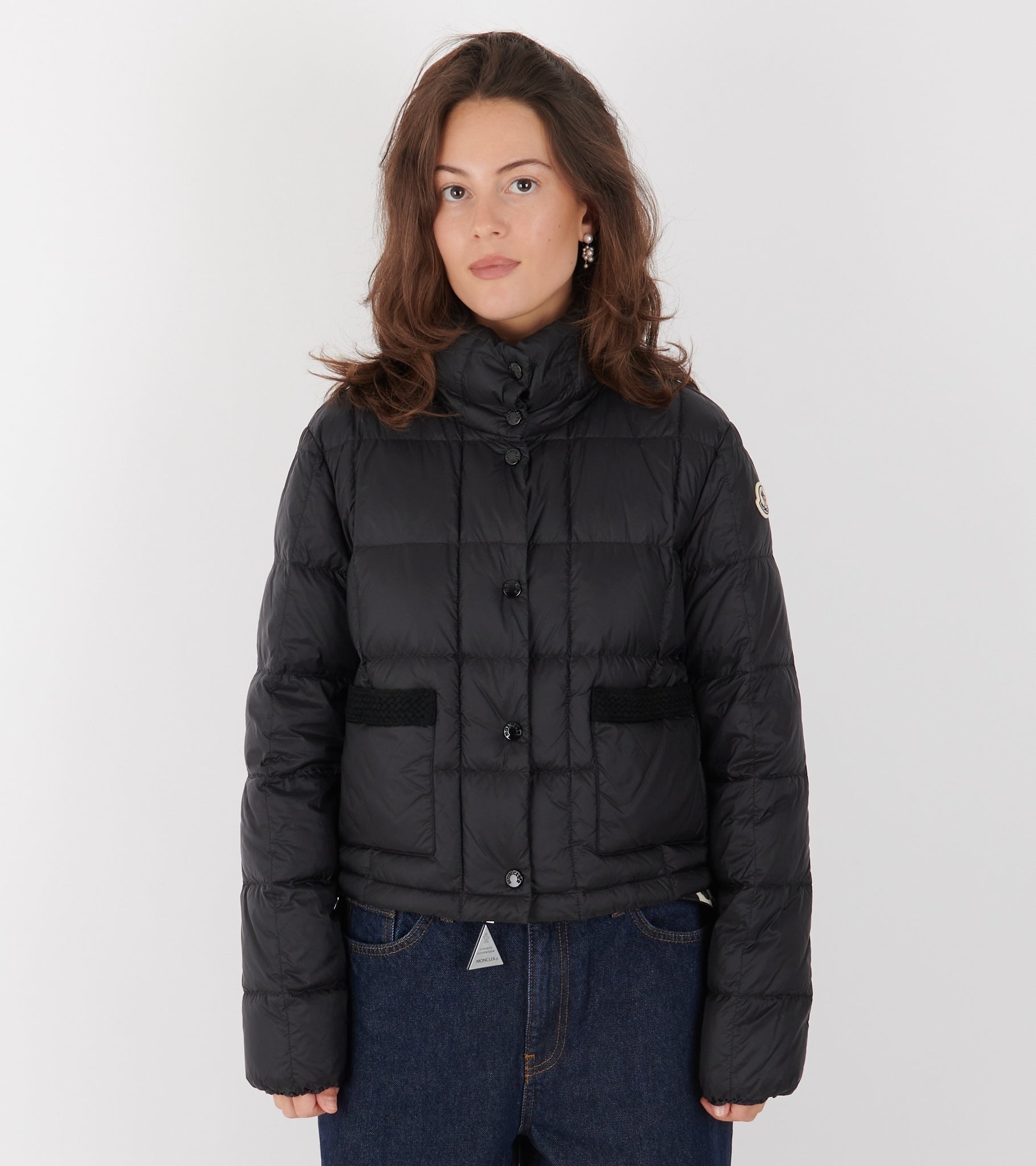 Sort cropped dunjakke fra Moncler. Jarcieu Braided Trim Down Jacket Black er fremstillet i nylon og er foret med bløde dun og fjer. Jakken har en høj hals, to lommer på fronten, en skjult lynlåslukning samt en trykknaplukning med sorte logo-trykknapper. Over lommerne er flettede detaljer. På venstre ærme er det ikoniske logo i filt.