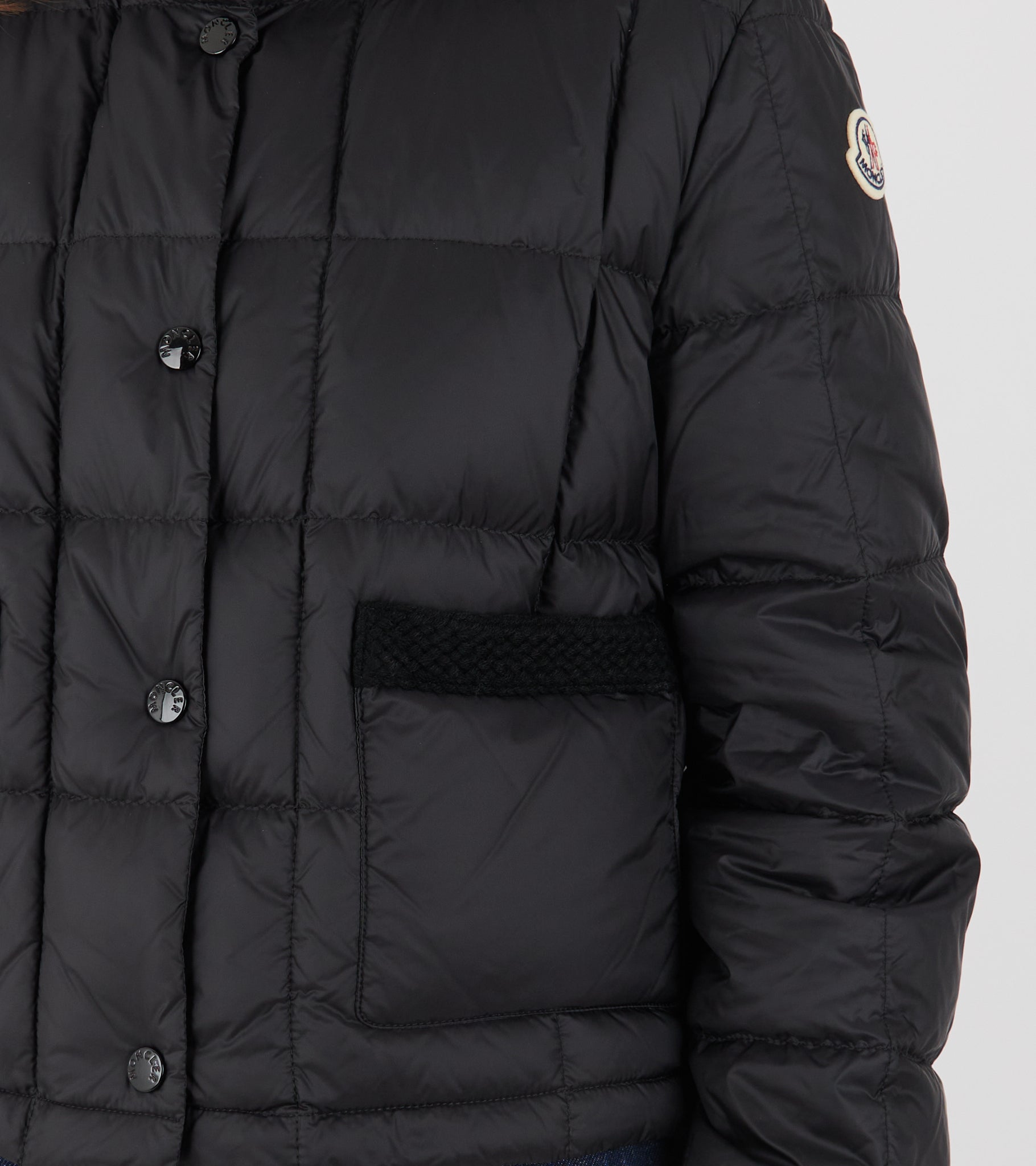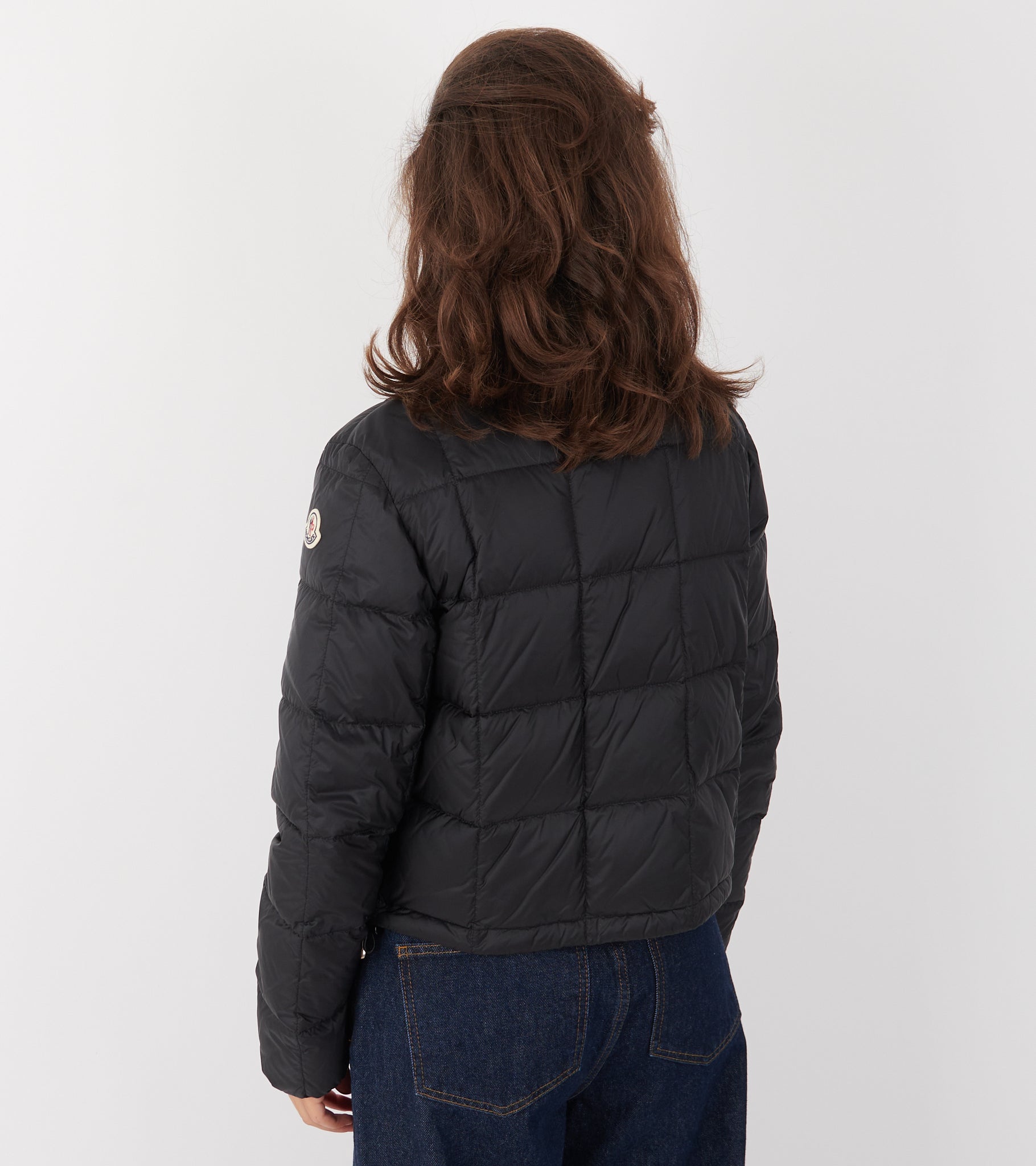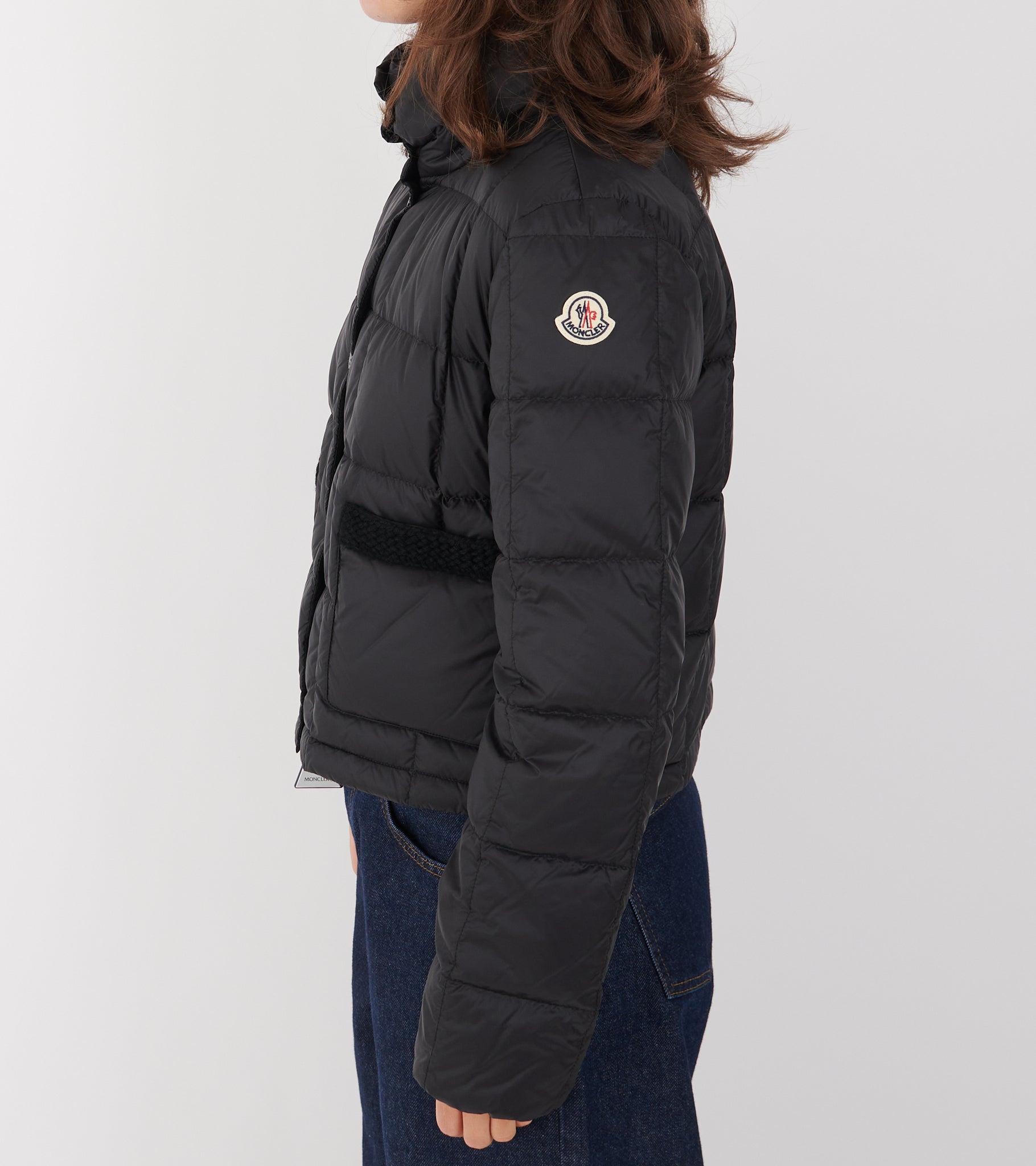 Sort cropped dunjakke fra Moncler. Jarcieu Braided Trim Down Jacket Black er fremstillet i nylon og er foret med bløde dun og fjer. Jakken har en høj hals, to lommer på fronten, en skjult lynlåslukning samt en trykknaplukning med sorte logo-trykknapper. Over lommerne er flettede detaljer. På venstre ærme er det ikoniske logo i filt.