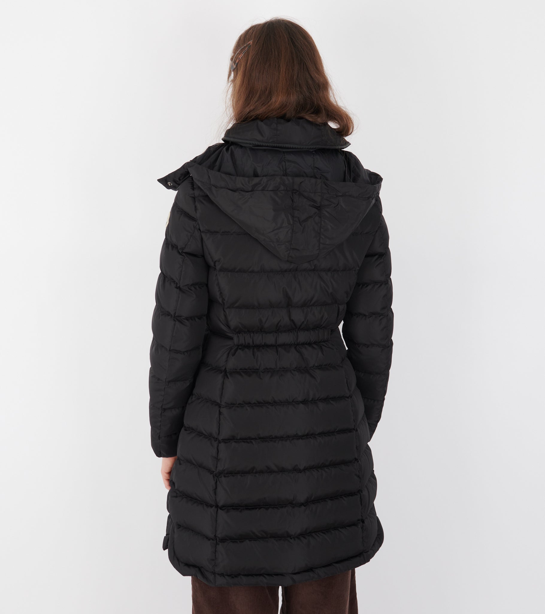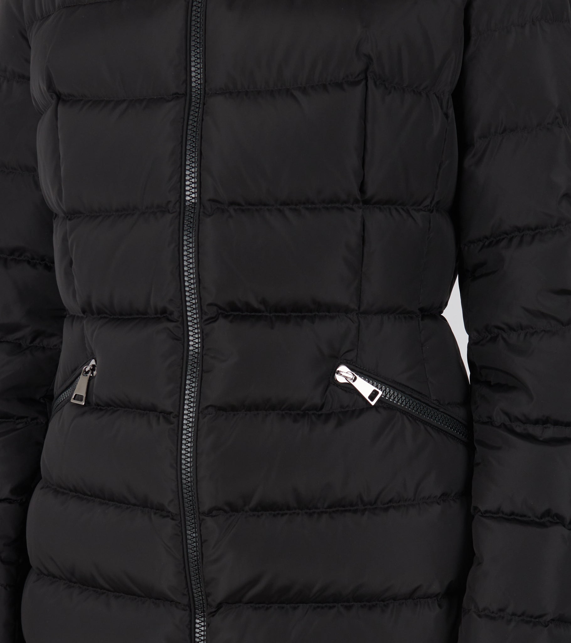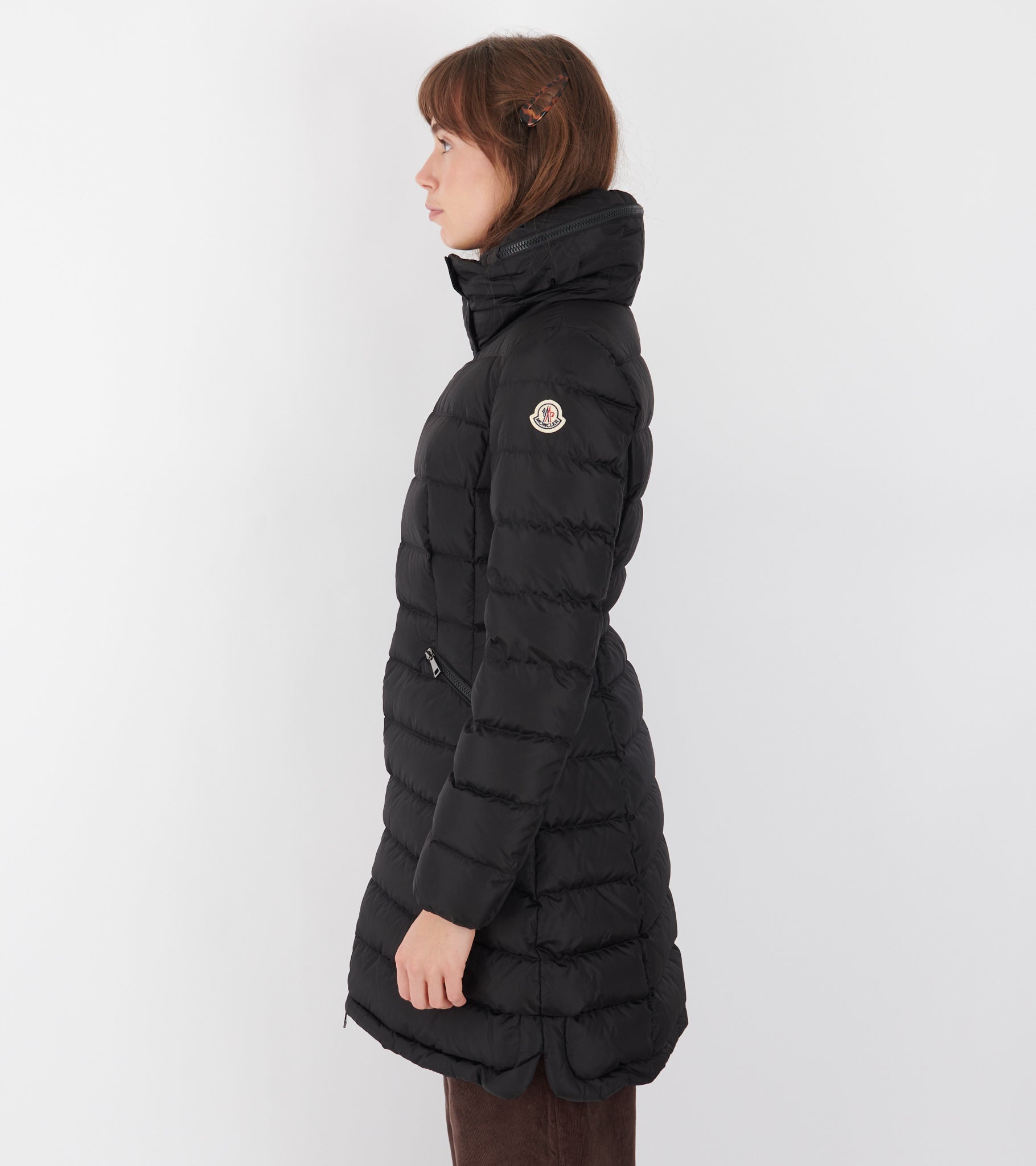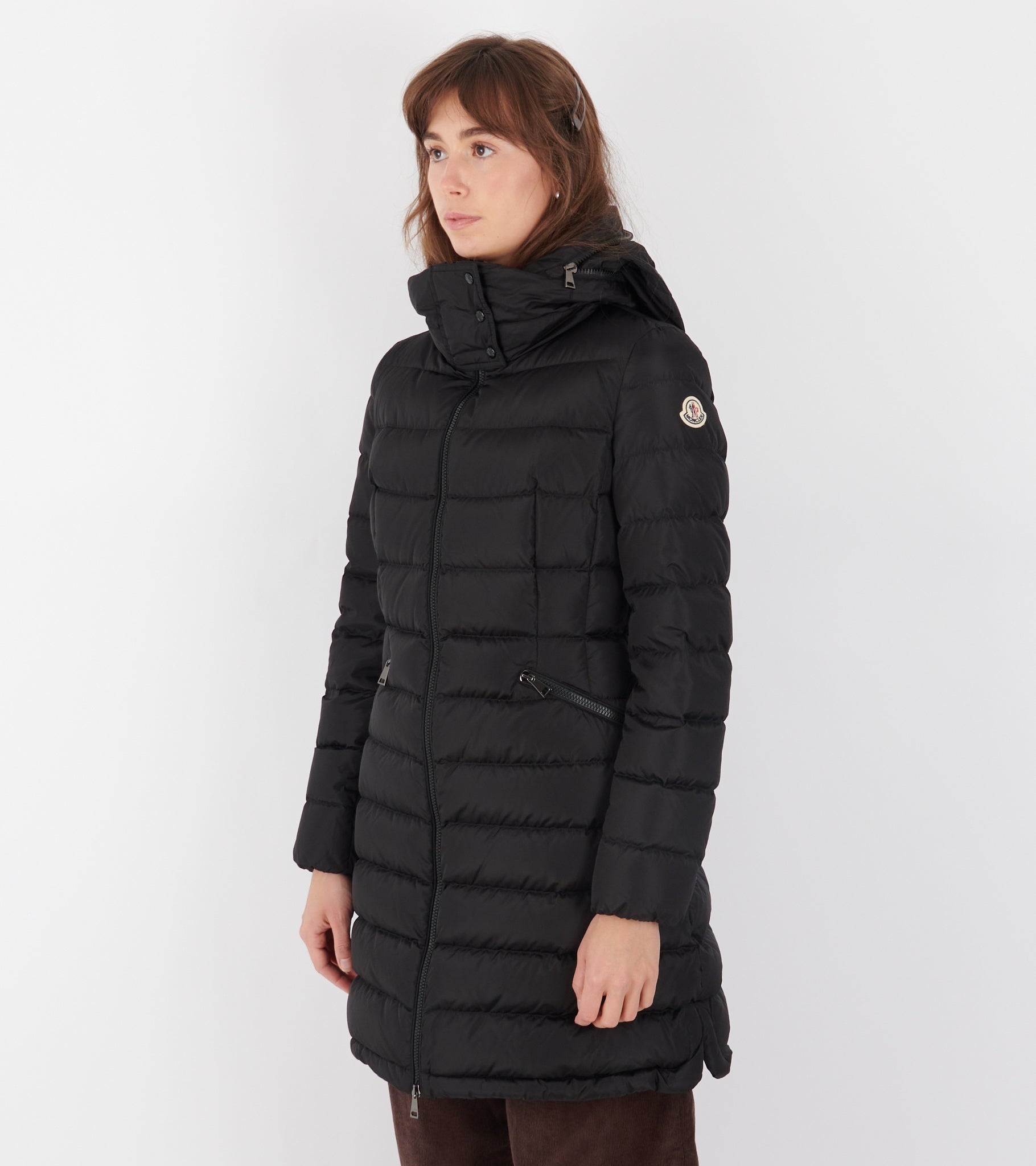 Mellemlang sort dunjakke fra Moncler. Flammette Hooded Long Down Jacket Black er fremstillet i nylon og er foret med bløde dun og fjer. Jakken en høj hals, en skjult hætte i kraven, en dobbeltgående lynlåslukning samt en lynlåslomme i hver side. På venstre ærme er det ikoniske logo i filt.