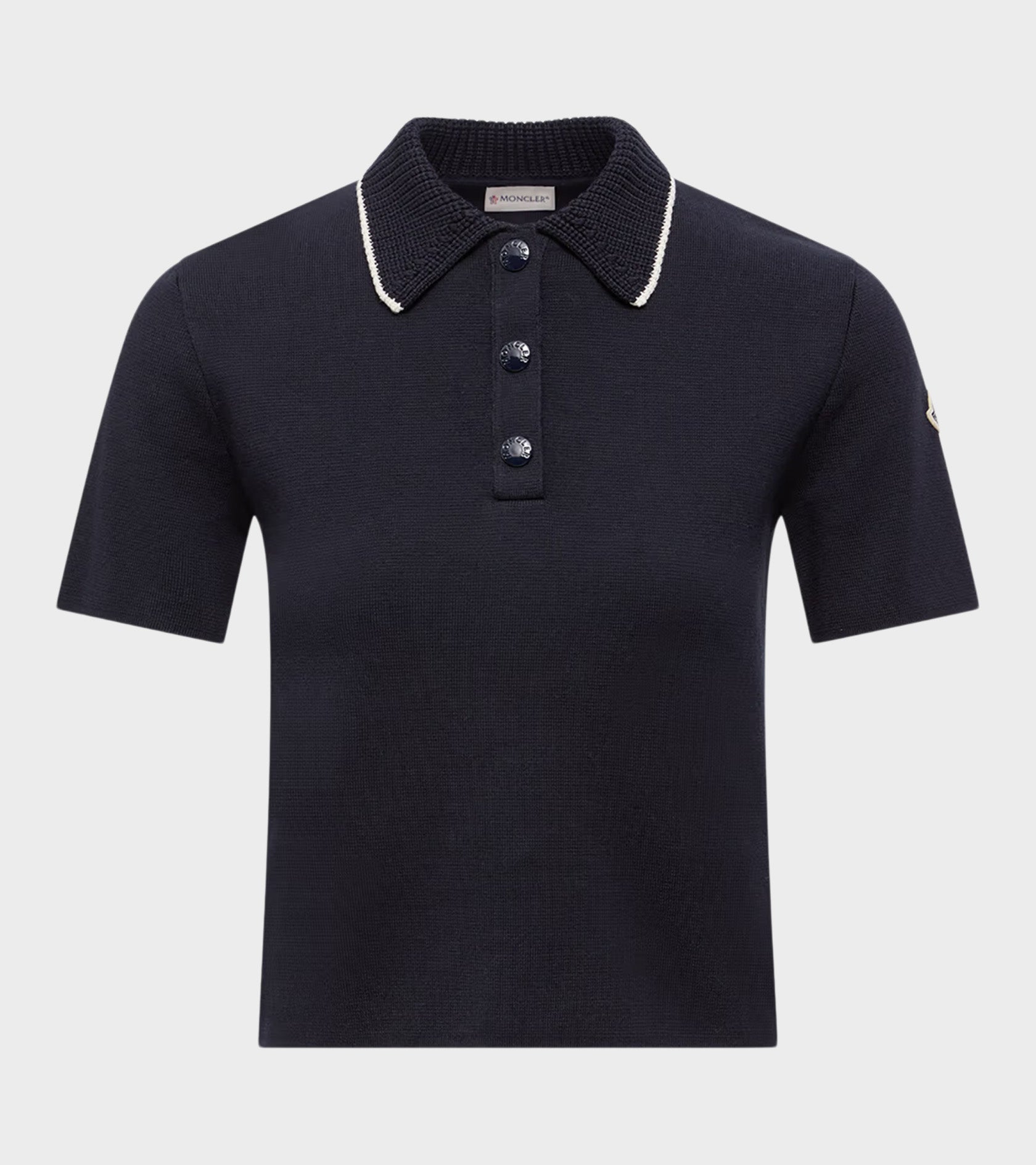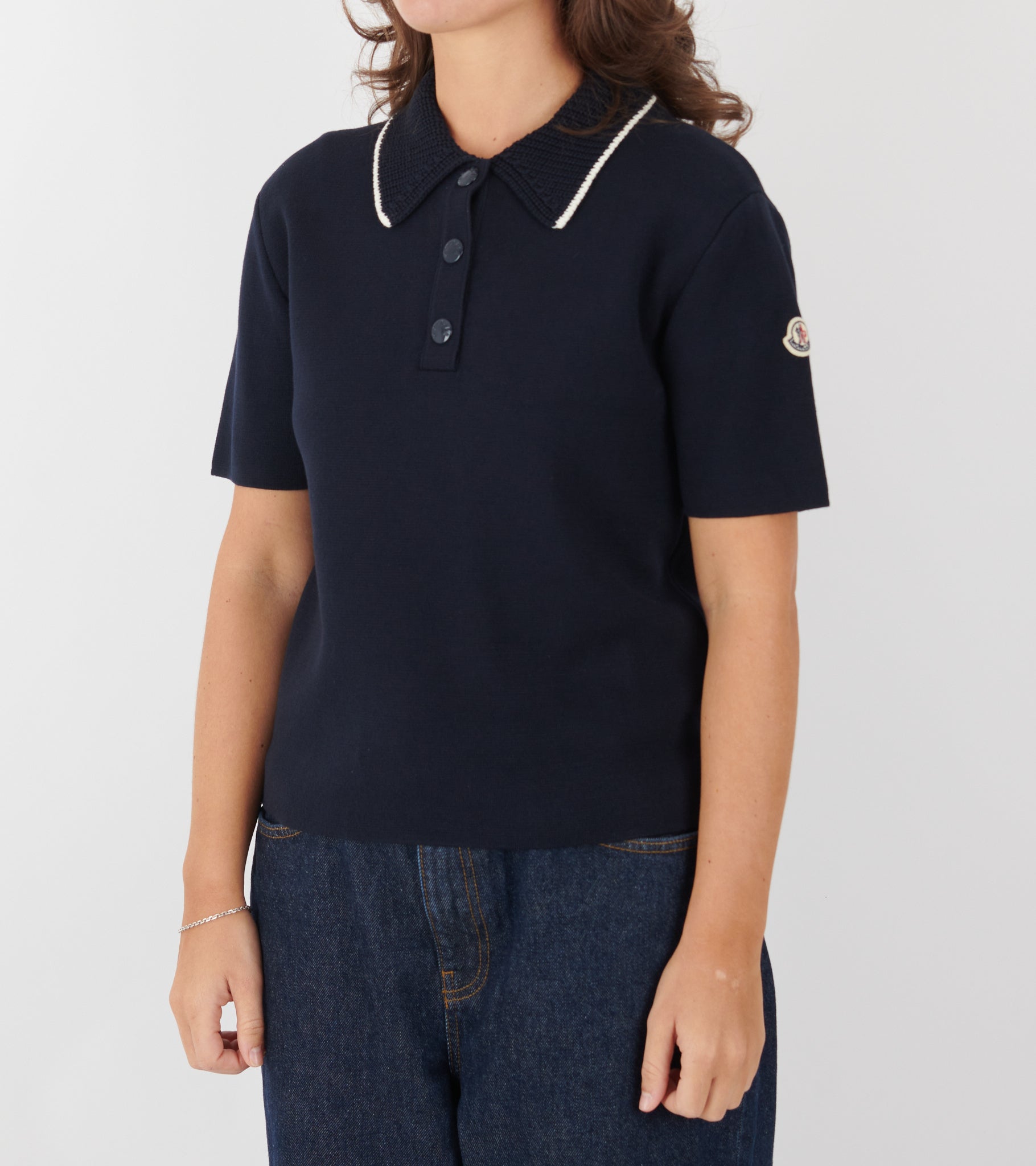 Strikket kortærmet polo i bomuldsgarn fra Moncler. Denne polo har en ribstrikket krave med hvide kontraststriber samt en knaplukning med tre navy logo-trykknapper. På venstre ærme er det ikoniske logo i filt.