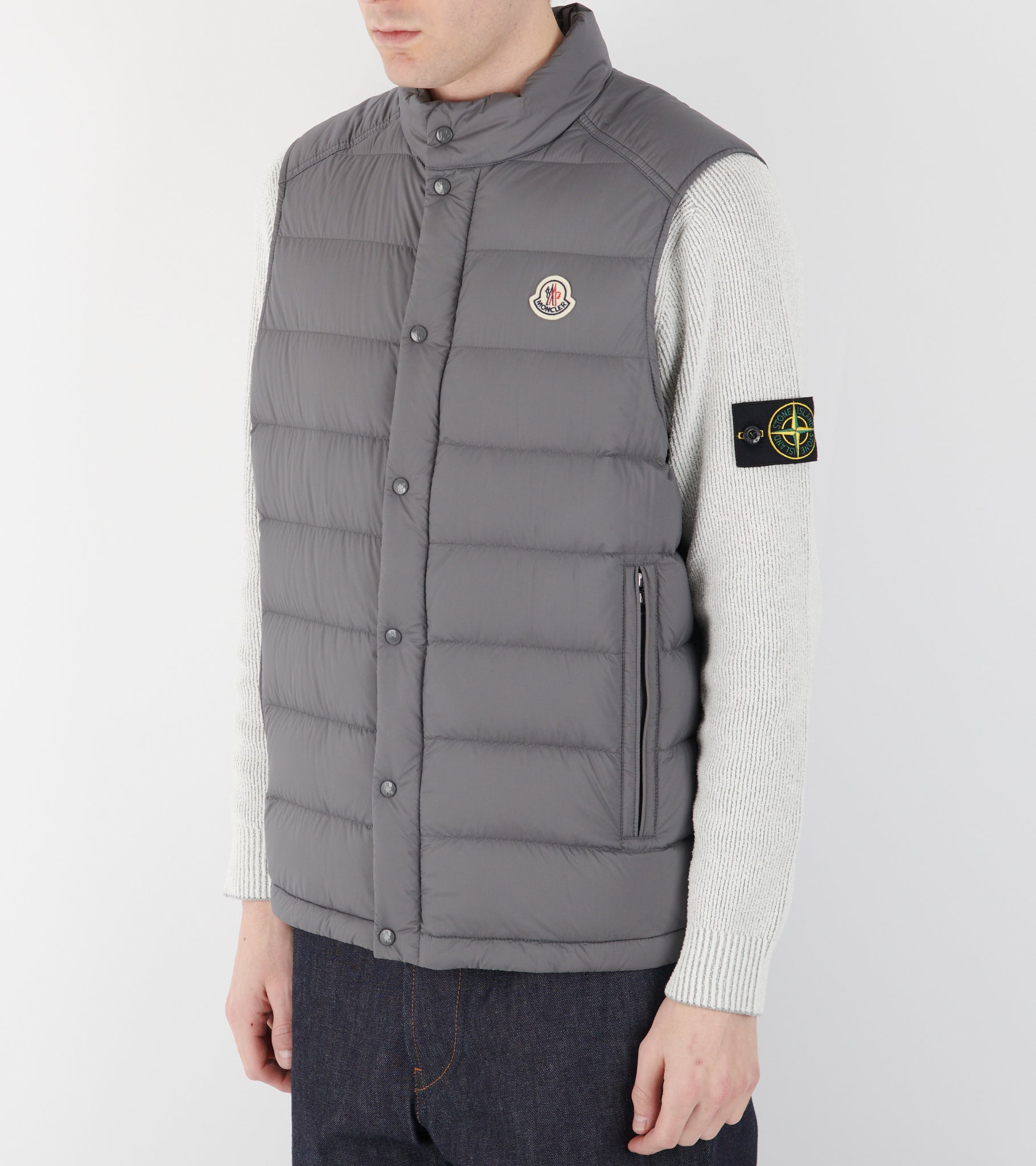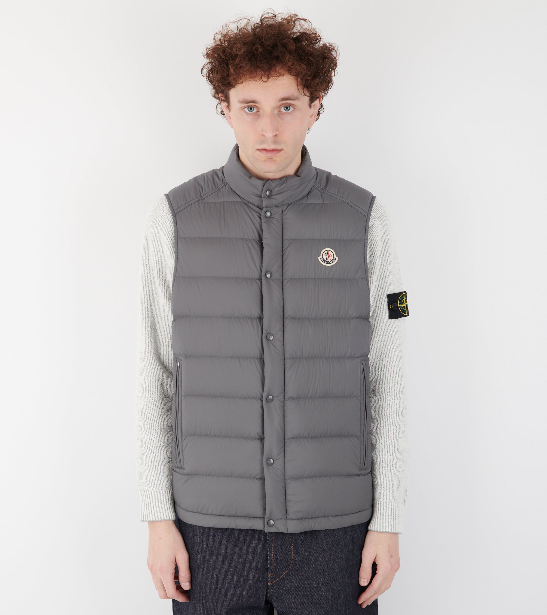 Grå dunvest fra Moncler. Barthe Down Vest Grey er fremstillet i vandafvisende nylon og er foret med bløde dun og fjer. Vesten har en skjult lynlåslukning, en trykknaplukning med logo-knapper samt en lynlåslomme i hver side. Ved venstre bryst er det ikoniske logo i filt.