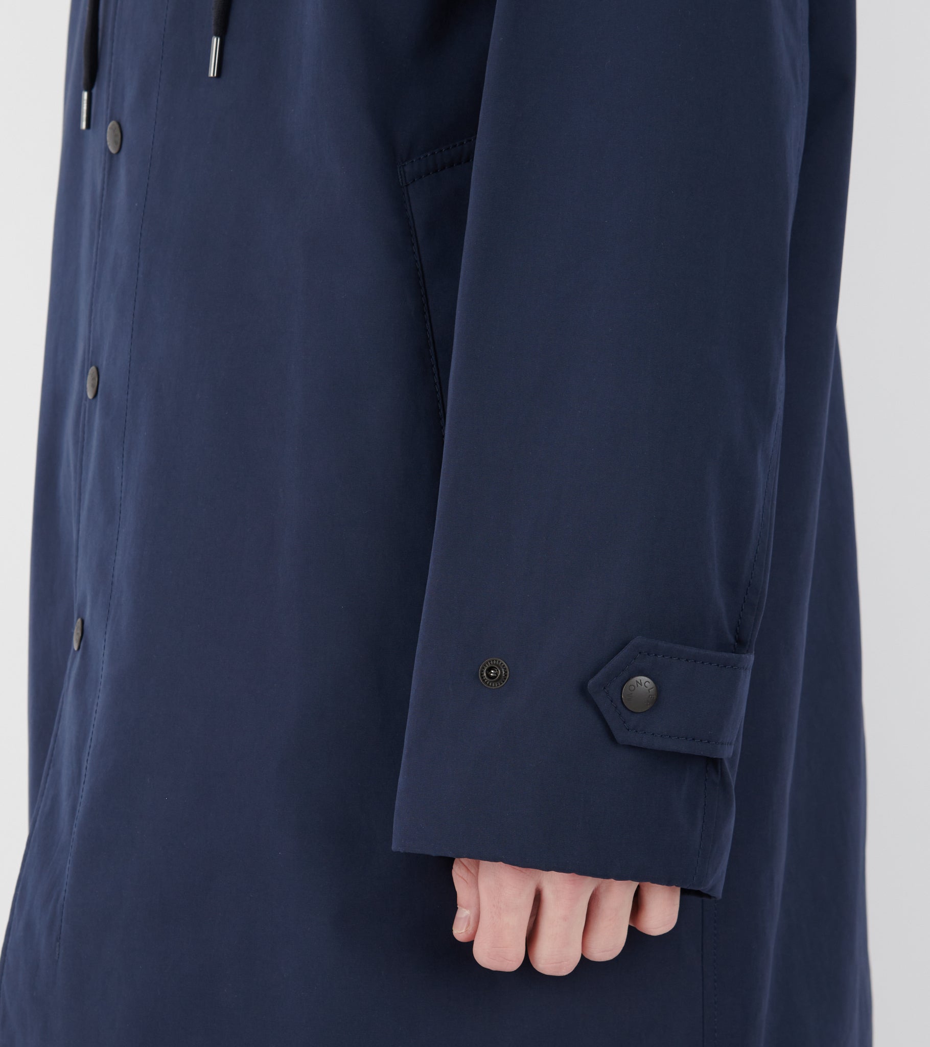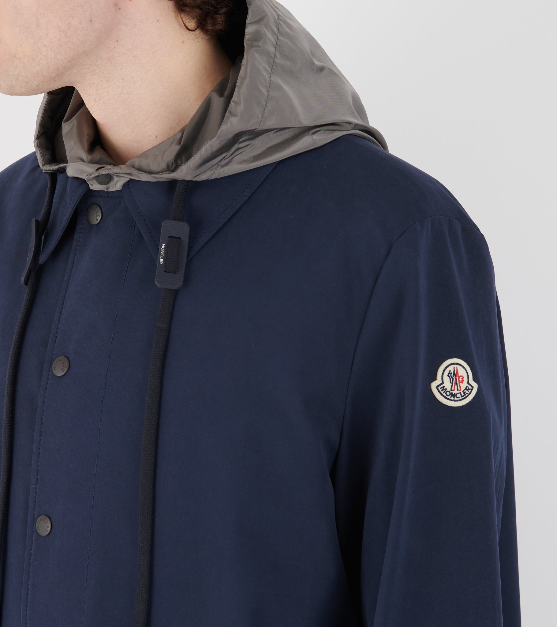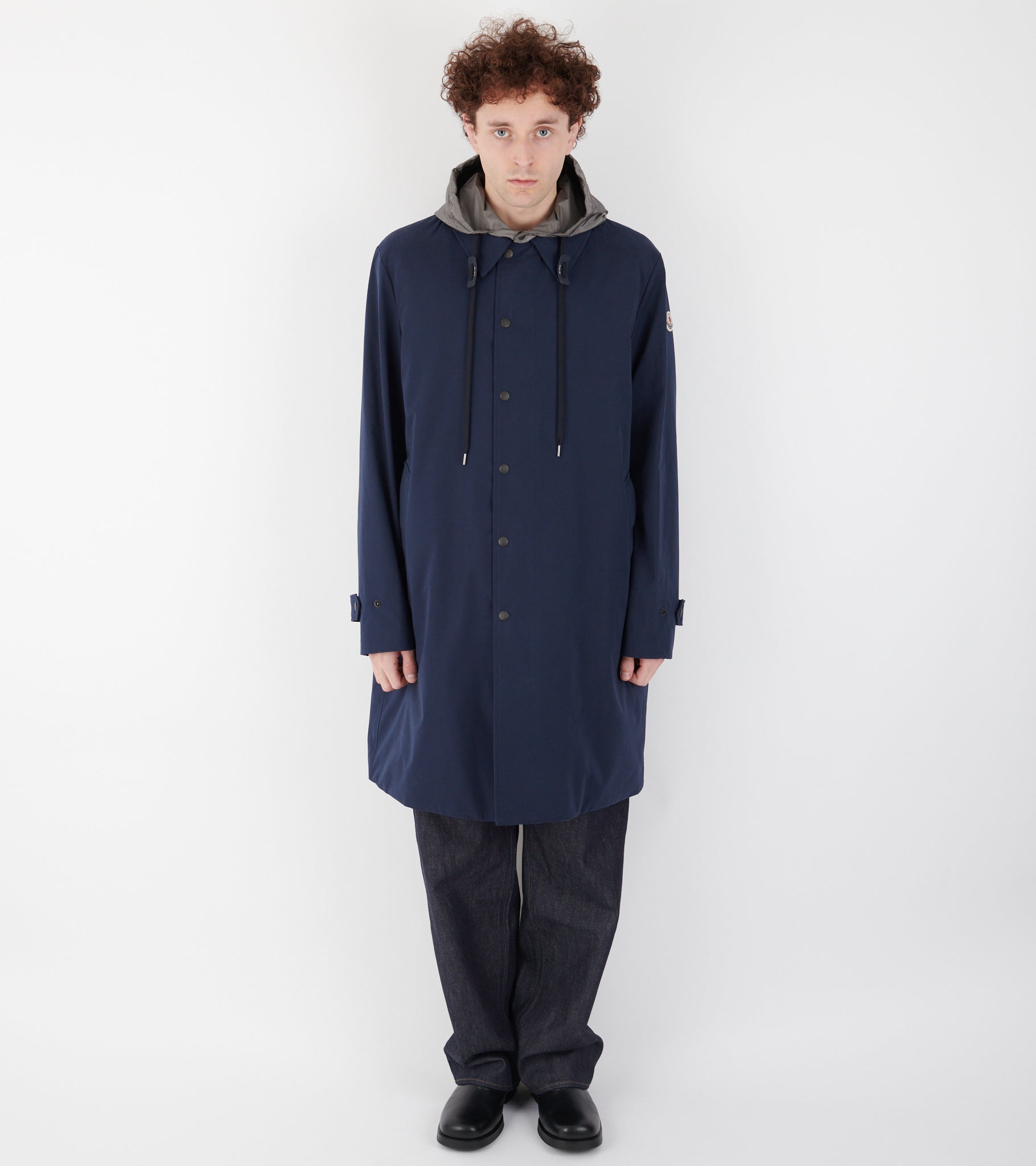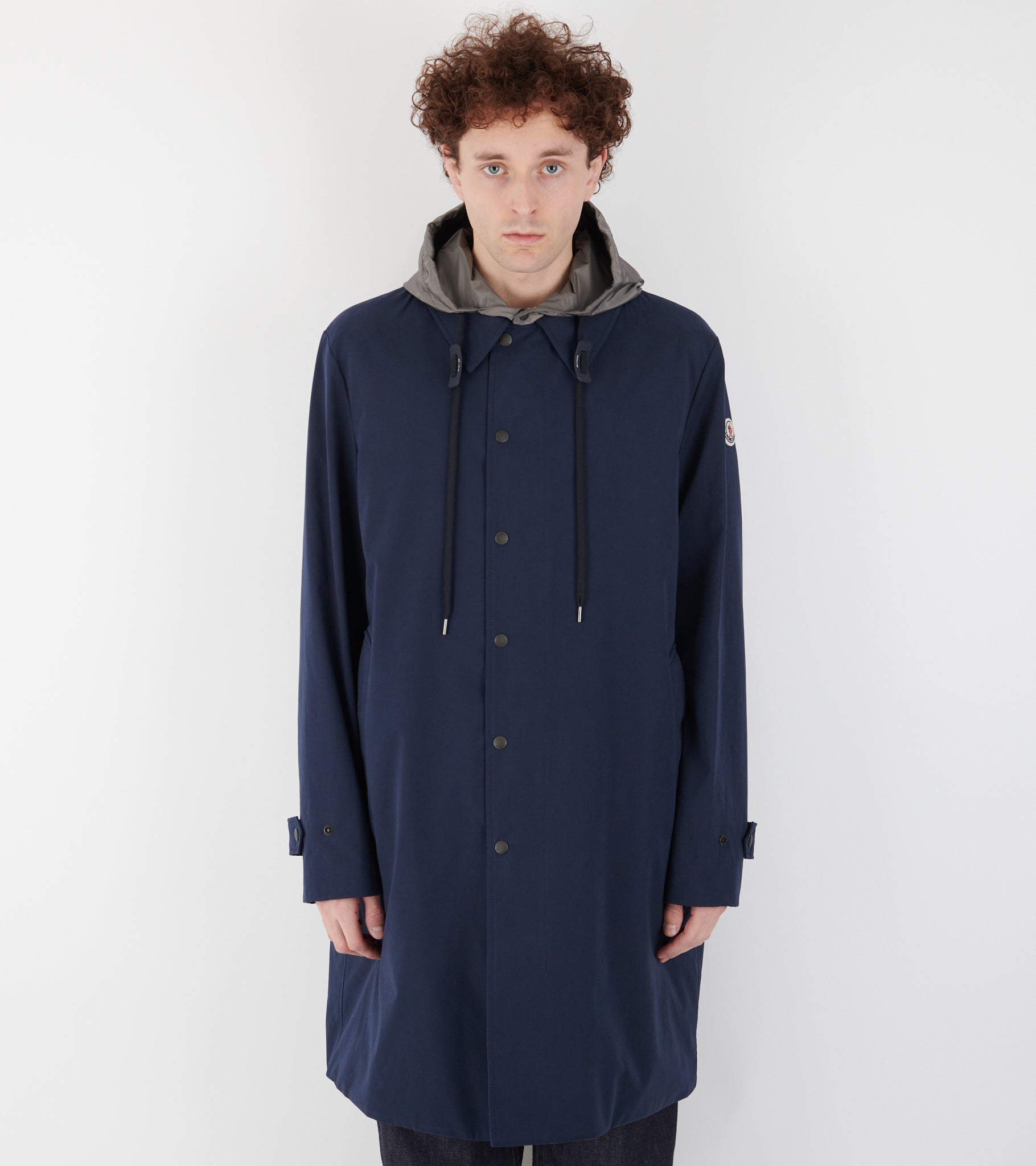 Navy frakke fra Moncler. Frakken er fremstillet i en børstet blanding af polyester og bomuld. Indvendigt er nylon, som er let foret med bløde dun og fjer. Frakken har en justerbar og aftagelig grå hætte i nylon, en klassisk krave, en skjult lynlåslukning, en trykknaplukning med logoknapper samt en skrålomme i hver side. På venstre ærme er det ikoniske logo i filt.
