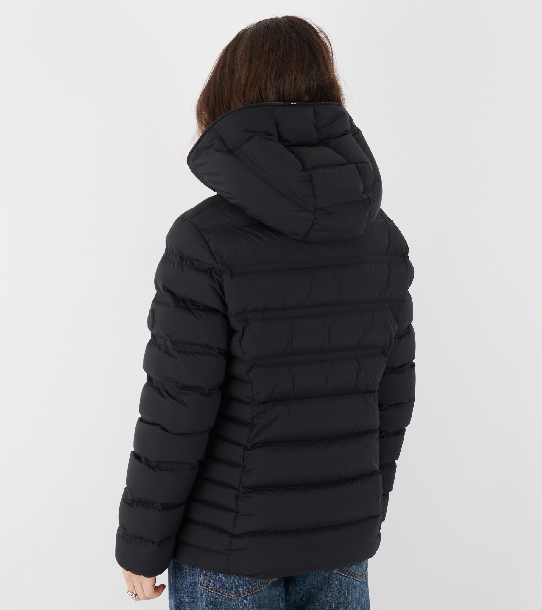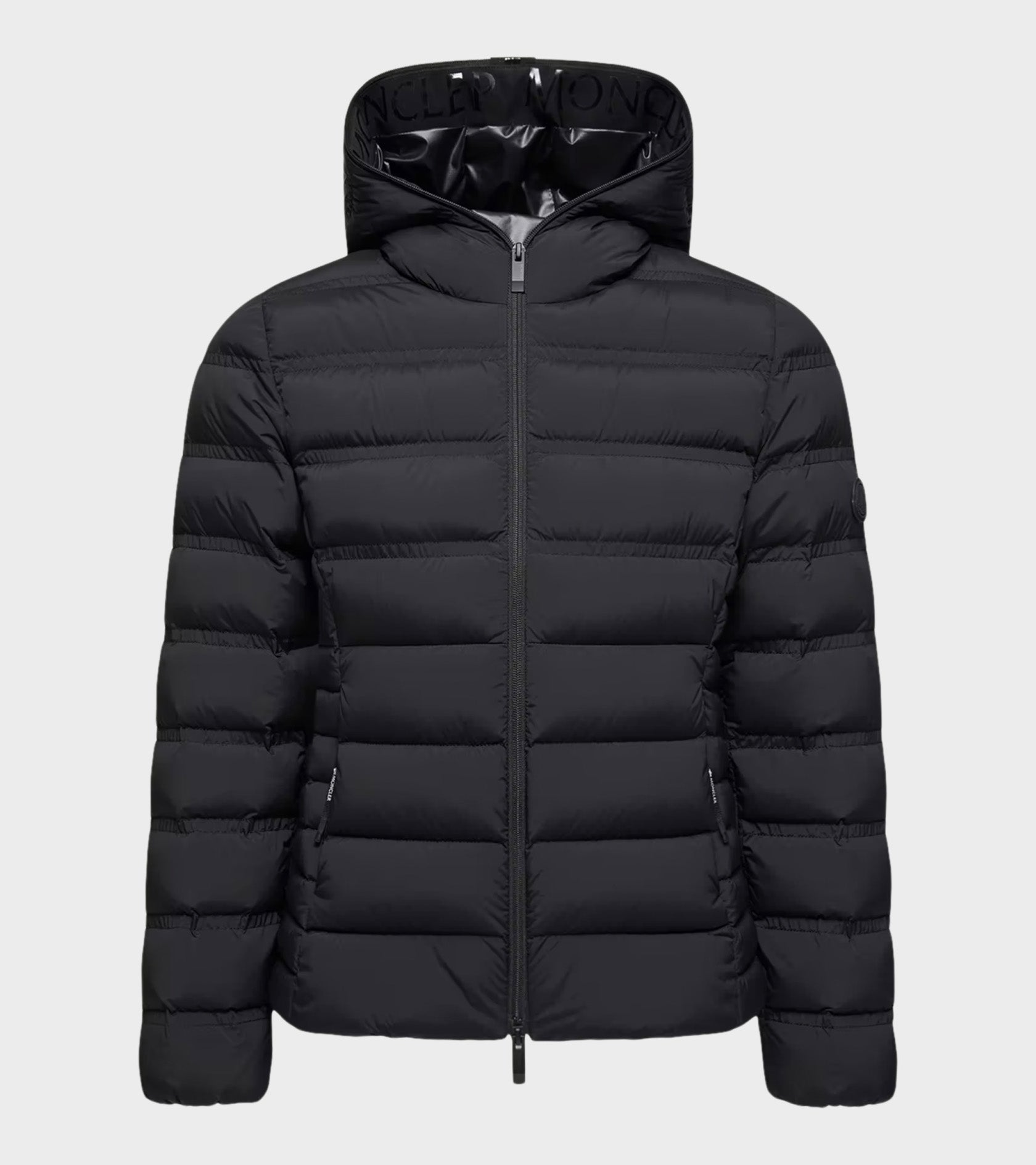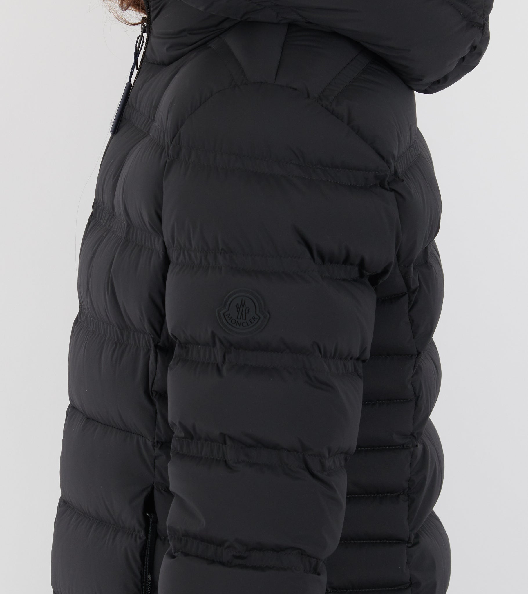 Sort dunjakke fra Moncler. Alete Hooded Down Jacket Black er fremstillet i vandafvisende nylon og er foret med bløde dun og fjer. Jakken har en klassisk hætte, en dobbeltgående lynlåslukning samt en diskret lynlåslomme i hver side. Jakken har sort logoskrift indvendigt langs hætten. På venstre ærme er det ikoniske logo i silikone.