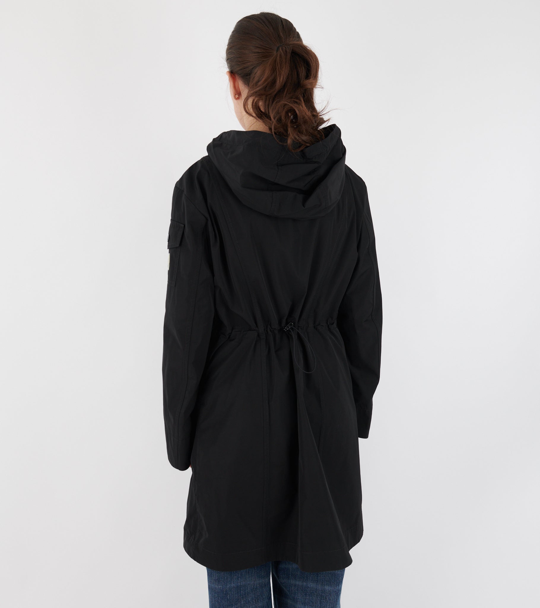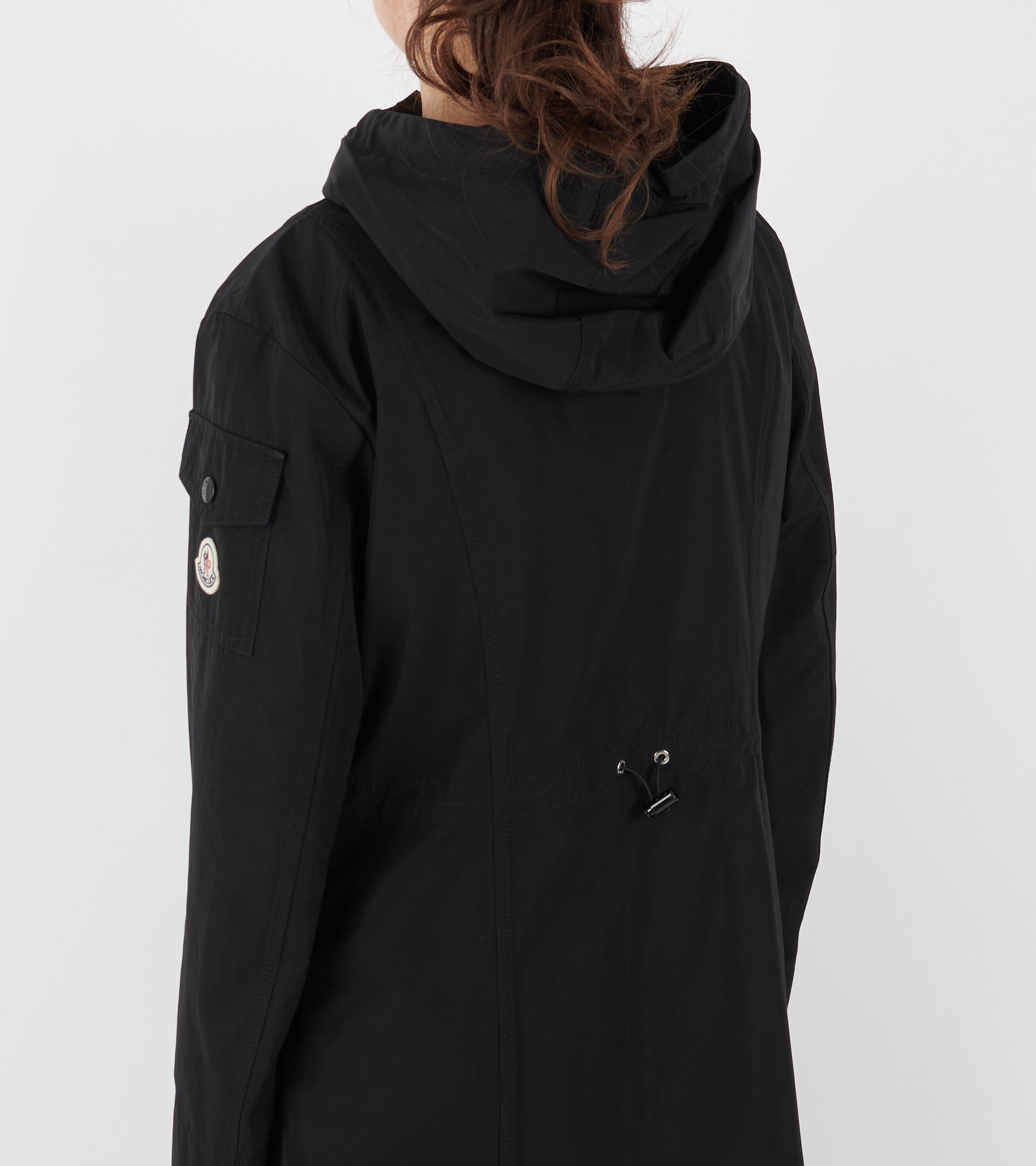 Sort frakke fra Moncler. Laerte Hooded Parka Coat har en klassisk hætte med snore, en dobbeltgående lynlåslukning og to lommer på fronten. På venstre ærme er en lomme samt det ikoniske logo i filt. Bagpå i taljen er en justerbar elastik, så taljen kan fremhæves yderligere hvis ønsket.