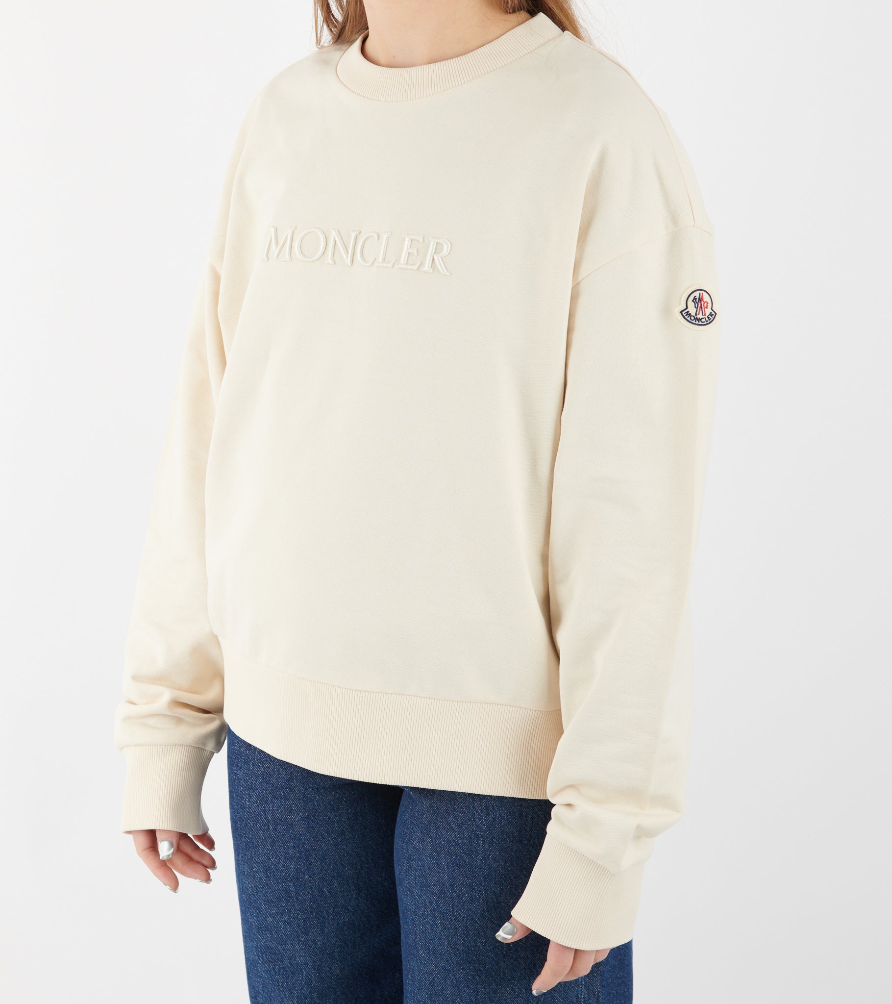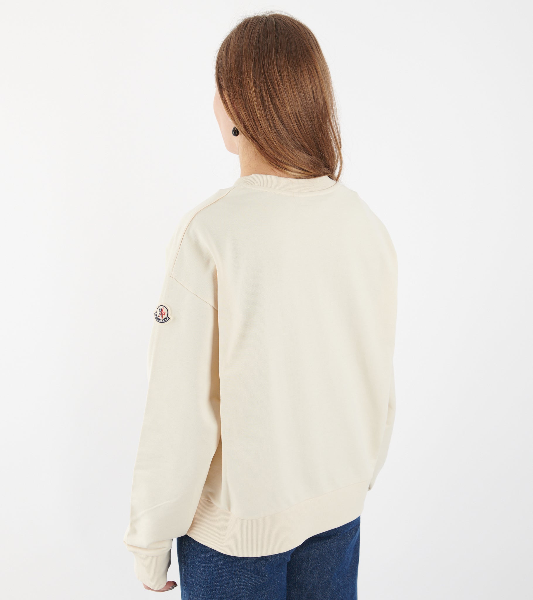 Råhvid sweatshirt fra Moncler. Denne sweatshirt har en rund hals, let sænkede skuldre og et broderet tone-i-tone logo på fronten. På venstre ærme er det ikoniske logo i filt.