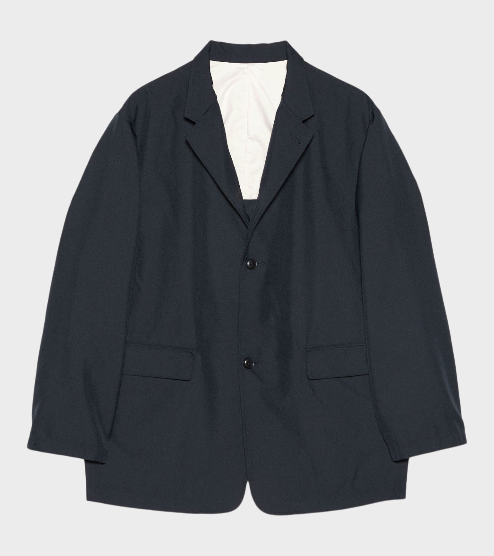Navy blazer i polyestertwill fra Nanamica. Blazeren har en klassisk reverskrave, to lommer samt en knaplukning på fronten.
