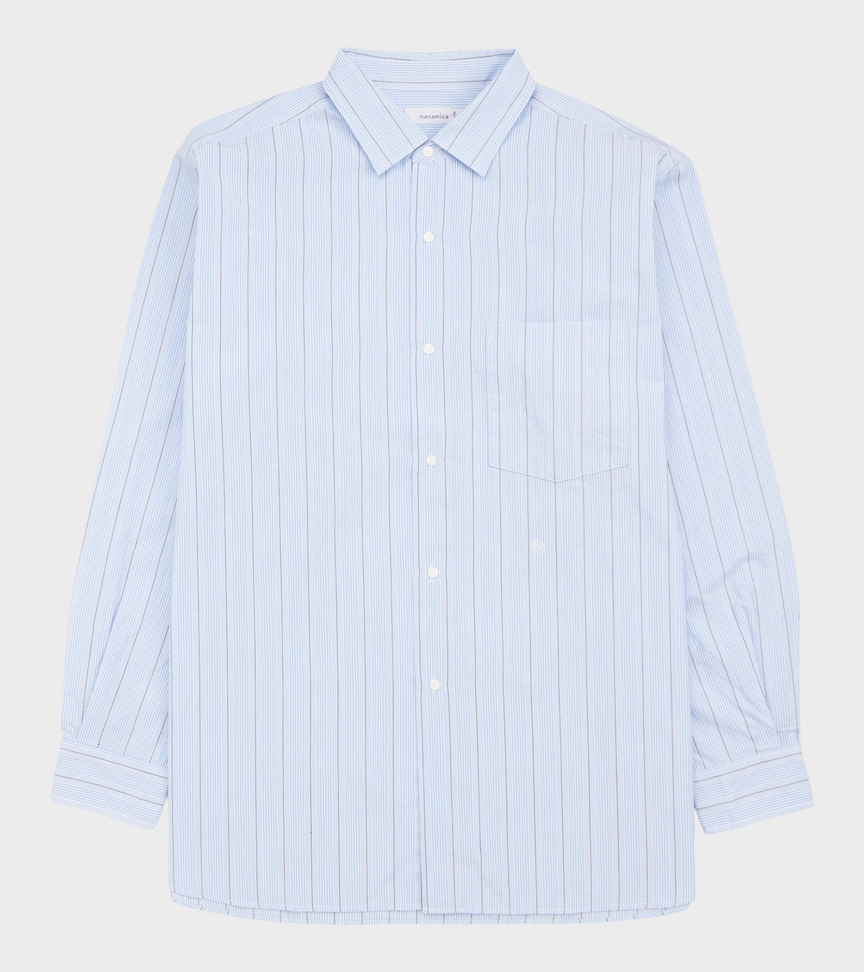Stribet lyseblå skjorte fra Nanamica. På fronten er et lille diskret broderet logo i hvid.