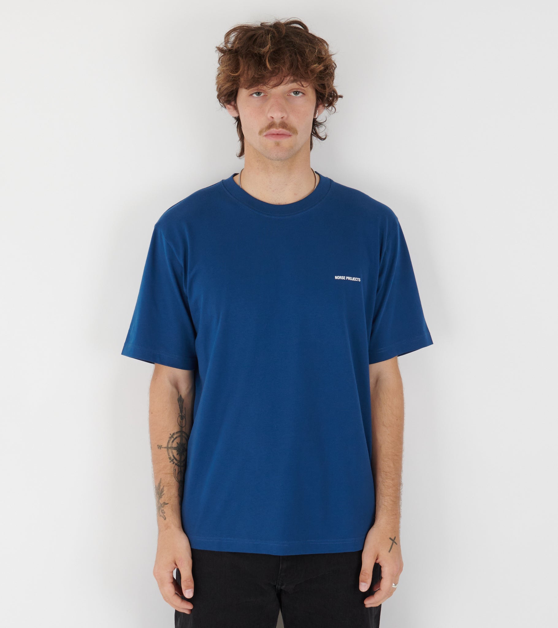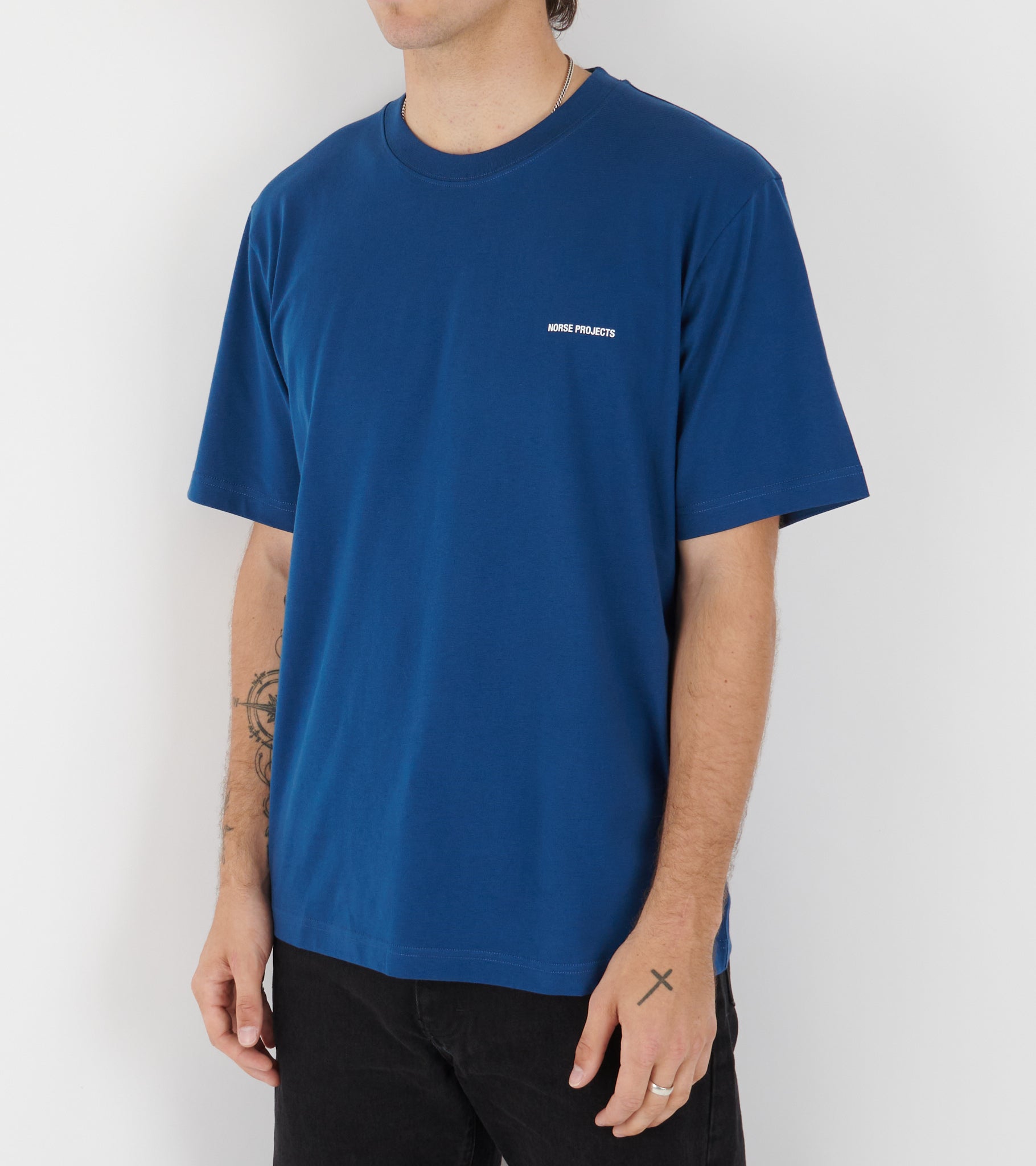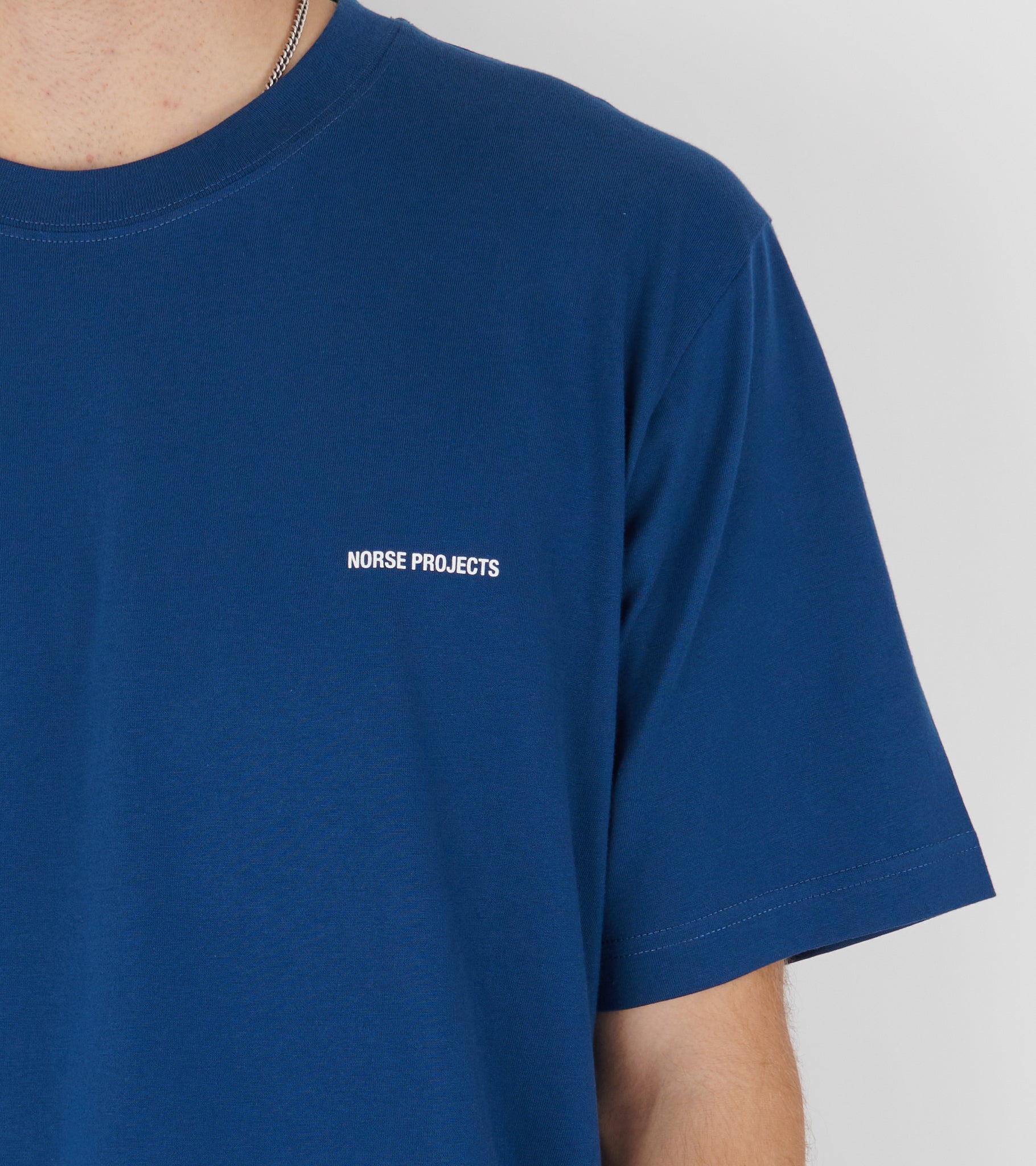 Blå t-shirt fra Norse Projects. Denne t-shirt er fremstillet i en økologisk bomuldskvalitet og har et lille hvidt logo på venstre bryst.