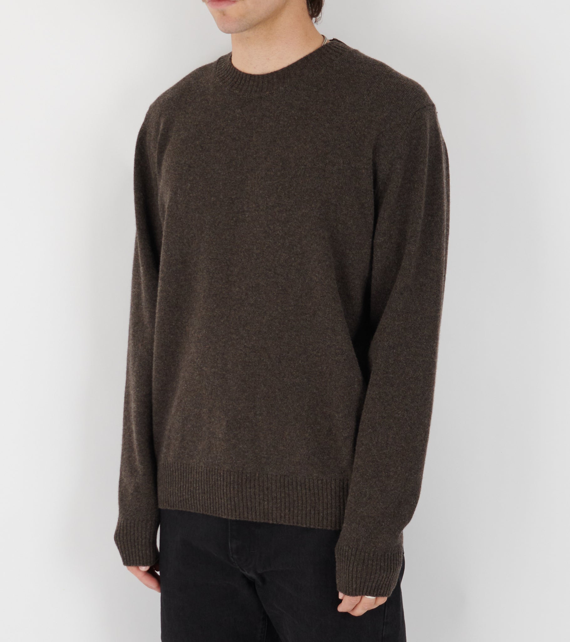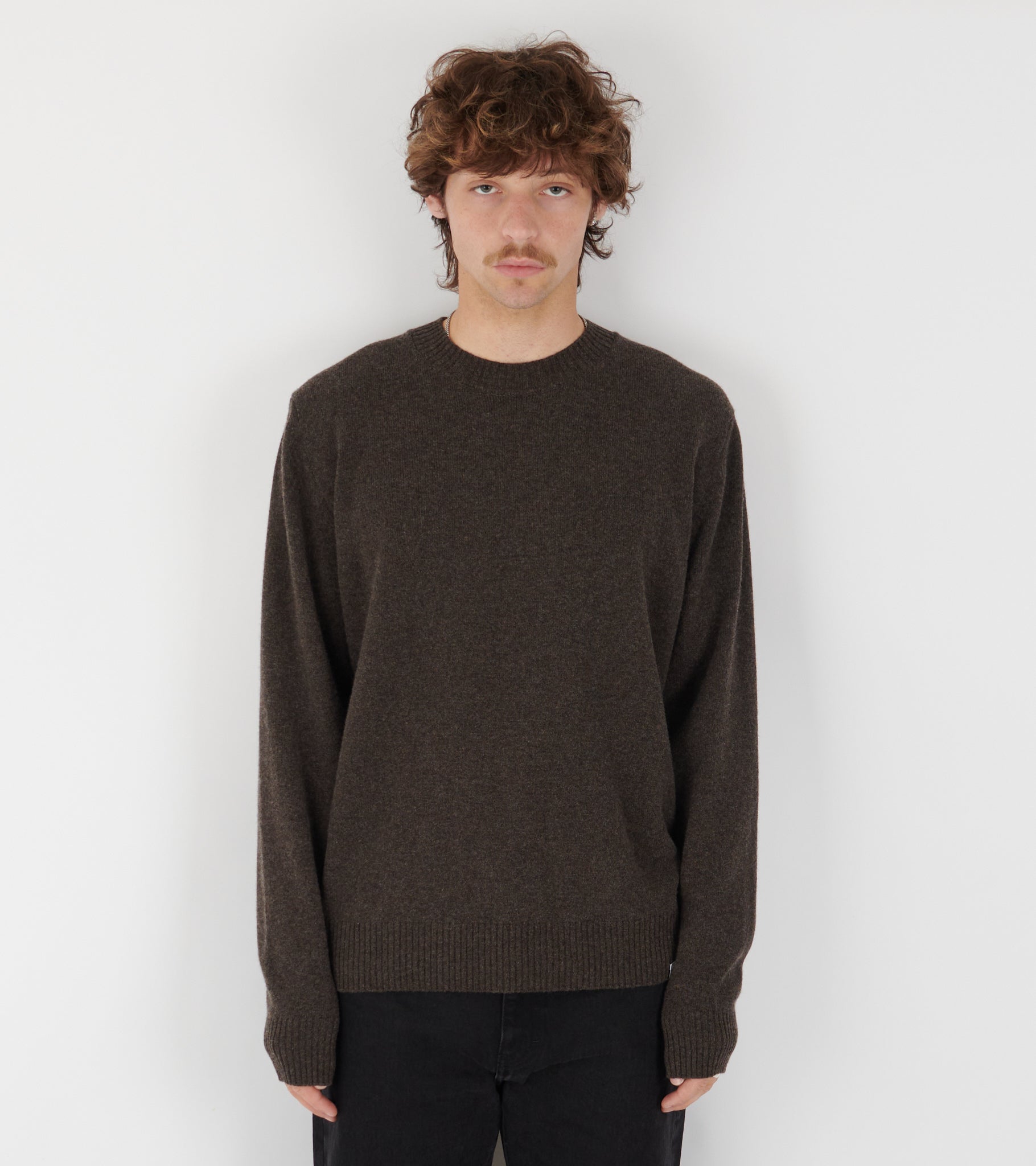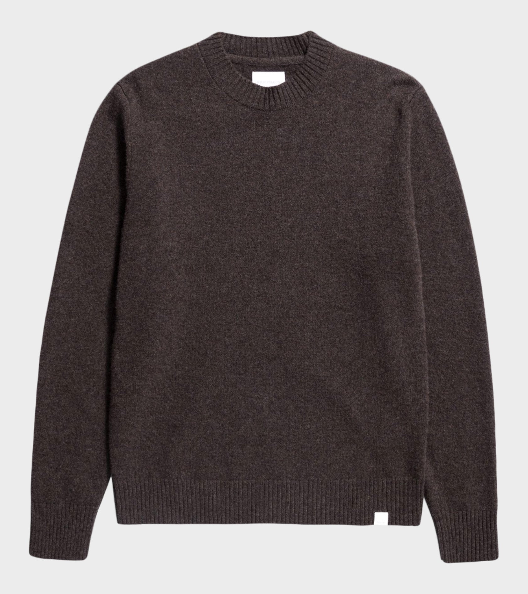 Brun meleret striksweater i uld med rib detaljer ved hals og håndled fra Norse Projects. Strikken er produceret i Italien af italiensk garn. Foran ses et påsyet lille hvidt logo.
