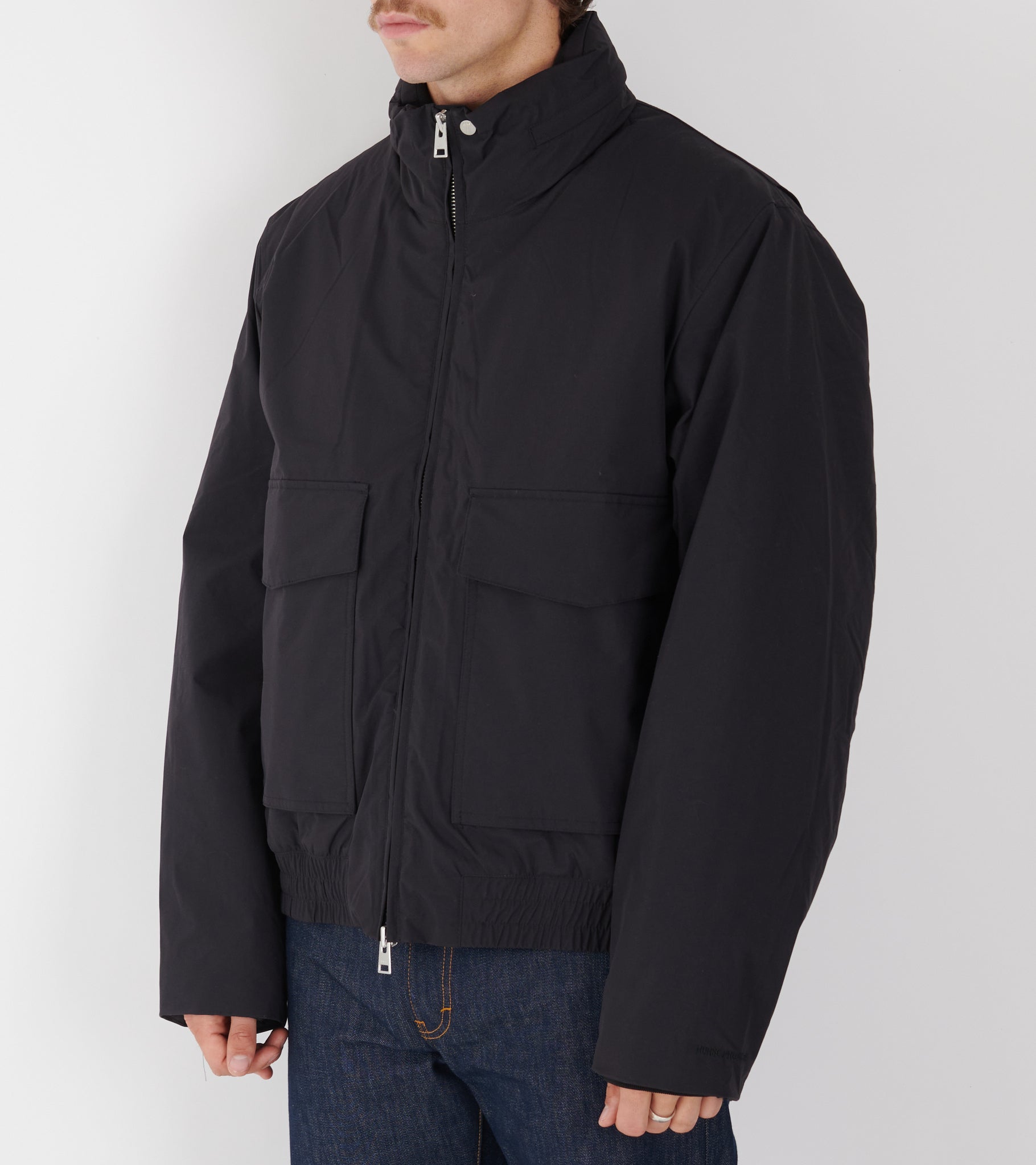 Sort vindtæt isoleret bomber jakke fra Norse Projects. Jakken har en skjult hætte i kraven.
