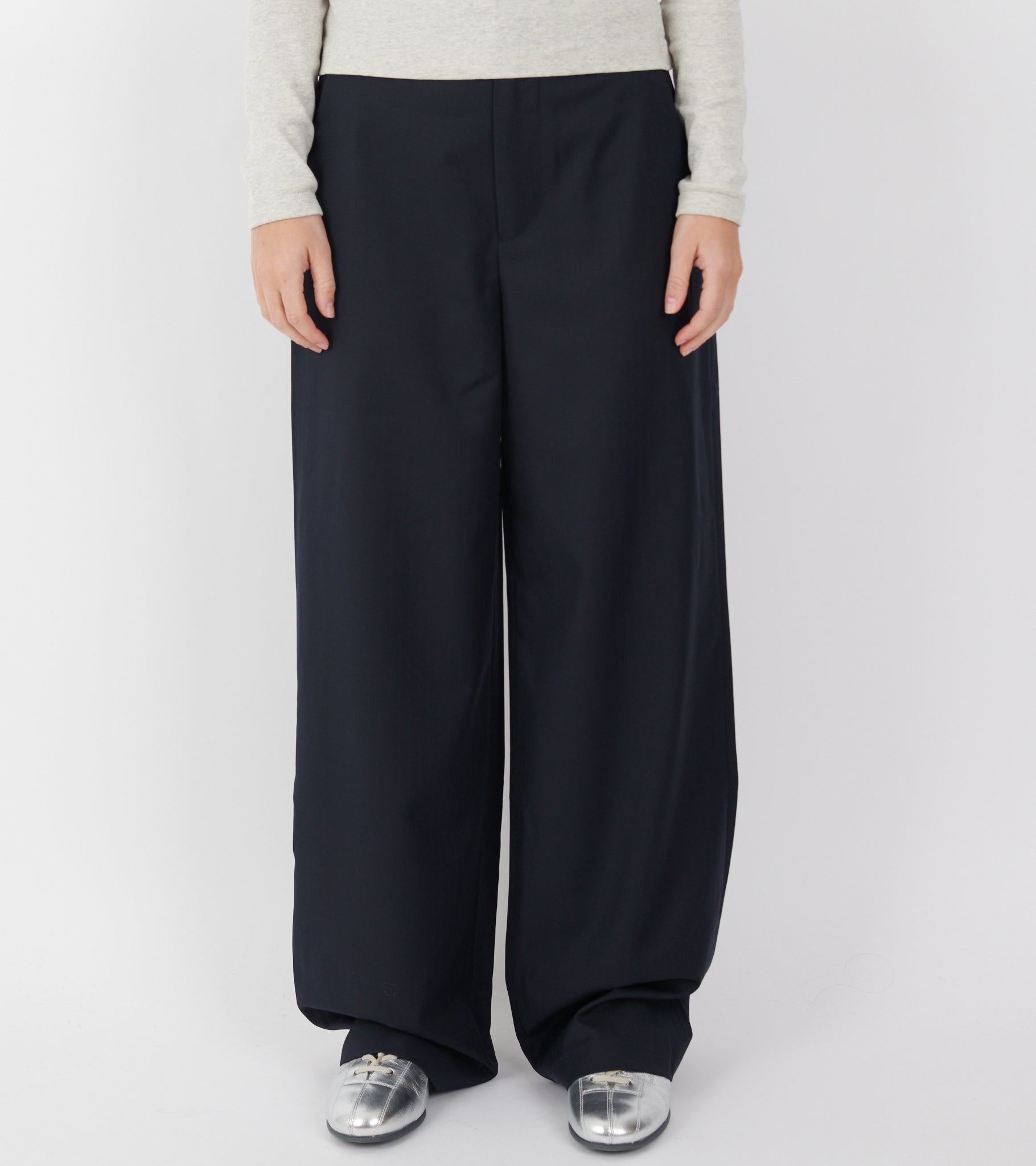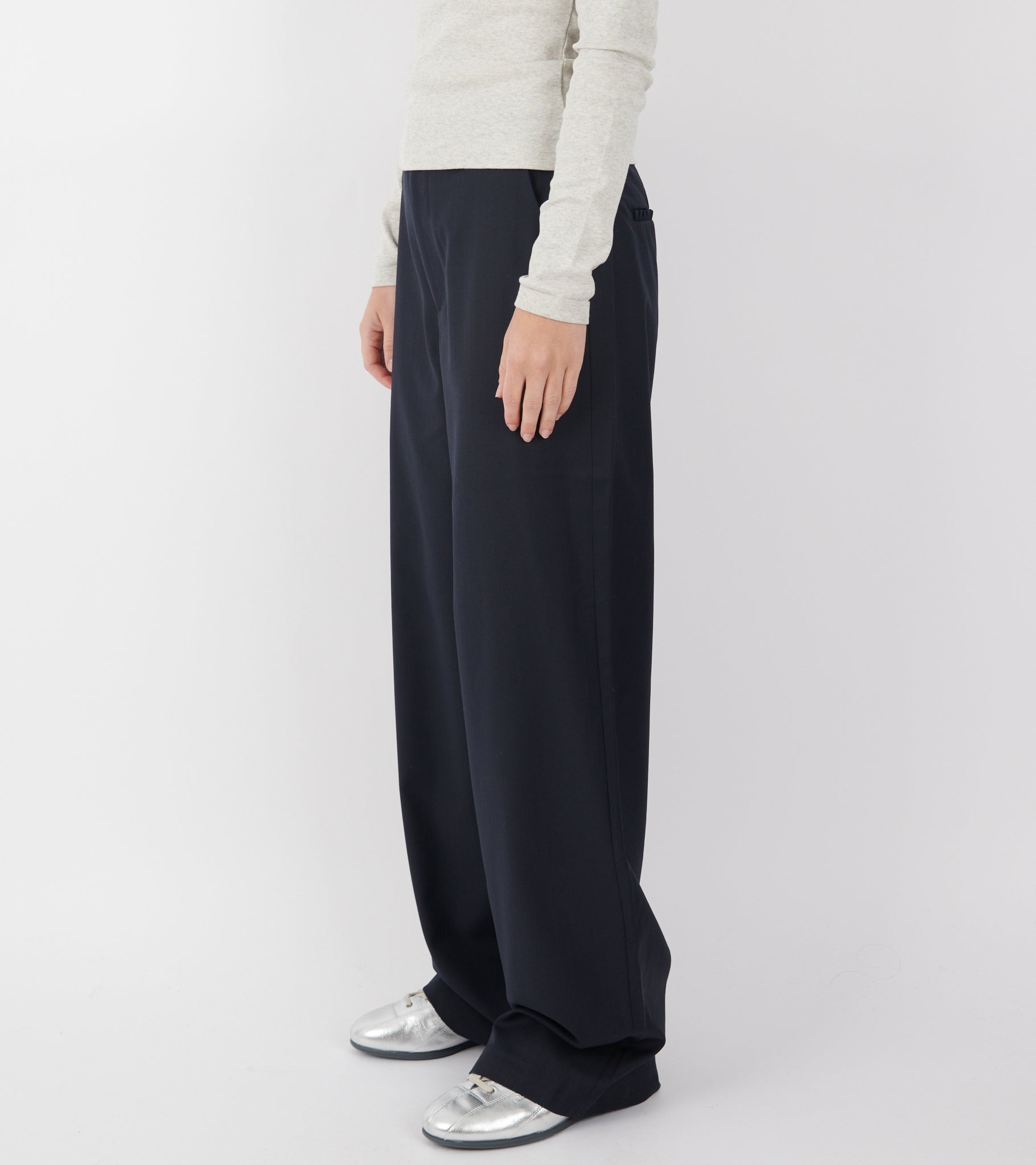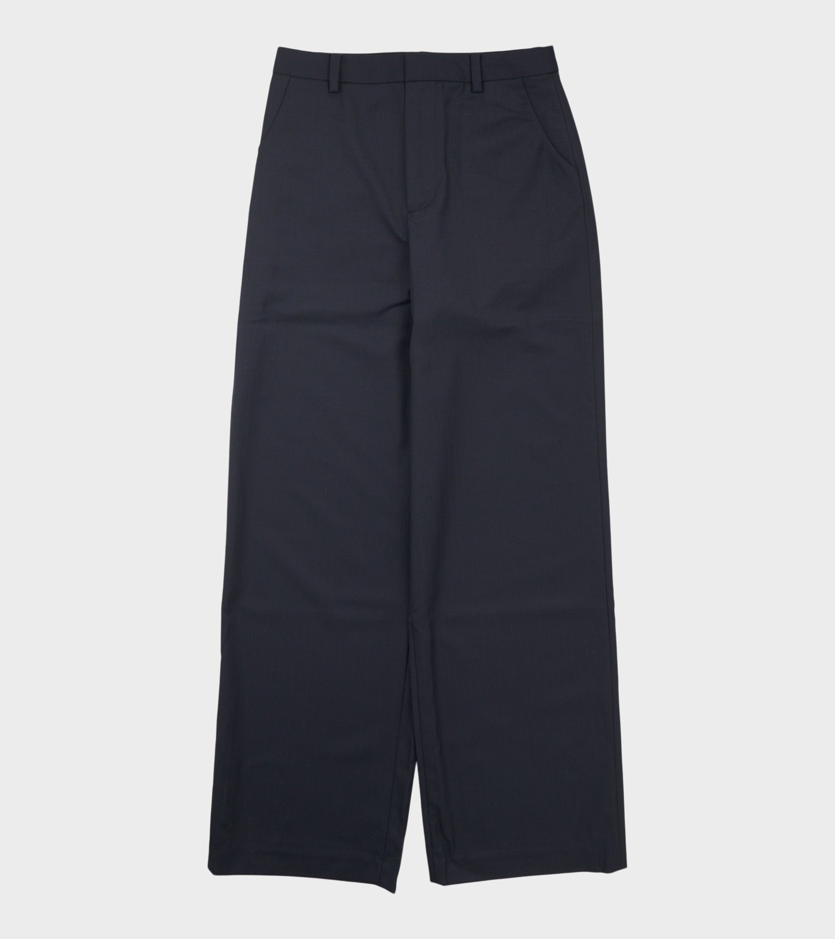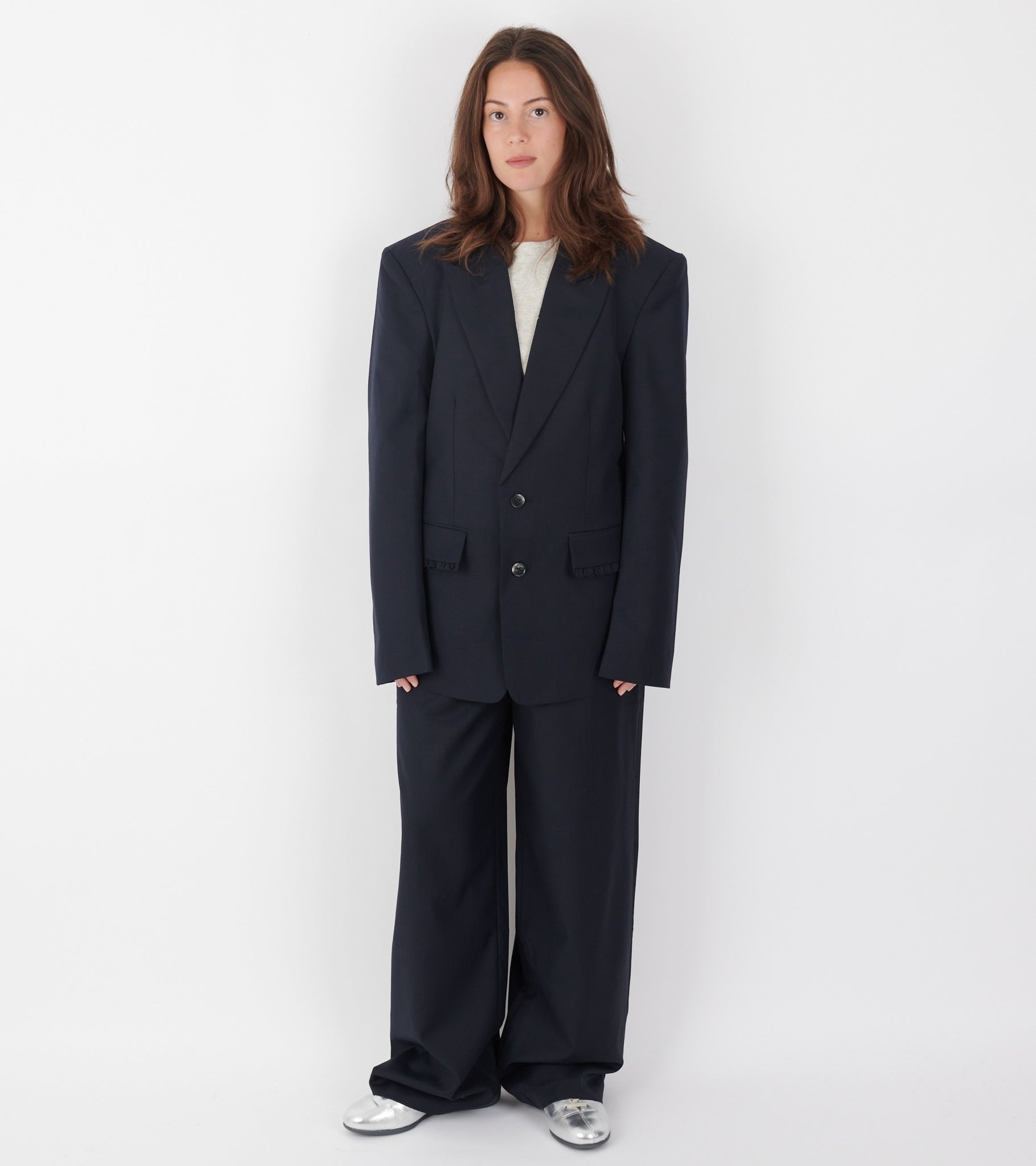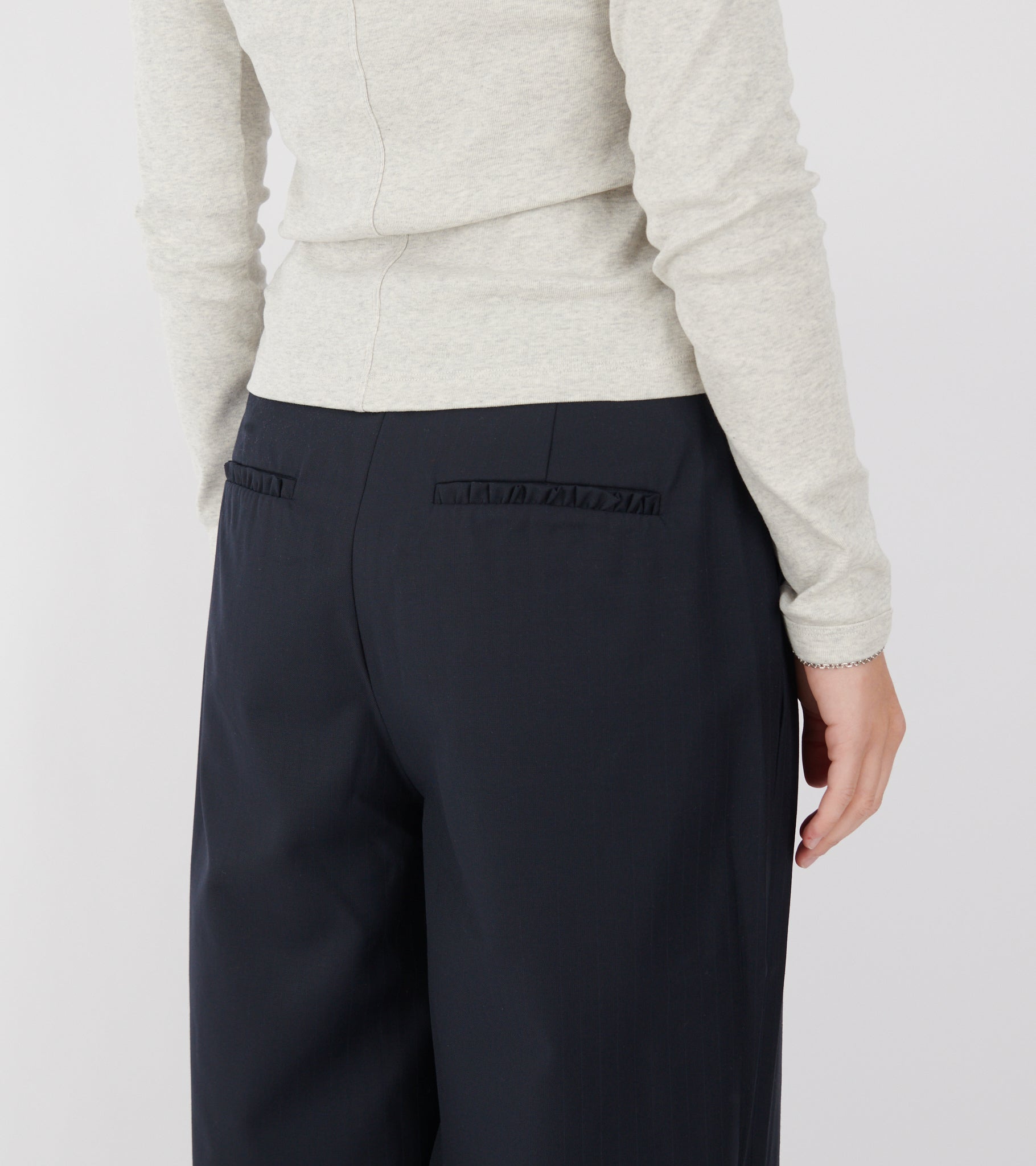 Navy bukser med pinstripes fra OperaSPORT. Helena Trousers har bæltestropper, en skrålomme i hver side og to stiklommer med flæsedetaljer bagpå. Bukserne har brede lige ben.