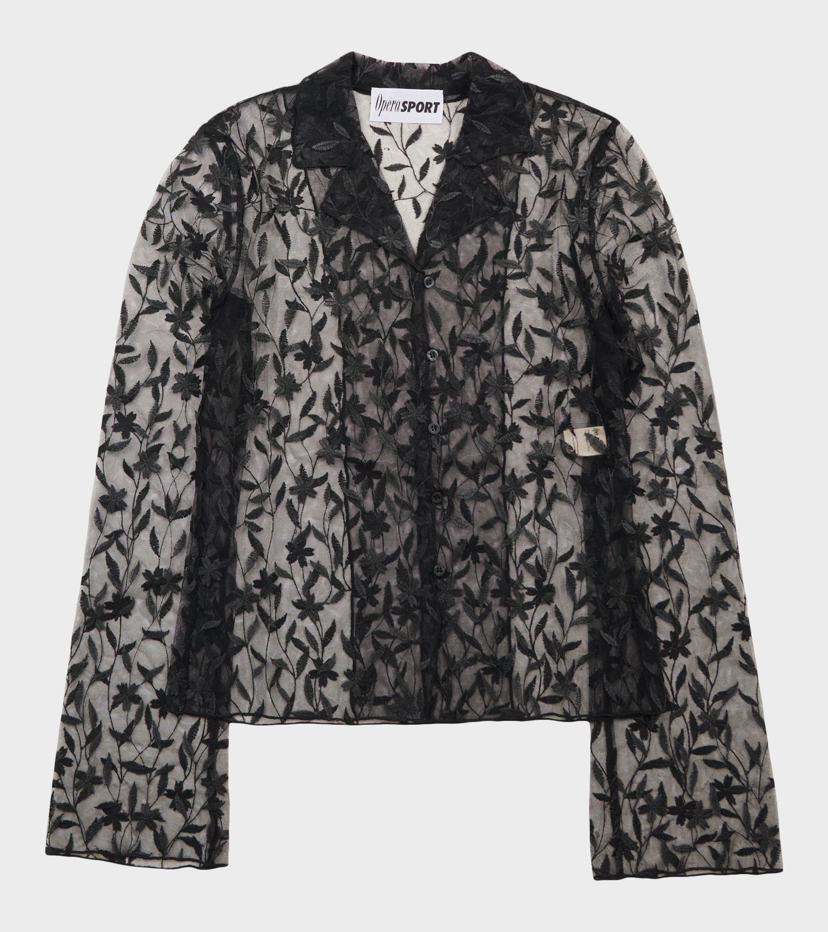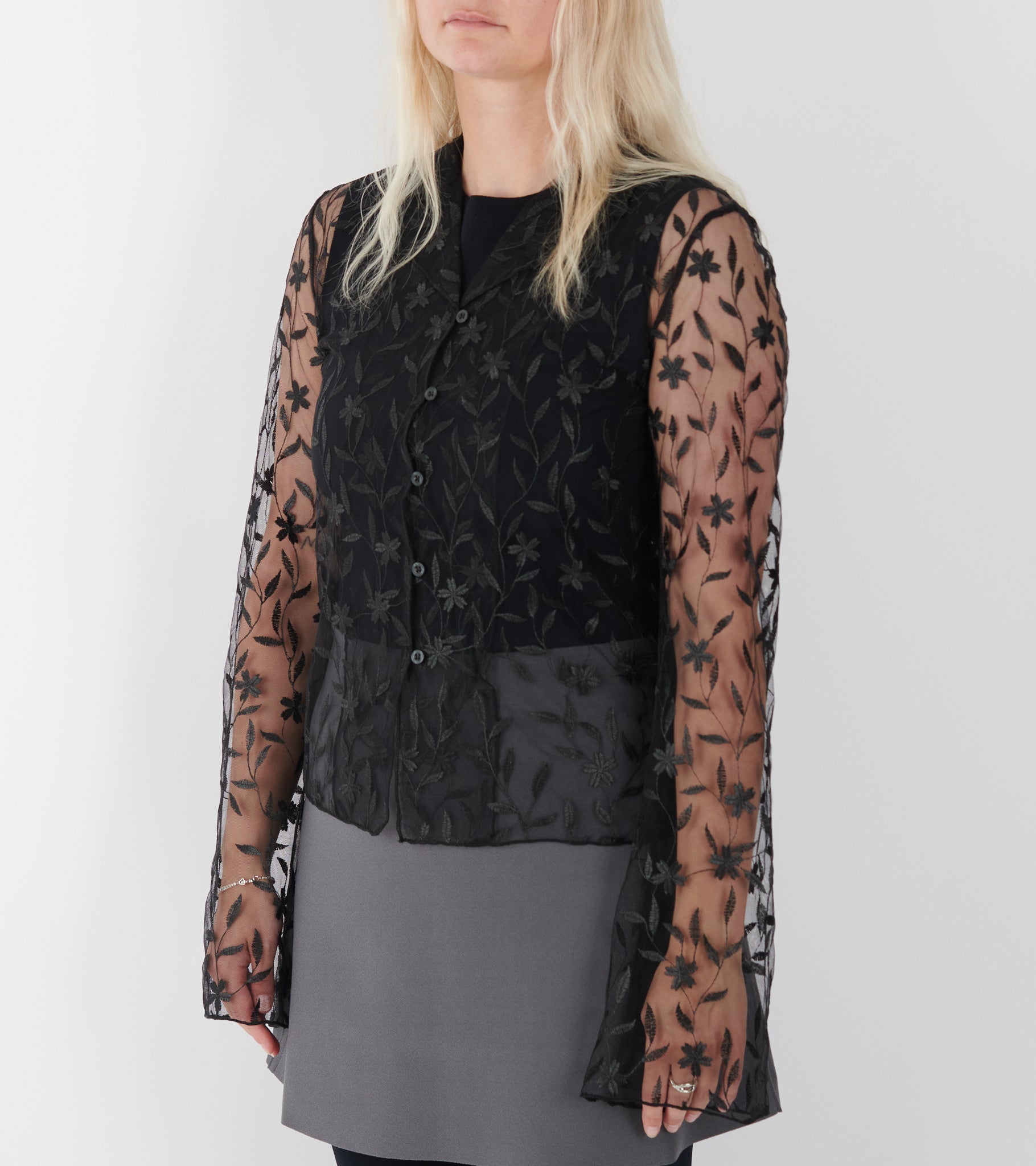 Sort blondeskjorte fra OperaSPORT. Flora Shirt er fremstillet i genanvendt polyester og har all-over blonder med blomster. Skjorten har en åben krave, en knaplukning og ekstra lange ærmer.