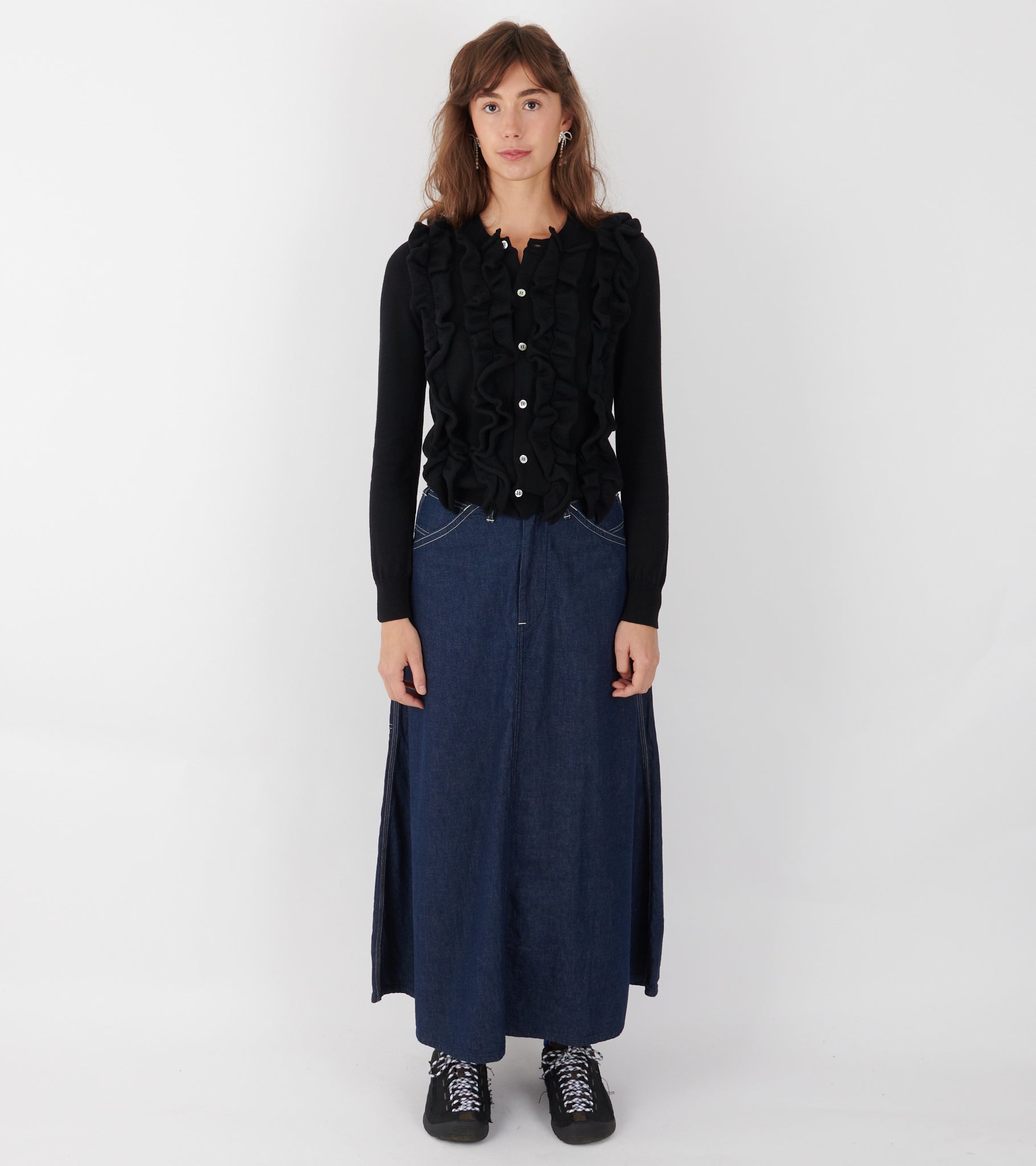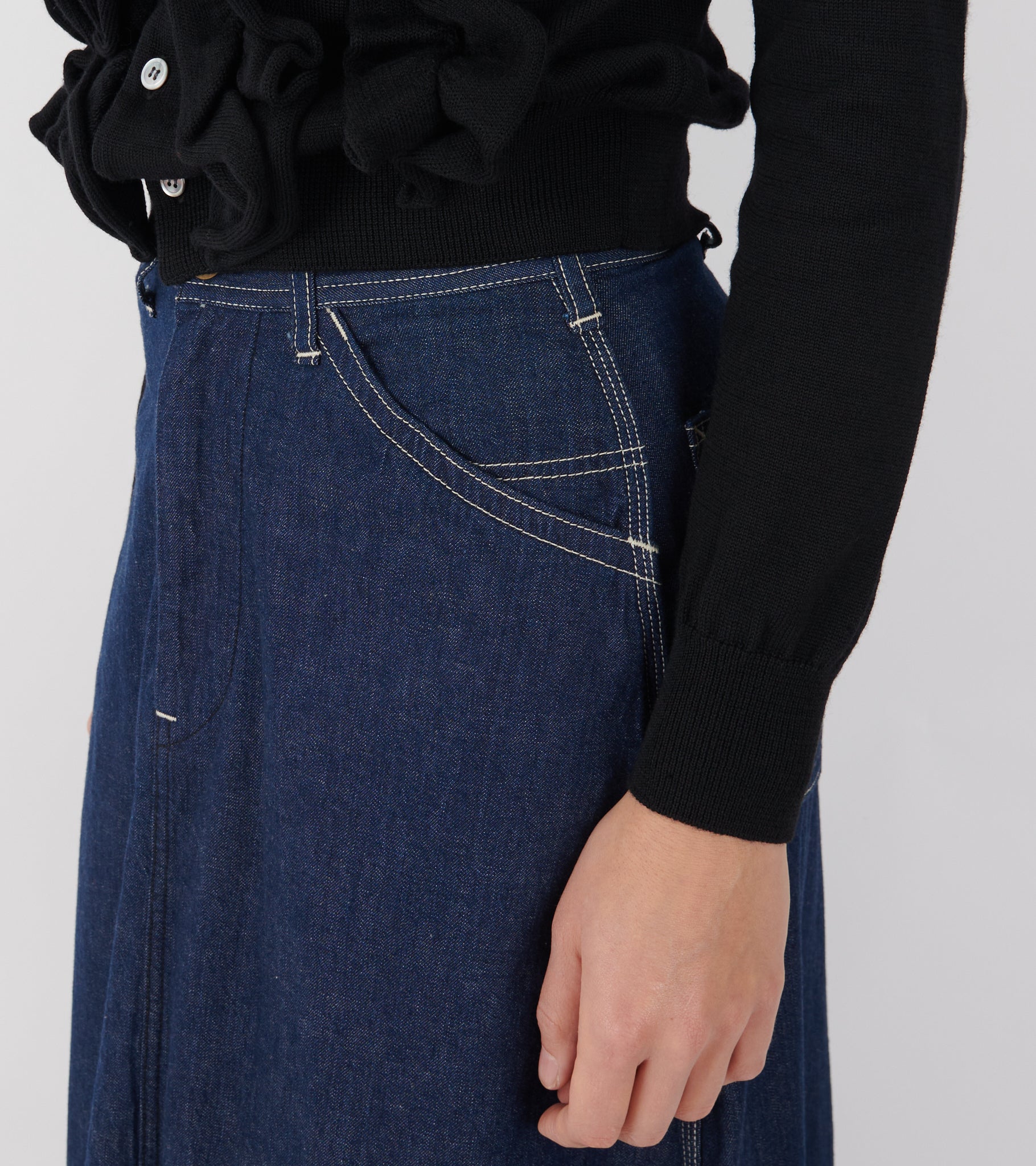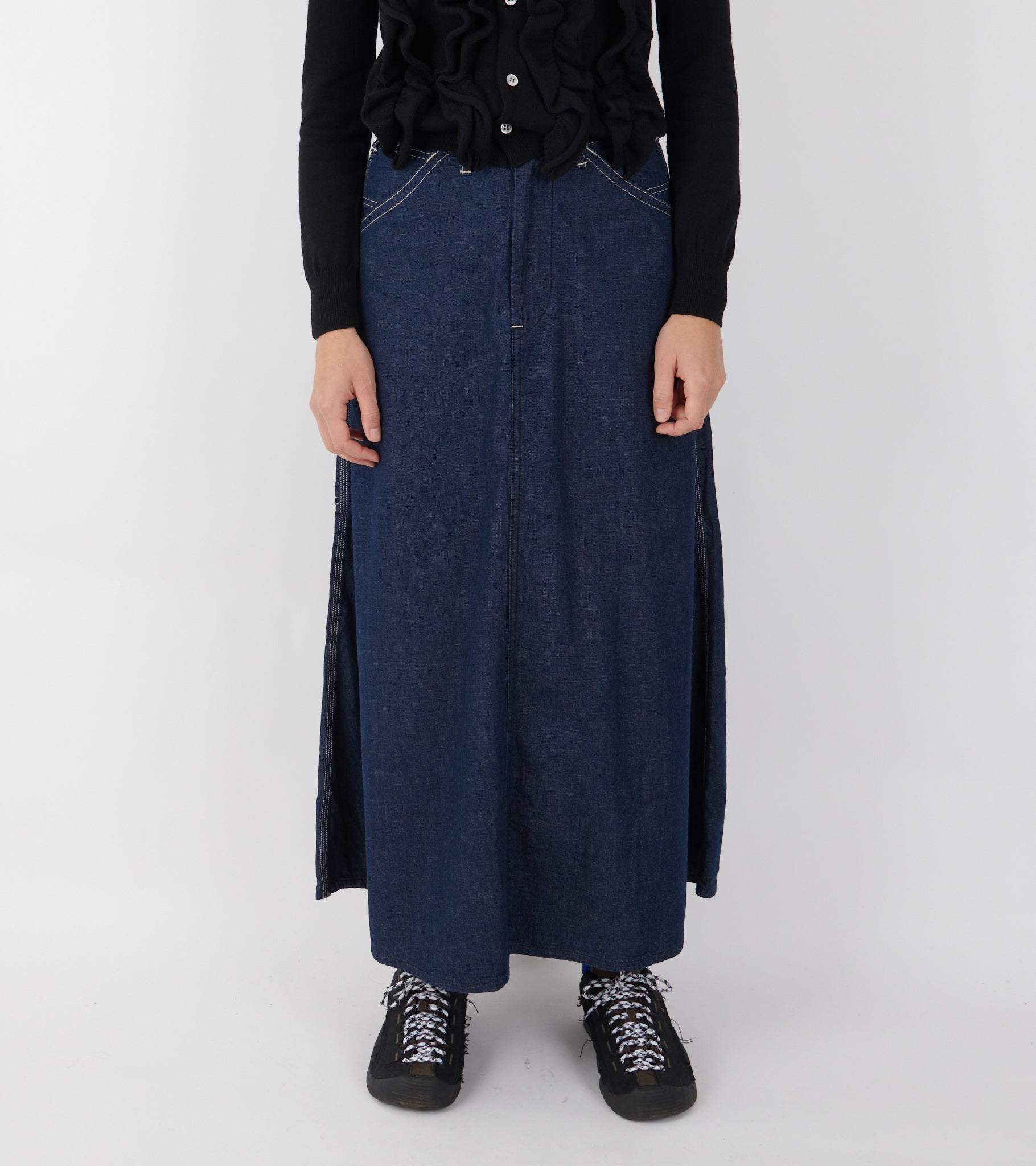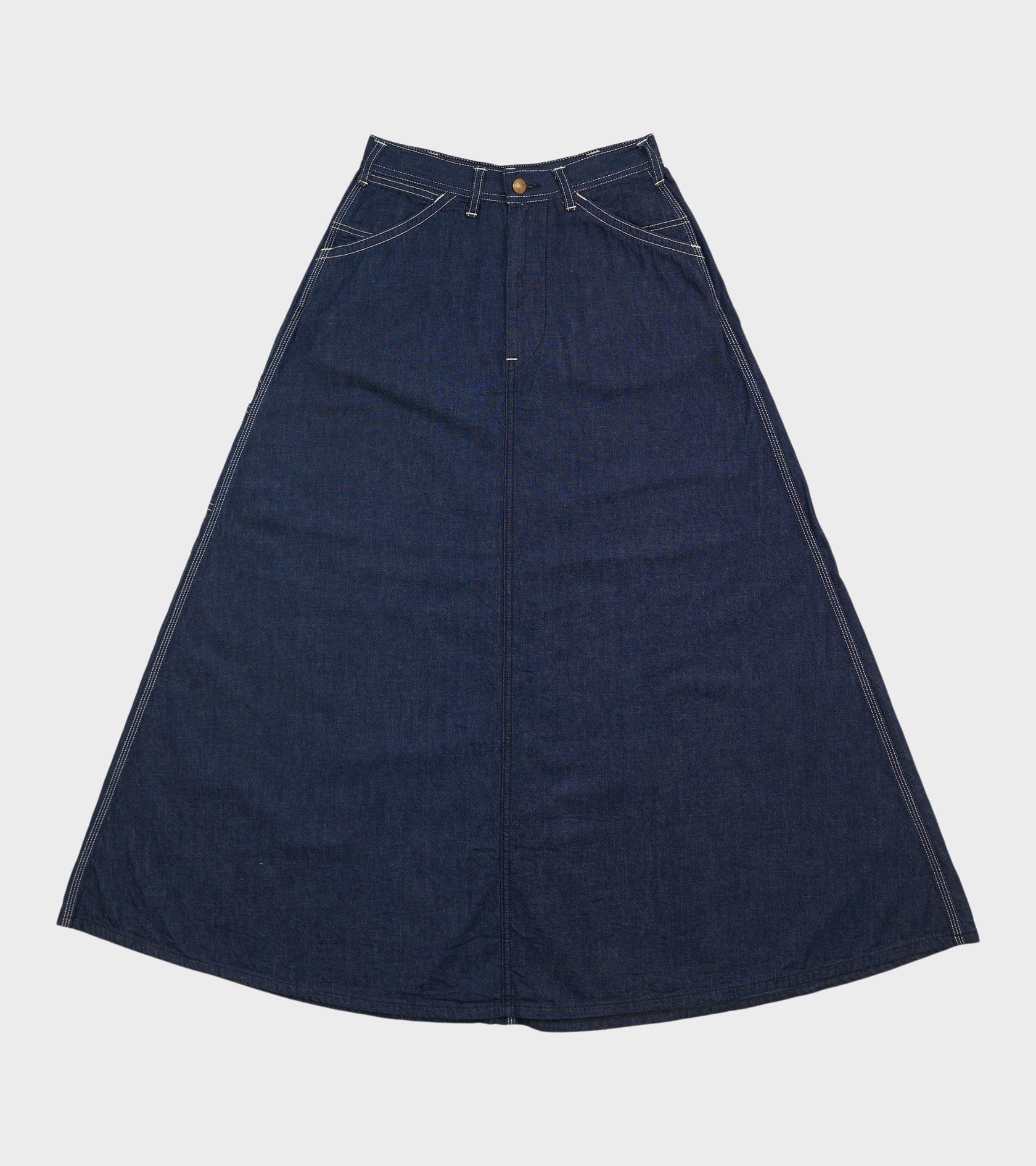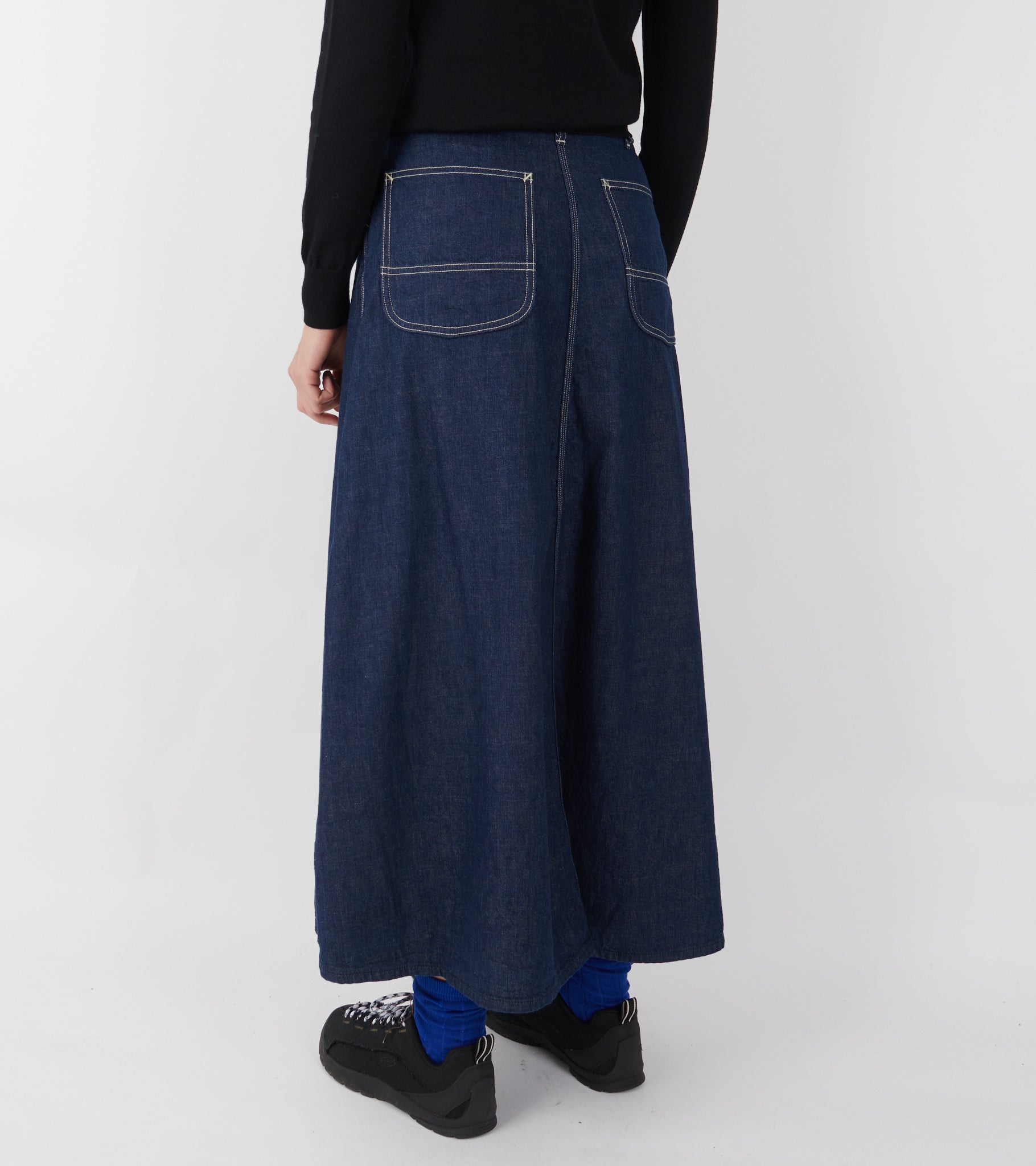 Mørkeblå denimnederdel i bomuld. Nederdelen har kontrast farvet syninger og lynlås lukning. Den har sidelommer og to baglommer.